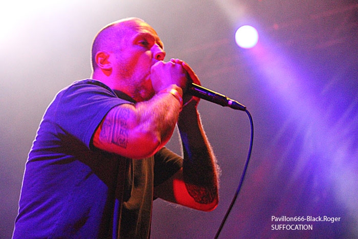 Que de monde, Frank Mullen est ses sbires auraient pu passer sur la grande scène finalement, mais bon ! Suffocation laisse trainer toujours derrière lui des rumeurs de split, de « stand-by », alors les voir aujourd’hui avec sous leur bras leur dernier « méfait » en date « Pinacle Of Bedlam » cela ne se refuse pas. Une nouvelle violence et une nouvelle technicité se font jour, c’est la première remarque de ce concert. Frank nous gratifie toujours de ce chant caverneux mais aux dérapages « coreux », sa marque indélébile. Les guitares déchirent et le duo basse-batterie nous plombe la tête de façon magistrale, on ne risque pas de s’endormir. Le groupe commence avec des anciens titres, « Catatonia » et « Effigy Of The Forgotten » de 1991 mais n’oublie pas les petits nouveaux lourds et percutants que sont « Purgatorial Punishment » et « My Demise » par exemple. Mais ce soir tout est bon à prendre et participer à un set de Suffocation en pleine possession de ses moyens, c’est toujours un régal, ce qui est le cas ce soir devant un public déchaîné.