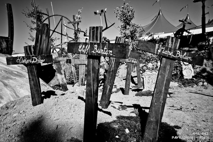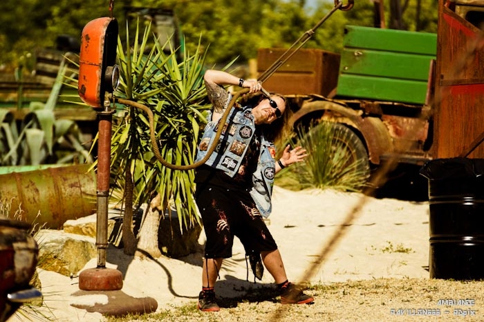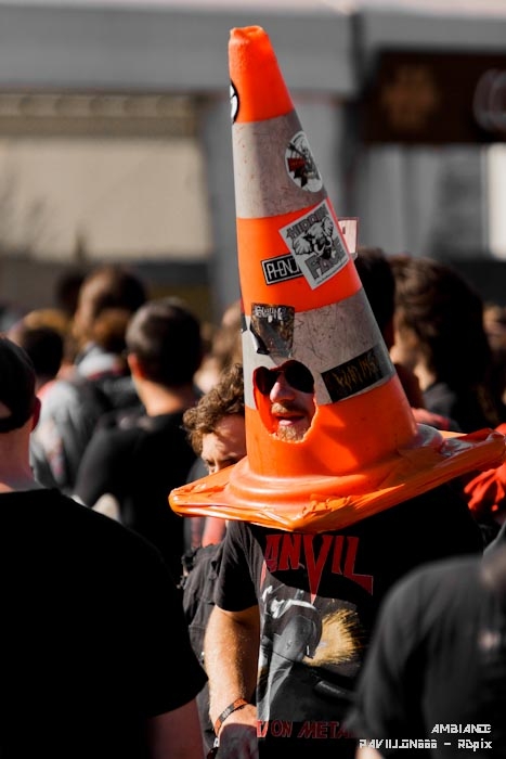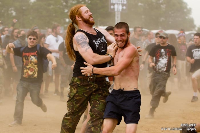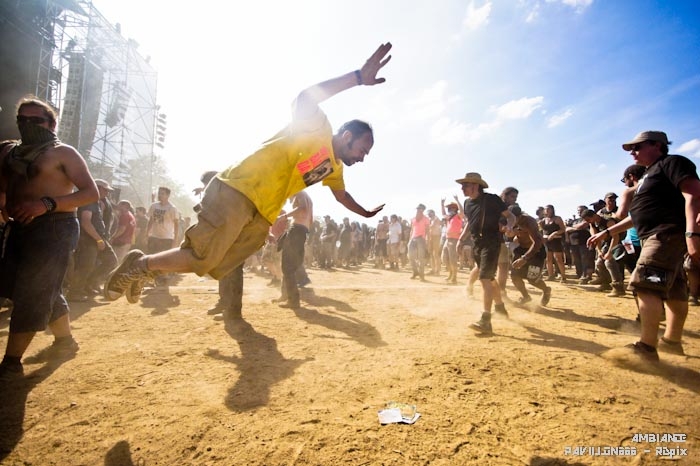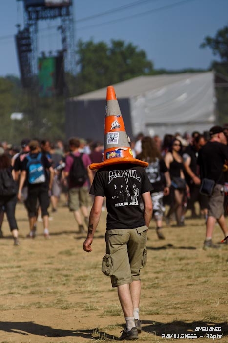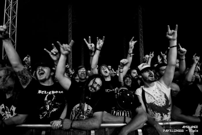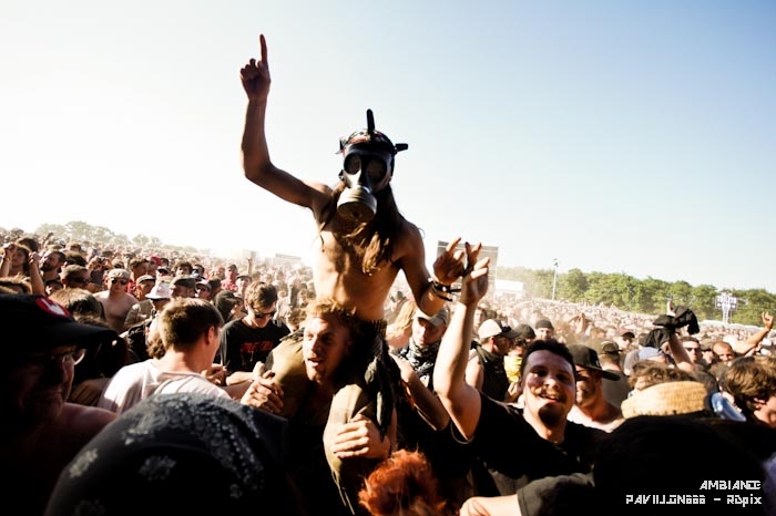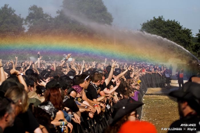 Le camping n’a pas évolué énormément. Les repères de couleurs étaient toujours présents. Des spots éclairaient constamment les allées de nuit. Pratique pour ceux qui installaient leur bivouac dans la pénombre ou qui titubaient près des fossés. Moins pratique quand on marchait en direction de ces lumières, celles-ci était sacrément éblouissantes et trébucher dans un trou devenait fréquent dans ces conditions. Les toilettes du camping étaient du même style que les autres années. Des toilettes chimiques dont l’odeur vous retourne l’estomac dès le petit matin. D’autres toilettes sèches installées après la passerelle faisant le lien entre le Metalcorner et la Hell City semblaient avoir bien plus de fans vu la file d’attente s’étendant à perte de vue. Ca devait rappeler au gens leur sortie à Disneyland un jour férié ou leur course au supermarché le samedi. La troisième solution, Ô combien plus pratique, consistait à faire son affaire dans les vignes. Armé de son rouleau de papier, le metaleux pouvait déféquer sans faire 1h de queue et tout ça dans un paysage bien plus agréable. Attention tout de même où vous mettez les pieds car le terrain est miné dès le premier jour. Si vous optez pour la 3eme solution, n’oubliez pas de goûter la cuvée 2014 en revenant l’année suivant car c’est aussi un peu la votre. Les douches étaient également fort peu nombreuses. Et c’était vite 1h30 de queue qui vous attendait si vous n’étiez pas levé dès 7h du matin. Le problème pourrait être réglé si les douches étaient accessibles 24h/24. L’attente permettait néanmoins de rencontrer des gens sympas et de discuter entre crados en attendant d’accéder à une douche. Une fois sorti de là, on était en droit de se demander si nous n’étions pas plus sale qu’en y rentrant vu la crasse qui s’y accumulait. Et je ne parle pas des douches qui avaient été visitées par des personnes à qui ne convenait aucune des 3 idées de toilettes citées plus haut. C’était juste pour râler parce que j’aime bien mais en fait rien de tout ça n’était vraiment gênant. Le véritable point à améliorer dans le camping était le manque d’eau potable. Un vrai souci de ce coté là. Pas la moindre fontaine sur tous ces hectares de camping. Et comment on fait si on aime son pastis un tout petit peu dilué ? On m’a donné la solution : le diluer avec du ricard. Mais pour ceux qui, comme moi, ont des soucis de calculs rénaux dès qu’ils n’avalent pas 3 litres de flotte par jour ? Beaucoup d’efforts ont été fait au niveau de la circulation sur le lieu des concerts. Je pense notamment à l’accès à la Warzone catastrophique de l’édition 2013. Sans être franchement pratique, l’arrivée devant la scène était nettement moins embouteillée cette année. Les stands de restauration et les bars étaient judicieusement répartis. Et les points d’eau disséminés dans tout le festival étaient plus que bienvenus bien que peu nombreux. Ce qui créait des embouteillages. Je pense notamment à celui sur la route de la Main Stage à la Warzone. L’accès à la tente Altar/Temple pouvait en dérouter plus d’un a cause du monde s’agglutinait à l’entrée de la tente sans s’engouffrer dedans. Ce qui faisait croire à beaucoup qu’une foule trop grande s’était amassé. Que nenni. Il suffisait de ne pas être fainéant et de faire un peu le tour pour arriver au milieu des deux scènes. Là, il y avait largement assez de place pour se faufiler sans même avoir à bousculer les gens jusqu’au devant de la fosse. Le véritable souci à cet endroit était l’accès pour le pit photographe. Autant l’accès au pit de la Temple ne pausait aucun problème car situé juste au bord de la tente, autant celui de la Altar relevait du parcours du combattant pour y accéder à l’heure de certains groupes. En effet, la foule dense était collée aux barrières des toilettes, elles mêmes collées sur le flanc de la Altar. Et pour se frayer un chemin, il fallait jouer du coude de façon assez franche. Sans conter qu’on y croisait les photographes et les festivaliers qui sortaient en sens inverse. Tant et si bien que parfois je référais accéder par l’autre coté au devant de la scène et traverser les pogos (avec tout mon matos). Tout ça pour arriver à l’entrée de l’espace réservé aux excités du déclencheur. Un point fort apprécié par beaucoup était la présence de la lance à incendie des pompiers locaux. Elle a été déployée le dimanche devant les deux scènes principales. Les pompiers ont arrosé allègrement les festivaliers sous un soleil lourd comme plomb. Je suis persuadé que ça à ravivé plus d’un festivalier proche de l’insolation. Bonne initiative et qui a permis à certains photographes, placés au bon endroit au bon moment, de ramener quelques clichés réussis d’arc en ciel au dessus de la foule en ébullition. Autre point sympa à noter était l’aménagement de l’espace VIP/Presse. Les décors du style désert avec vieilles carcasses de voitures rouillées et un vieux rade délabré collaient parfaitement avec la sécheresse ambiante. On y trouvais aussi d’autres décors comme une tente militaire soviétique avec un helico crashé dedans. Mais aussi une piste bizarre évoquant une route délabrée et déformée sur ses cotés qui s’avérait être en fait un skatepark déguisé quand on y regardait de plus près. Pour finir, un petit coup de gueule pour râler contre les gens qui n’arrêtent pas de râler. Oui, il faisait très chaud. Oui, on avait tous de la poussière dans notre bière, dans les narines et jusqu’au fond des poumons. Mais ces gens qui se plaignent se seraient plaint aussi s’il avait plu. Et peu d’entre eux se souviennent de la mousson de 3 jours qui s’était abattu sur les festivaliers en ce lieu en l’an de grâce 2007. Ceux qui étaient là se souviennent d