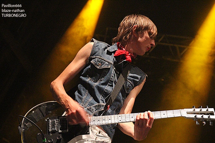 La curiosité de la journée viendra en dernier sur scène. C’est naturellement TURBONEGRO qui est attendu par nombre de ses fans en blousons de jean où Torbonegro est brodé et en bonnet de marin, qui se présente à nous en cette fin de soirée du Dimanche 10 Août.