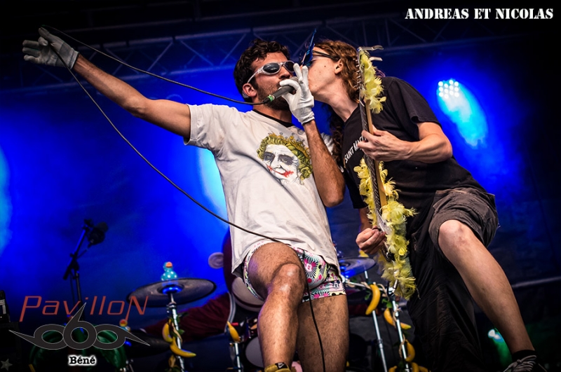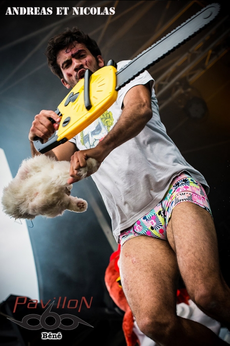 On change radicalement de registre maintenant puisque c’est Andréas et Nicolas qui assurent la suite. Des bananes partout, un poupon pendu par le pied, des palmiers et tout un tas d’accessoires ont envahis la scène. Tout comme au Betiz’fest les comparses débarquent en peignoir avec des masques d’Iron Man blancs.