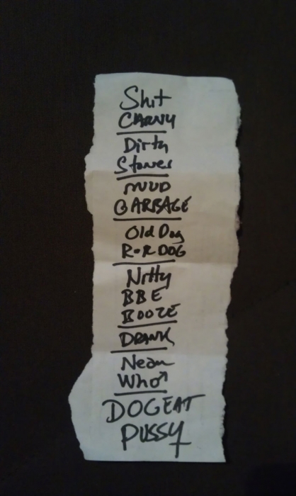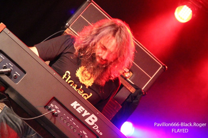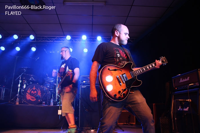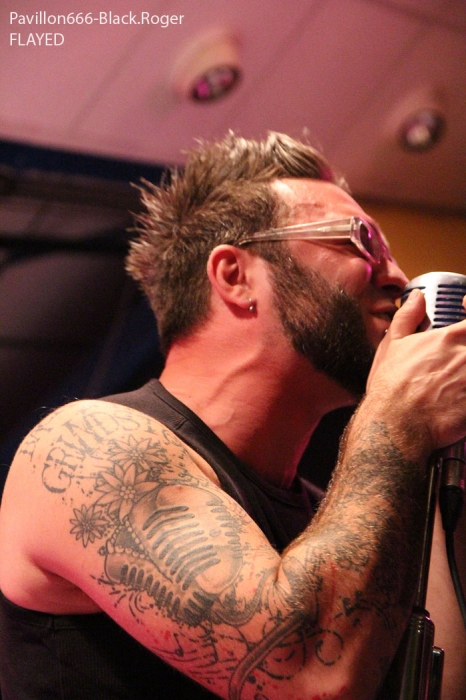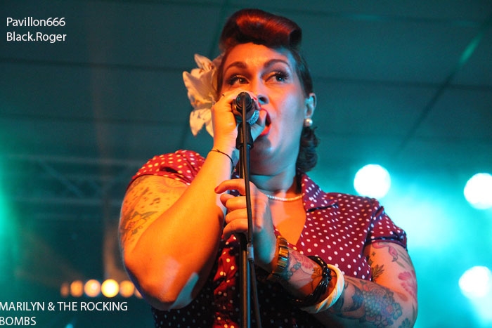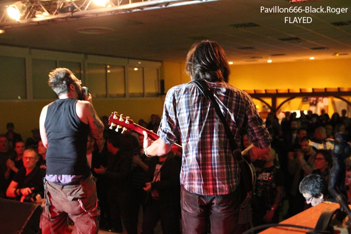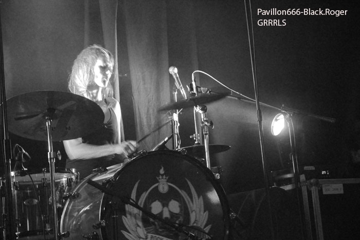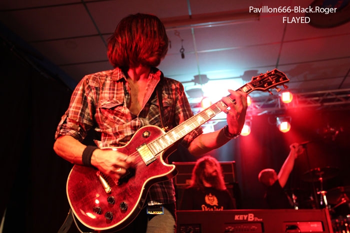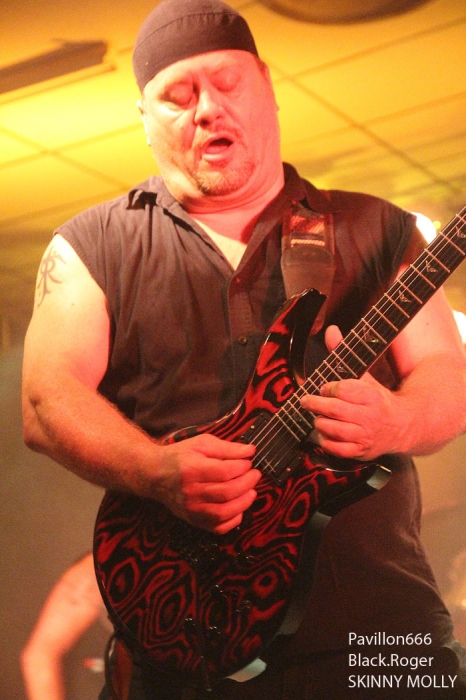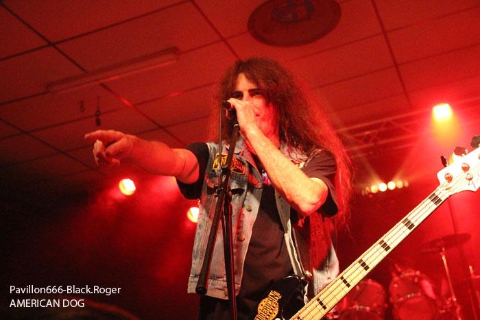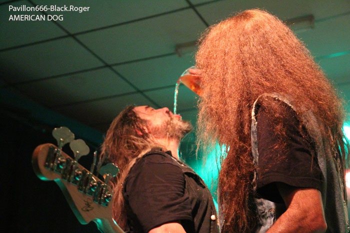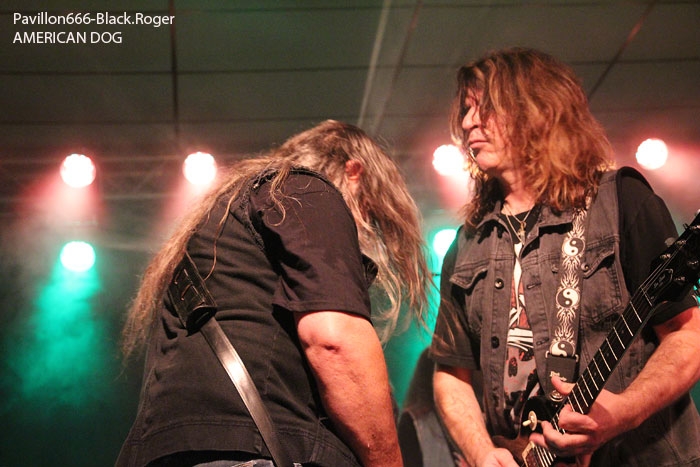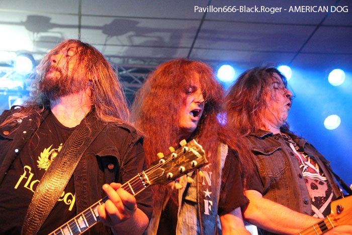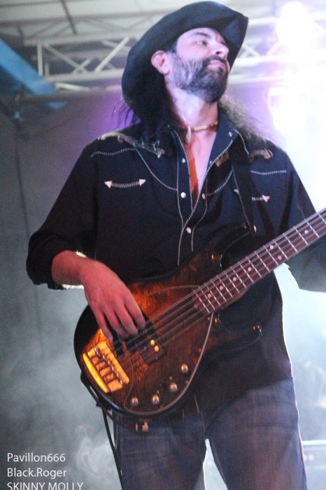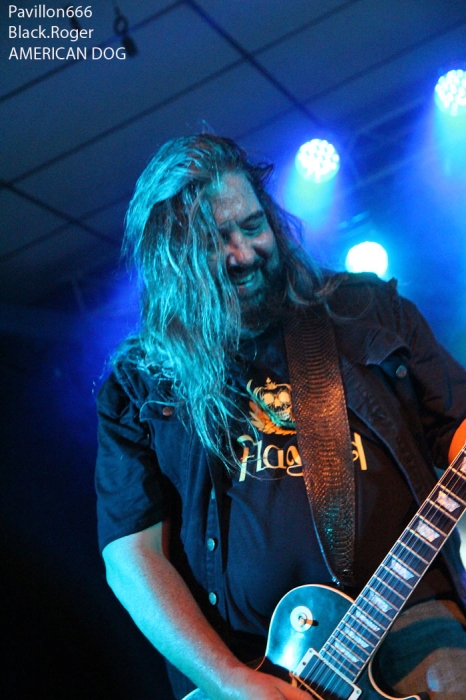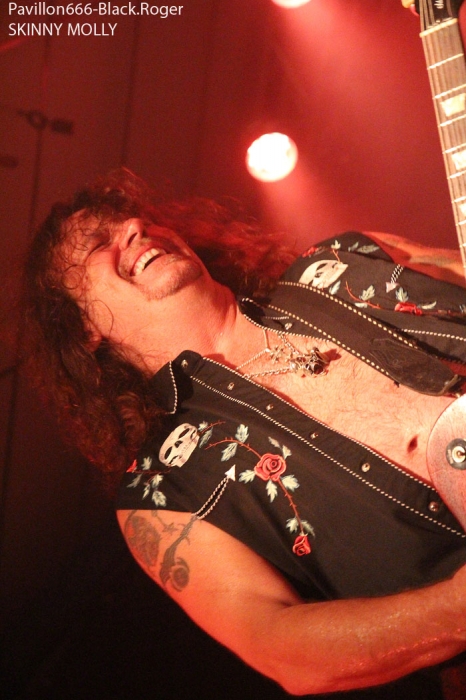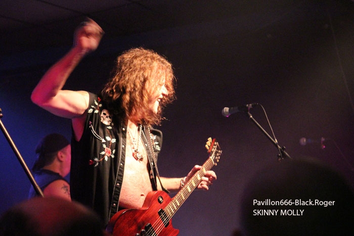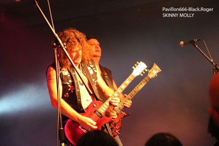 Et puis, dès 19heures30 le public peut entrer dans la grande salle de concert afin d’apprécier le rock dans tous ses états à l’aide de 5 formations venant de l’hexagone bien sûr mais aussi des USA pour les deux têtes d’affiche de la soirée, AMERICAN DOG et SKINNY MOLLY. Premier groupe à monter sur scène, les locaux de FLAYED avec leur premier album « Symphony For the Flayed » sous le bras vient mettre la soirée sur les rails de façon énergique et puissante. Avec des prestations scèniques remarquées dont une en ouverture pour ORANGE GOBLIN en Juin et un set monstrueux au dernier festival SYLAK l’été dernier, le groupe fait mouche avec notamment le charismatique frontman Renato au micro. Comme nous l’avons comprit, Flayed est un groupe qui monte, qui monte dans un registre rock/hard rock/blues 70’s avec des riffs qui tuent, un orgue hammond pour le fun et des compositions variées qui accrochent tout amateur de rock « couillu ». Si vous avez aimé ce soir, vous les retrouverez notamment le 4 Décembre prochain au Ninkasi kao de Lyon en ouverture de Lofofora, ils comptent sur vous ! Set-list en photo. Après le rock endiablé de Flayed, voici le groupe Lyonnais de rock « dit garage » appelé GRRRLS au ¾ féminin. Mais ici nous aurons droit à du rock particulier avec ce quatuor qui semble vouloir « réinventer » le rock à sa manière tant dans l’attitude que dans ses œuvres musicales « vaginalement » incorrectes. Mais leur rock parait peut-être un peu trop compliqué et la digestion de leurs compositions décalées se veut lente et difficile, le public étant venu se régaler de binaire plus groovy et de ce fait se régale plutôt du côté du bar. Par moments j’ai pensé au bien connu groupe Américain PRETENDERS et sa chanteuse charismatique Chrissie Hynde, par moments bien sûr… Globalement la prestation de GRRRLS fut curieuse avec des passages puissants certes, mais aussi avec des dérapages sans « queue ni tête » (sic), où une certaine frustation s’empare de nous car on nous emmène dans des impasses musicaux si je puis m’exprimer ainsi. L’originalité à tout prix cela n’a pas de…prix, et si ce soir nous n’avons pas comprit grand’chose au film nous avons déjà retenu que les musiciens savent jouer, pour le reste… Le public va maintenant se rapprocher plus près de la scène pour du rockabilly sauce fifties avec MARILYN & THE ROCKIN’BOMBS. Alors ce rock vintage avec contrebasse, guitare aux sonorités d’époque (THE SHADOWS ?), chanteuse au look qui tue, fait mouche dans l’assistance. Ce n’est pas « Be Bop A Lula » de Gégène, mais « be bop a Marilyn », Marilyn qui aime visiblement ce look 50’s avec fleur dans les cheveux, robe près du corps et talons, pin-up de l’époque des balbutiements du rock quoi ! Il y a aussi cette voix légèrement rocailleuse, ce déhanchement bienvenu, le tout rythmé par une batterie très présente. Alors tout y est chez ces marseillais qui nous font redécouvrir avec classe ce wild rockabilly, ce rythm’ blues remontant aux sources de notre musique préférée, bravo ! Avant de passer aux deux groupes têtes d’affiche, Fabrice président de l’asso Rock n’ Bike United procède au tirage de la tombola, une tradition des festivals Serpaize en Rock. Chaque gagnant vient retirer, soit un bon pour piercing, soit un bon pour tattoo, soir un salami, mais le gros lot est une guitare électrique qui fera bien du bruit dans la chaumière de l’heureux gagnant. Venus de Nashville, Tennessy, les « ricains » de SKINNY MOLLY font halte à Serpaize durant leur tournée d’automne Européenne. Ici, place au rock Sudiste avec dans le line-up un ex-Lynyrd Skynyrd (Mike Estes) et un ex-Blackfoot (Jay Johnson), du lourd en somme. Oui du très lourd même avec ces dignes représentants du southern-rock qui pratiquent un rock sans concession flirtant avec la country par moments mais surtout avec le blues. Le public de ce soir se presse devant la scène enfin et touche du doigt ces légendes vivantes d’un certain style de rock où plane bien entendu les ombres de LYNYRD SKYNYRD et MOLLY HATCHETT. Ici la lourdeur du rock sudiste es palpable, vous aller suer, vous êtes partis en voyage dans ce sud mythique des « states » avec des musiciens burnés qui envoient des titres groovy et malsains. Et vous n’en avez cure même après une heure de bon son typé à souhait. Mais il se fait tard maintenant et il faut laisser la place aux autres rockers Américains de Colombus Ohio, les fameux AMERICAN DOG. Enfin nous allons voir les « dogs » avec un second guitariste et pouvoir apprécier en live notamment des titres de leur nouvel opus « Neanderthal », album bien noté par la critique. Mais avant tout, AMERICAN DOG est un groupe à déguster sur scène avec leur hard-rock punky, gras et destructeur. Le quatuor démarre en trombe avec le fameux « Shitkicker » suivit d’un nouveau titre « Carnivore ». La suite vous la connaissez, ça « rocke » de partout avec maintenant avec un Steve Theado soutenu par le second guitariste Vinnie Salvatore, ce qui lui permet encore plus de fantaisies guitaristiques qu’auparavant. Michael Hannon, chanteur/bassiste nous propose un « Drank Too Much » reprit en chœur par l’assistance et ne manque pas de verser sa bière dans le gosier de son acolyte Steve (j’ai pas dit alcoolique ! ». bref, c’est la fête, le hard-rock plombé des « cabots ricains » fait son œuvre, ambiance. Et puis de titres en titres tous plus groovy les uns que les autres, il faut bien terminer ce set qui aurait pu durer encore longtemps (vu la discographie conséquente du groupe), mais l’heure tourne et il se fait bien tard maintenant, ça commence à fatiguer devant la scène. Pour finir donc on nous balance une bonne reprise de Ted Nugent, le classique « Dog Eat Dog » (figurant sur leur dernier album) C’est terminé, pas de rappel, mais vous avez eu votr