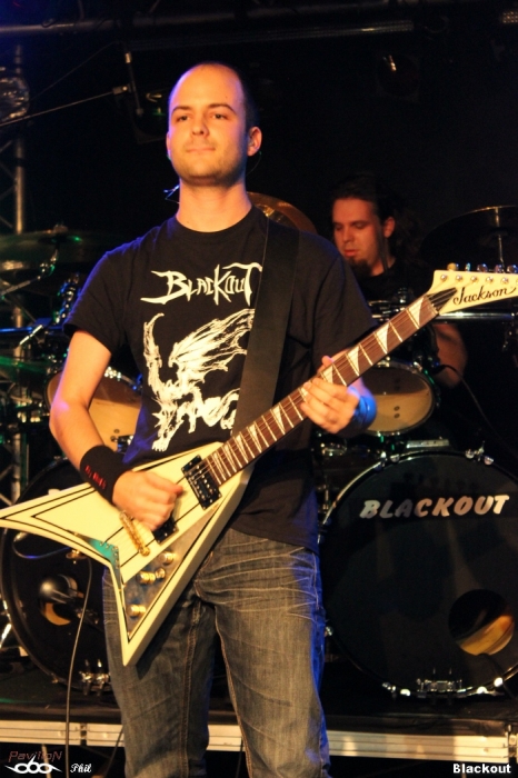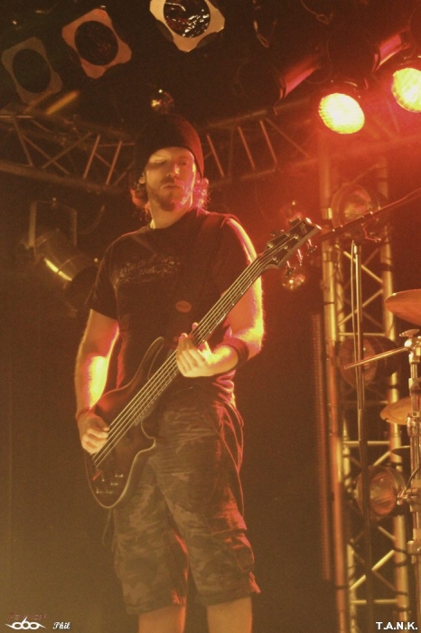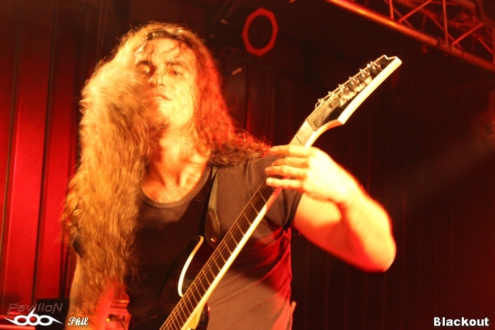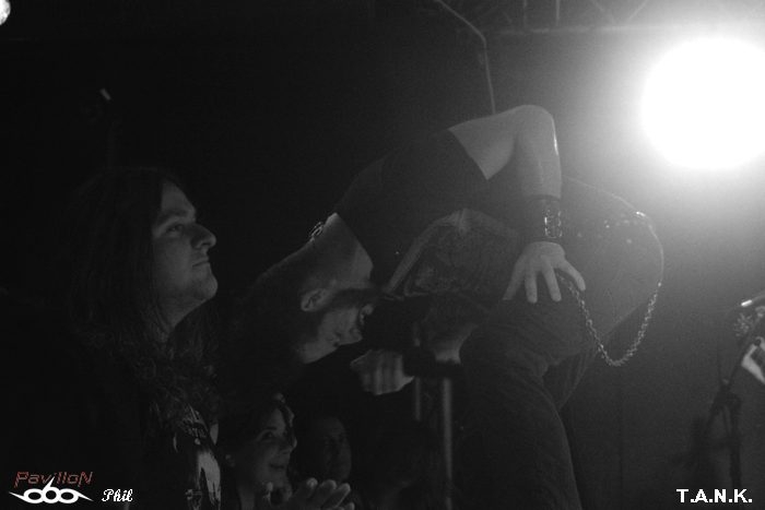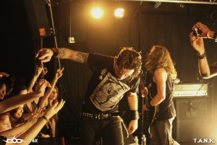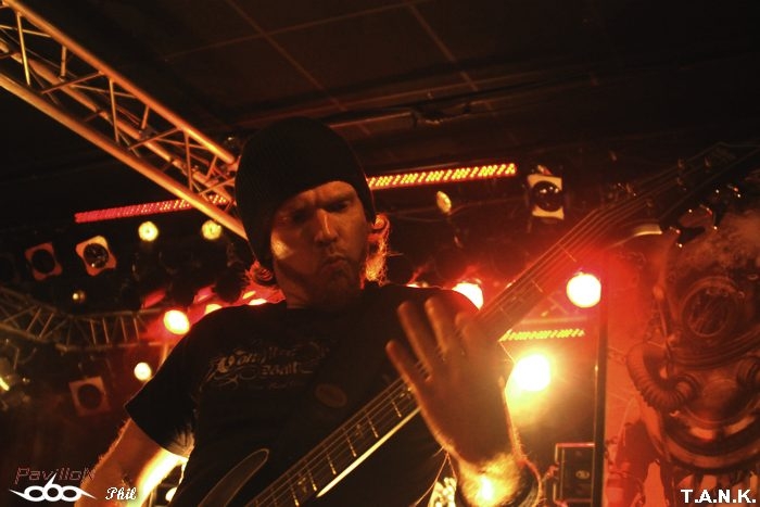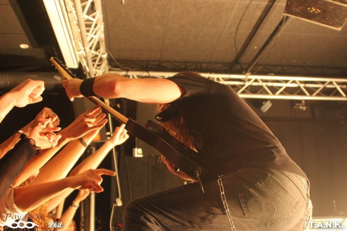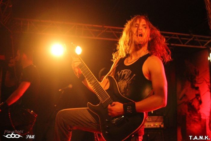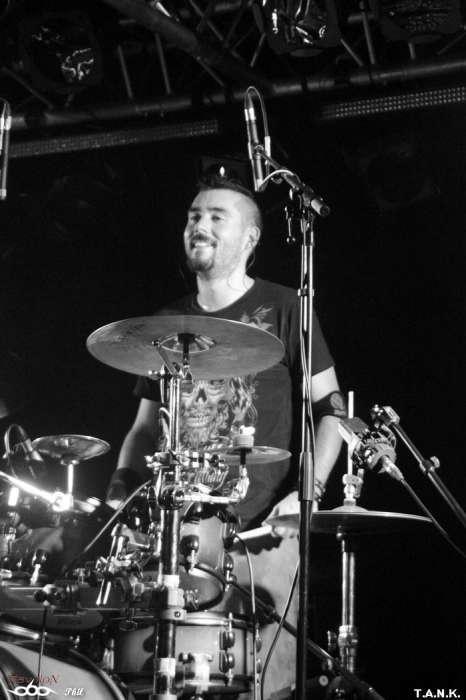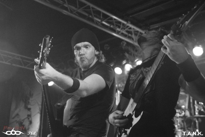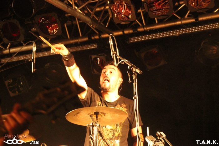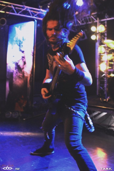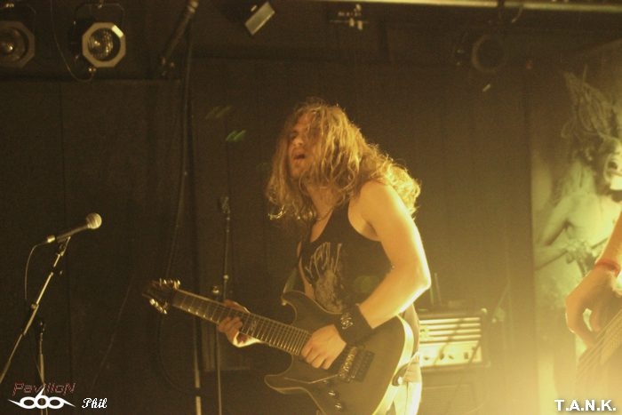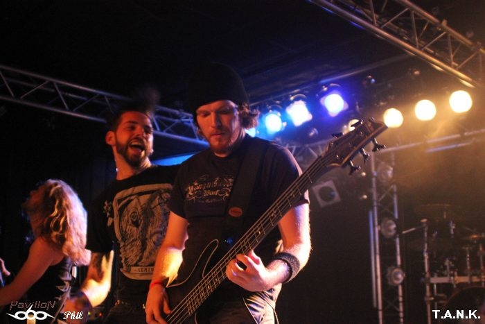 Lorsque les débats débutent tous non pas regagnés la scène, certains sont restés au stand de merchandising. C'est donc dans une fosse peu garnie que ASTRAL TEARS prend position sur les planches. La formation propose un metal intéressant de part son orientation musicale. Il est dommage que la voix de Beyza n'est pas été traité avec un peu plus de gain. La vocaliste est peu audible, couverte par le duo de guitares. Tout ceci gâche la prestation mettant à rude épreuve l'intention du public, bien que les musiciens tiennent le cap tant au niveau prestation qu'au niveau du manient de leurs instruments. Bien que la température soit montée d'un cran, il est difficile d'être porté par ce set. Setlist : Hate The Enemy / Sinner / End Of My Story / Awake / Back To Lyfe / Tell Me Lies Après quelques mouvements de scène, place à une musique plus musclée avec BLACKOUT. Le quatuor donne dans le thrash metal à l'ancienne. Ils sont venus dévoiler leur premier essai et ont bien l'attention de le défendre. Tout n'est pas parfait, rappelons que le groupe existe depuis deux ans seulement et ne comporte que quelques concerts à son actif. Sylvain (chant, guitare) assure son rôle de frontman avec une bonne communication avec le public. Ses riffs et soli ne sont pas là pour plaisanter, tout comme son compère Alex (guitare). Du coté rythmique sa bastonne avec Vad (batterie), vrombit et headbandgue pour Kenny (basse). La prestation n'est pas désagréable, le groupe arrive à mobiliser le public, mais il reste encore à acquérir de l'aisance sur les planches. Une formation à revoir avec un peu plus de maturité. Setlist : Intro / Spitful Ambitions / Bloody Tears / Dark Road / Burning Empire / Fall & Rise / Face The Demon / On The Brink / Pull Harder (Trivium cover) / Taken By The Dark / Turn Over Dernier de la soirée, T.A.N.K. a déjà conquis la foule avant sa venue sur la scène. C'est tout naturellement que les musiciens envahissent le Chaudron dès les premières notes. La salle est vite en ébullition tant les riffs des guitares de Symheris et Nils sont imposants. Le duo donne dans le percutant, la saccadé et dans les soli inspirés. Olivier (basse) et Clément (batterie) ne sont pas en reste, la section rythmique abat un travail de construction solide et robuste. Raf oscille entre chant hurlé et partie plus mélodieuse. Les musiciens sont sur scène pour prendre du plaisir et surtout pour le partager, ils sont au devant de la scène au contact de la fosse ou comme le vocaliste à slammer au dessus du public. Tout est en place, le quintette démontre une assurance et aisance grandie au fil des dates. T.A.N.K. profite de la soirée pour nous présenter un nouveau titre en vue de la composition d'un nouvel album. Au regard de ce titre, nous attendons la suite avec impatience. Setlist : Intro / The Raven's Cry / Inhaled / T.A.N.K 09 / Beautiful Agony / Corpse / Legacy (new song) / Walk (Pantera cover) / Brother In Arms / It Bleeds Inside T.A.N.K. a embrasé le Chaudron comme il sait le faire, fidèle à lui-même tous les membres du groupe ont regagné le stand de merchandising après le set afin de finir la soirée au contact des fans pour des rencontres et des dédicaces. Pas besoin de breuvage venu d'un druide pour passer un moment convivial comme savent l'organiser les maitres des lieux. |