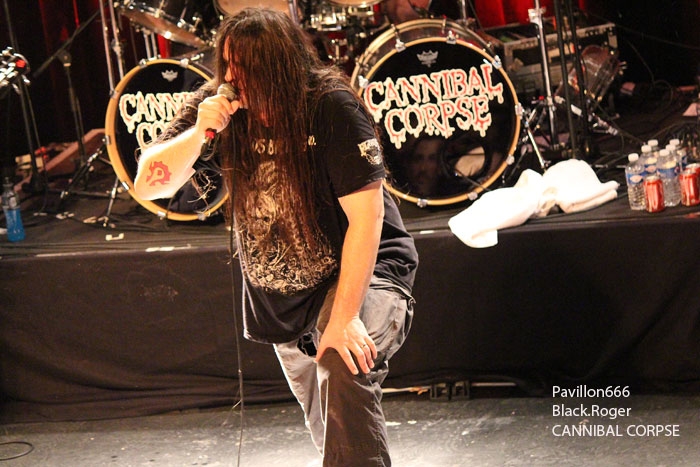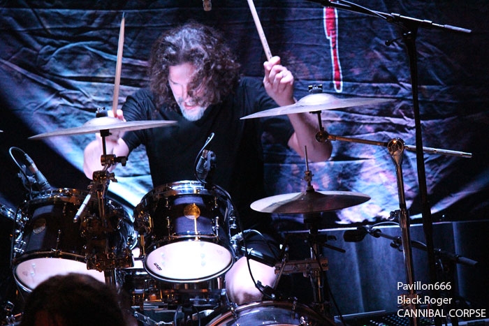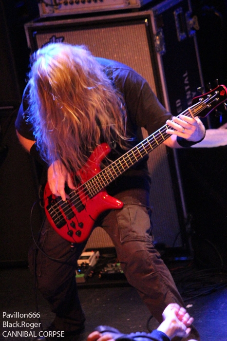 Quant au menu boucherie de ce soir il fut élaboré à base de morceaux issus du nouvel opus évidemment comme « Kill Or Become » impitoyable, « Sadistic Embodiment » très thrash, et « Icepick Lobotomy » sans pitié (sic). En ouverture du show des titres de l’album « The Bleeding » (1994), « Staring Through The Eyes Of The Dead », Fucked With A Knife » et Stripped, Raped and Strangled » (tout un programme !) nous ont été servis en aperitif. Bref, en 1heure 15 minutes nous avons eu droit à 19 “joyeusetés” gore, morbides et putrides, 19 titres pour nous gaver de charcuteries frelatées.