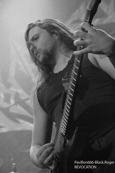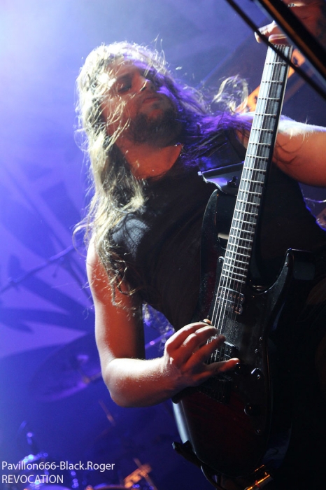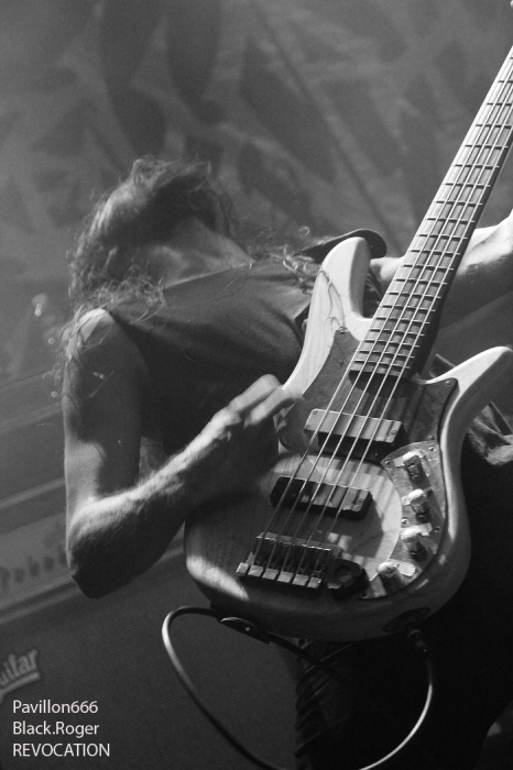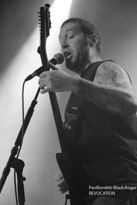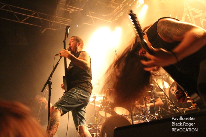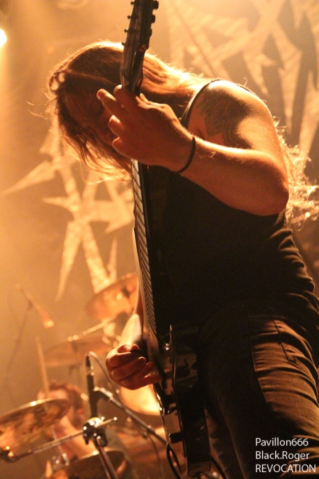 Avec REVOCATION, la seconde formation en lice, originaire des “states”, de Boston exactement, le death va prendre une autre tournure, plus rapide, plus groovy, plus “core” tout simplement. Alors, nous pensons à du deathcore fatalement, mais mâtiné de thrash, alors thrashcore ? Peut-être, en tous cas les « ricains » vont contribuer à transformer la fosse en terrain de jeu brutal, avec des walls of death spontanés et des stage-diving incessants (mais où est passé ma godasse ?). Leur death moderne plait donc à l’assistance n’en déplaise aux purs et durs de la vieille école qui suivent les débats et les ébats des plus jeunes de plus loin vers le bar. Mais que diable il faut bien du sang neuf dans ce métal qui ne veut pas mourir ! Alors sachons apprécier (ou pas) les soli incroyables, les dérives prog des musiciens et la présence musclée du frontman qui maitrise bien la scène sans fatigue aucune.