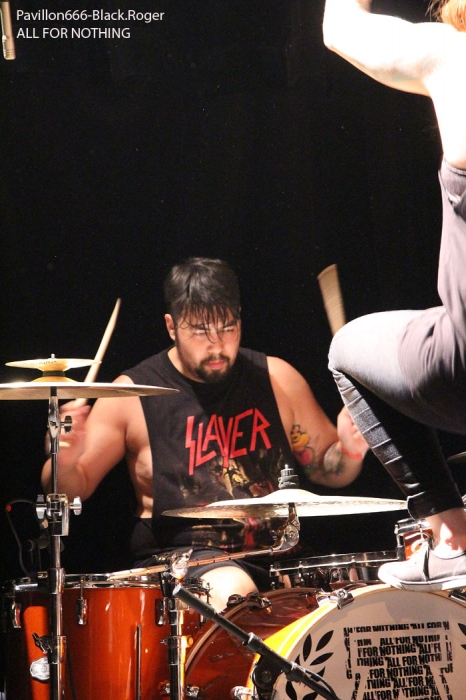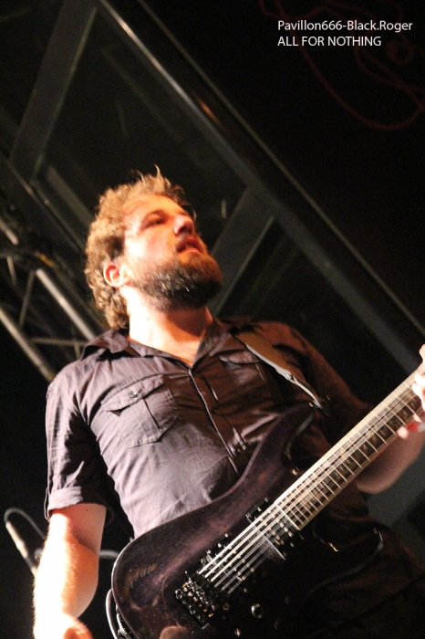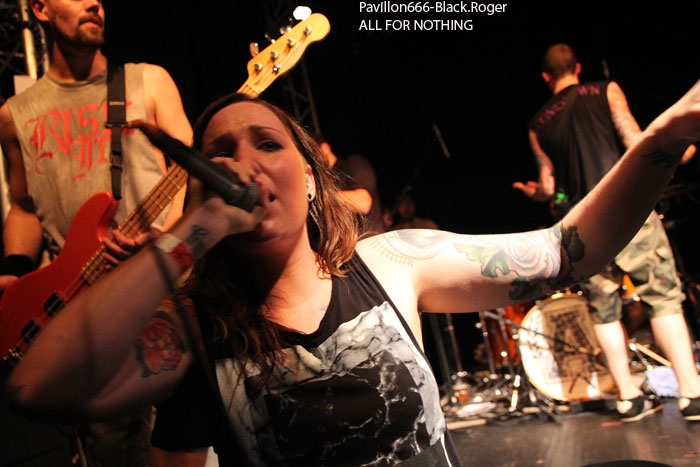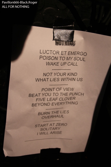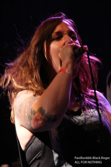 Les lieux sont « full up » et l’ambiance installée dès le début des hostilités à 21 heures. Sur les planches voici GET OFF donc, punk/hardcore ou si vous préférez hardcore/punk qui envoie la sauce en premier avec un style old-school qui va provoquer les ébats physiques dans la fosse sans retenue aucune, garez-vous, ça va faire mal ! Le quatuor a enregistré une démo 5 titres « Shemale Revolt » en 2013 et ces titres on les retrouves ce soir en live avec une certaine énergie attisée par leurs amis « coreux » qui montent sur scène pour s’emparer du micro dans une démarche enragée et engagée dans les textes. Get Off est bien servi par du bon son, ça tape fort, les mosh-prts font mouche, que demander de plus pour chauffer à blanc un public en nombre s’apprêtant ensuite à accueillir les « coreux » bataves de Rotterdam. Set court mais intense donc pour les Lyonnais, bravo ! Peu de temps après la bande à Cindy, frontwoman de ALL FOR NOTHING se présente sur l’estrade et sans temps mort nous rentre dans le « lard » avec des compositions percutantes. Des compositions puisées dans leurs 4 albums et autres mcd dont le petit dernier « What Lies Within Us » de 2014 paru évidemment sur GSR Music, label de référence dans le hardcore, excusez du peu ! Alors ce soir c’est l’étape de Lyon dans leur tournée Européenne actuelle qui va mettre le feu aux poudres dans le Ninkasi Kafé. Bien sûr on pense à Candace et Walls Of Jericho par moments car la démarche est similaire. Mais Cindy et All For Nothing se révelent plus old-school dans leur hardcore et plus punk dans l’attitude et la voix de leur frontwoman, une frontwoman très proches des « coreux » de la fosse de 7 à 77 ans car elle fait monter sur scène un petit fan à casquette bien déchaîné durant le set des Bataves. Donc une démarche à rapprocher de Comeback Kid et de No Turning Back aussi avec de l’énergie à revendre, des riffs redoutables d’une efficacité incroyable. Le quintette à donc convaincu ce soir, mais dès les premiers titres nous avions déjà comprit que sous des aspects frêles et innocents Cindy maitrisait la scène avec une chorégraphie incroyablement fraiche et vivante border-line d’une agressivité bon enfant sous-jacente. Et que dire de ses compagnons de jeu qui ont placé la barre très haute ce soir en faisant hurler leurs instruments aussi bien dans les tempos rapides que dans les mid-tempo musclés. Que du bon, du très bon même, alors le rappel fut inévitable pour clore cette soirée où tous les participants avaient la « banane » en fin de set, set-list en photo d’ailleurs ! Une soirée idéale pour contrecarrer la fameuse « déprime » du Dimanche soir, une soirée réussie haut-la main ya pas photo. Merci à Lyon-Hardcore agitateur de la soirée et merci au Ninkasi Kafé pour avoir accueilli punks et coreux de tous poils, on recommence quand ? |