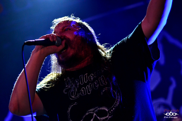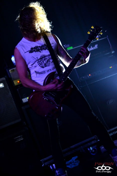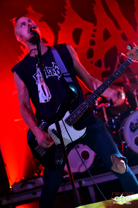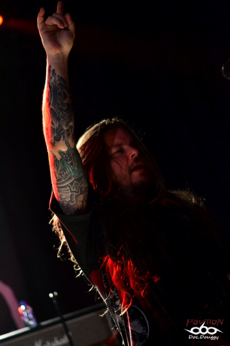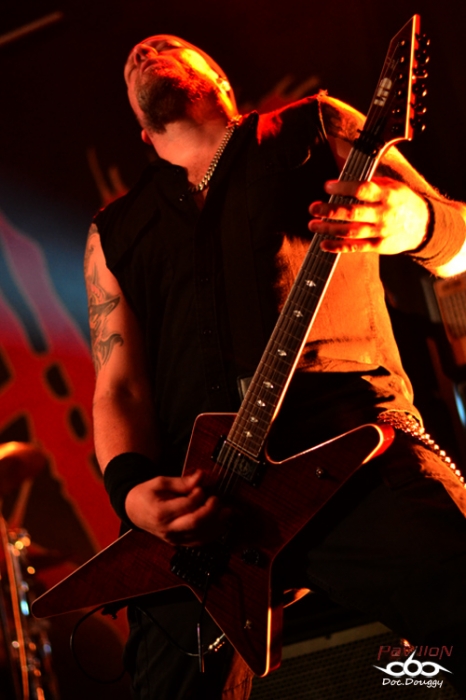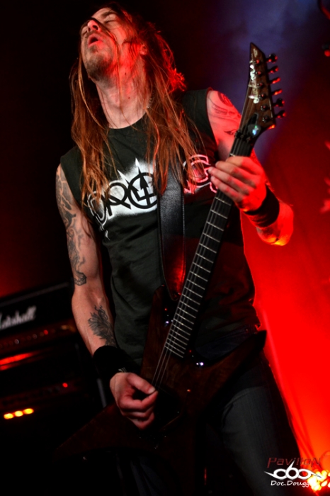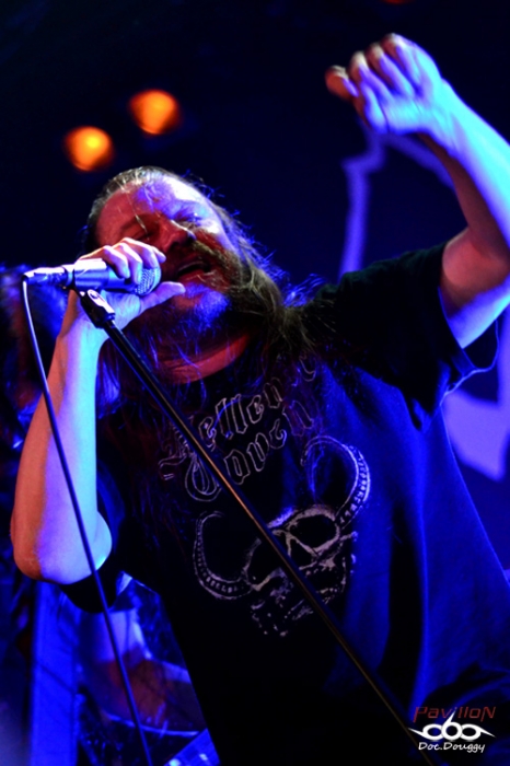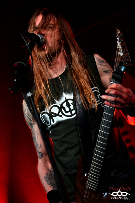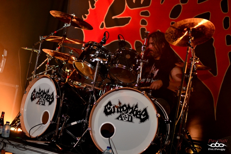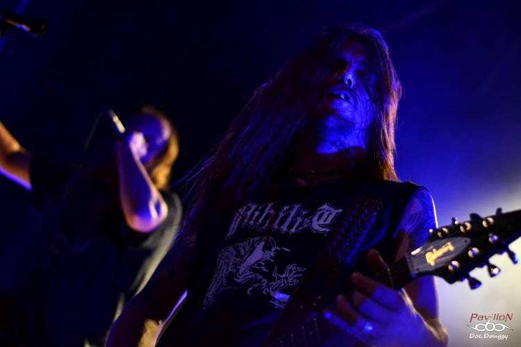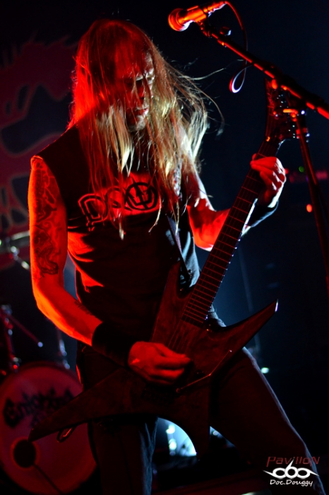 Pas trop étonnant donc, avec la notoriété de Petrov & cie de voir masse de gens faire le déplacement, ainsi d'ailleurs que de nombreux Lillois et Nordistes qui auront pour conséquence de faire du De Kreun "presque" salle comble ! (Fait étonnant d'ailleurs en parlant du nombre de Nordistes qui venaient dans cette salle pour la première fois quand on connaît sa proximité frontalière ainsi que sa prog', mais ça, c'est une autre histoire...) Bref, REPUKED donc ouvre la marche sur ces 40 premières minutes. Quatuor plutôt bien en place, un poil plus "punk" que les deux têtes d'affiche, c'est intéressant et ça peut mettre en appétit. Le backdrop ou plutôt le drapeau posé sur les retours devant la scène donne le ton avec un logo un poil illisible affublé de deux index bien levés. La plus grande partie de la salle est pour le moment statique, je pense que tout comme moi, on découvre le combo Suédois et reste donc sceptique. Le son est bien retranscrit, c'est pas très original mais ça groove. Par contre, on entend pas tellement les deux guitaristes qui font aussi office de backings, laissant la place à un bassiste/chanteur houpette à la Tintin sur la tête, tout en grimace et qui d'ailleurs me rappelle un air de Toxic (Kickback, Diapsiquir). Et la comparaison s'arrête, son chant étant bien plus écorché. Une bonne première partie mais sans réelle surprise. Mais on est pas venus pour ça... Non, si on est venu c'est bien parce qu'il y a GRAVE qui accompagnent ENTOMBED. Compagnons de longue date, il me semble même que ceux-ci n'avaient plus tourné ensemble en Europe depuis le "God of Death Tour" y'a ... 10 ans maintenant ? (Grave, Entombed, Dismember et Unleashed). Et c'est plutôt plaisant de les revoir après une prestation qui m'avait énormément plu au Neurotic Deathfest cette année et un groupe qui fonctionne toujours si on les compare aux histoires judiciaires d' ENTOMBED... Habitué à des prestations toujours au poil et professionnelles, l'entité GRAVE ne prend pas une ride sur les morceaux les plus anciens comme "Christi(ns)anity" qui se mêlent parfaitement aux titres tirés du petit dernier en date : "Endless Procession of Souls" (2012) et pour cause, la recette n'a que très peu évoluée pour toujours autant d'efficacité. Son sans faille qui traduit ce côté malsain et soutenu, avec l'aspect "croustillant" de la guitare typique "Sweden", Ola excelle derrière son pied de micro pour ses vocaux arrachés et une session rythmique/soliste parfaite, soutenue par son compère Mika qui sait se mettre en avant pour haranguer le public. Seule "ombre" au tableau, l'absence de Tobias (Basse), remplacé par un jeune gars S.W qui quant à lui reste un peu plus dans l'ombre... Bon déroulement de setlist marqué par les excellents "You'll Never See" ou le final "Into the Grave", GRAVE mettant tout autant "Endless..." que ses anciens albums en avant pour une session d'headbanging en bonne et dûe forme de la part d'un public admiratif; la scène de De Kreun convenant parfaitement au quatuor. GRAVE, une valeur sûre de la scène Death metal Old School en "live" qui fait que l'on ne s'ennuie que très rarement et les 45 minutes accordées passant hélas, trop vite. Passé les histoires de copyright, retrouver ENTOMBED reste un réel plaisir ! Et si Petrov a su bien s'entourer c'est grâce à ce qui reste du line-up de "Serpents Saints" (2012) qui signe aussi la fin d'une époque. Et que ce soit du côté de Johan Jansson (Regurgitate/ex-Demonical, qui remplace Alex Hellid), on peut dire que celui-ci possède, autant que son autre compère Nico Elgstrand, le groupe dans le sang après un vrai "Retour sur les devants". "Back to the Front" donc qui nous vaut l'honneur de la présence des Suédois à Courtrai ce soir est à l'honneur, la verve et l'energie d'un L.G Petrov toujours aussi souriant, proche de son public (ainsi que le reste du groupe) à de quoi donner du baume au coeur ! Le public le leur fait savoir tout autant avec ce public bien chaud qui n'hésite pas à slammer, leur rendre un hommage type "Wayne's World" lorsqu'ils arrivent sur scène, ou... faire l'hélicoptère avec leur appareil, fait qui, à souligner est plutôt bien pris par l'équipe, Johan n'hésitant pas à se mettre au headbang au même niveau que ce fan pour tournoyer en rythme. La joie et la bonne humeur quoi ! Niveau setlist, c'est un sacré best-of qu'on a là, avec quelques morceaux ajoutés si on la compare à celle jouée au Motocultor en août dernier, de quoi me combler avec en vrac : "Revel in Flesh", "Stranger Aeons" ou l'habituel et imparable "Left Hand Path" pour le côté old school; et "To Ride, Shoot, Straight and Speak the Truth", "Chief Rebel Angel" ou "Wolverine Blues" pour ses morceaux au groove imparable. Vous l'aurez compris, ici à De Kreun, le public et ENTOMBED A.D n'ont fait qu'un. L'une des affiches de cette fin d'année. ET pourtant, quand c'est fini, on aimerai bien que ça recommence ! SETLIST: (Plus bas dans les photos) Depuis son annonce au début de l'été, j'attendais de pied ferme cette tournée d'ENTOMBED A.D, de quoi prouver que le Death Metal Suédois pur et dur a et possédera toujours son banc de chevelus pour les supporter. Et la proximité et la disponibilité de ces messieurs qui sont là pour le plaisir de jouer (rappellez-vous Lyon l'an dernier, où ceux-ci ont accepté de jouer malgré l'annulation de la part du tourneur faute de préventes) prouve bien qu'à cette heure, si y'a bien une chose à ne pas oublier, c'est le plaisir de la musique et plus spécialement du Death Old School qui a été mis à l'honneur et qui ramènera encore et de tout temps du monde. Une date marquée au fer rouge pour une programmation qui fut l'une des plus alléchantes aux frontières de la France et de la Belgique. Merci à REPUKED et GRAVE d'avoir assuré, et à ENTOMBED A.D de ne pas s'être dégonflé et même plutôt être remontés à bloc après les diff