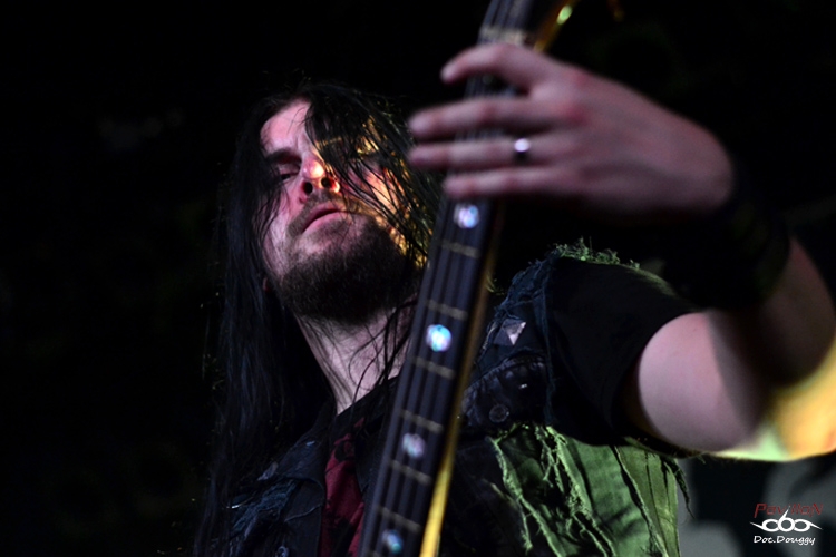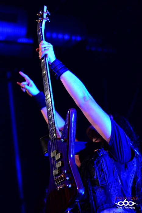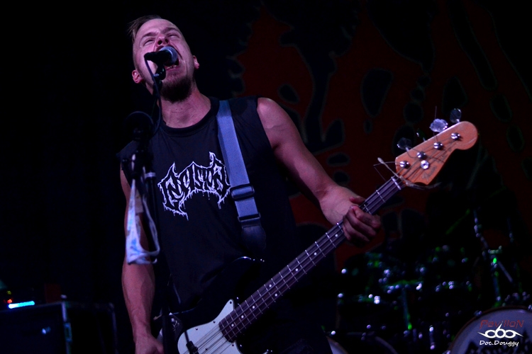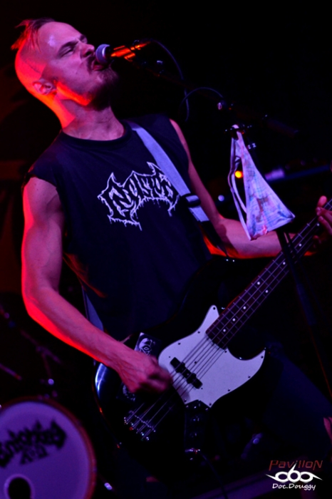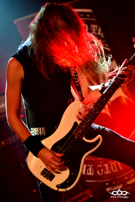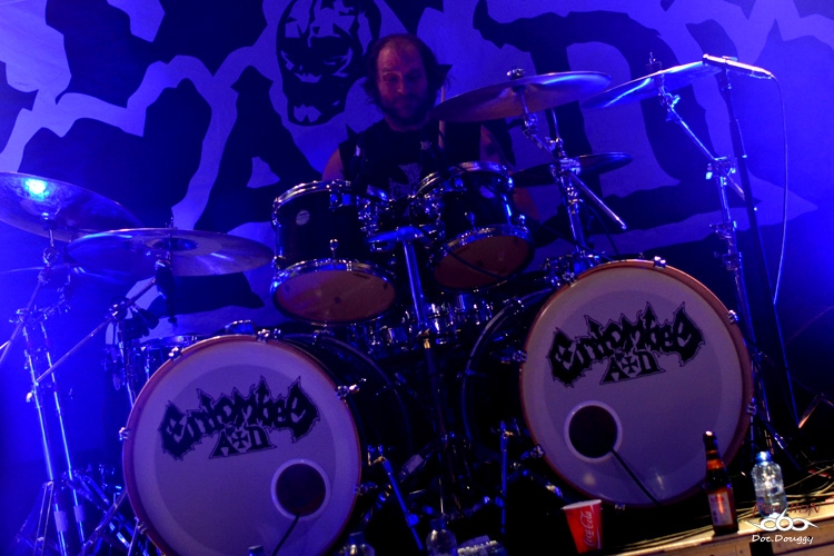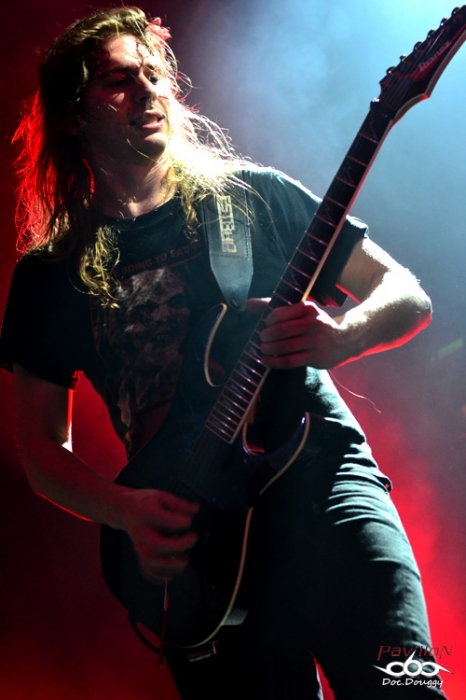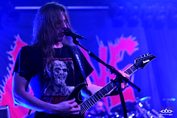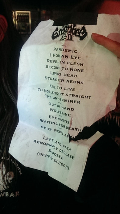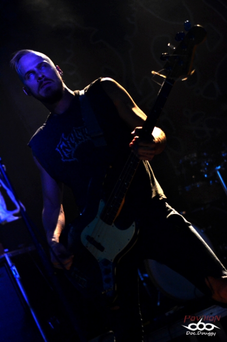 Pas trop étonnant donc, avec la notoriété de Petrov & cie de voir masse de gens faire le déplacement, ainsi d'ailleurs que de nombreux Lillois et Nordistes qui auront pour conséquence de faire du De Kreun "presque" salle comble ! (Fait étonnant d'ailleurs en parlant du nombre de Nordistes qui venaient dans cette salle pour la première fois quand on connaît sa proximité frontalière ainsi que sa prog', mais ça, c'est une autre histoire...) Bref, REPUKED donc ouvre la marche sur ces 40 premières minutes. Quatuor plutôt bien en place, un poil plus "punk" que les deux têtes d'affiche, c'est intéressant et ça peut mettre en appétit. Le backdrop ou plutôt le drapeau posé sur les retours devant la scène donne le ton avec un logo un poil illisible affublé de deux index bien levés. La plus grande partie de la salle est pour le moment statique, je pense que tout comme moi, on découvre le combo Suédois et reste donc sceptique. Le son est bien retranscrit, c'est pas très original mais ça groove. Par contre, on entend pas tellement les deux guitaristes qui font aussi office de backings, laissant la place à un bassiste/chanteur houpette à la Tintin sur la tête, tout en grimace et qui d'ailleurs me rappelle un air de Toxic (Kickback, Diapsiquir). Et la comparaison s'arrête, son chant étant bien plus écorché. Une bonne première partie mais sans réelle surprise. Mais on est pas venus pour ça... Non, si on est venu c'est bien parce qu'il y a GRAVE qui accompagnent ENTOMBED. Compagnons de longue date, il me semble même que ceux-ci n'avaient plus tourné ensemble en Europe depuis le "God of Death Tour" y'a ... 10 ans maintenant ? (Grave, Entombed, Dismember et Unleashed). Et c'est plutôt plaisant de les revoir après une prestation qui m'avait énormément plu au Neurotic Deathfest cette année et un groupe qui fonctionne toujours si on les compare aux histoires judiciaires d' ENTOMBED... Habitué à des prestations toujours au poil et professionnelles, l'entité GRAVE ne prend pas une ride sur les morceaux les plus anciens comme "Christi(ns)anity" qui se mêlent parfaitement aux titres tirés du petit dernier en date : "Endless Procession of Souls" (2012) et pour cause, la recette n'a que très peu évoluée pour toujours autant d'efficacité. Son sans faille qui traduit ce côté malsain et soutenu, avec l'aspect "croustillant" de la guitare typique "Sweden", Ola excelle derrière son pied de micro pour ses vocaux arrachés et une session rythmique/soliste parfaite, soutenue par son compère Mika qui sait se mettre en avant pour haranguer le public. Seule "ombre" au tableau, l'absence de Tobias (Basse), remplacé par un jeune gars S.W qui quant à lui reste un peu plus dans l'ombre... Bon déroulement de setlist marqué par les excellents "You'll Never See" ou le final "Into the Grave", GRAVE mettant tout autant "Endless..." que ses anciens albums en avant pour une session d'headbanging en bonne et dûe forme de la part d'un public admiratif; la scène de De Kreun convenant parfaitement au quatuor. GRAVE, une valeur sûre de la scène Death metal Old School en "live" qui fait que l'on ne s'ennuie que très rarement et les 45 minutes accordées passant hélas, trop vite. Passé les histoires de copyright, retrouver ENTOMBED reste un réel plaisir ! Et si Petrov a su bien s'entourer c'est grâce à ce qui reste du line-up de "Serpents Saints" (2012) qui signe aussi la fin d'une époque. Et que ce soit du côté de Johan Jansson (Regurgitate/ex-Demonical, qui remplace Alex Hellid), on peut dire que celui-ci possède, autant que son autre compère Nico Elgstrand, le groupe dans le sang après un vrai "Retour sur les devants". "Back to the Front" donc qui nous vaut l'honneur de la présence des Suédois à Courtrai ce soir est à l'honneur, la verve et l'energie d'un L.G Petrov toujours aussi souriant, proche de son public (ainsi que le reste du groupe) à de quoi donner du baume au coeur ! Le public le leur fait savoir tout autant avec ce public bien chaud qui n'hésite pas à slammer, leur rendre un hommage type "Wayne's World" lorsqu'ils arrivent sur scène, ou... faire l'hélicoptère avec leur appareil, fait qui, à souligner est plutôt bien pris par l'équipe, Johan n'hésitant pas à se mettre au headbang au même niveau que ce fan pour tournoyer en rythme. La joie et la bonne humeur quoi ! Niveau setlist, c'est un sacré best-of qu'on a là, avec quelques morceaux ajoutés si on la compare à celle jouée au Motocultor en août dernier, de quoi me combler avec en vrac : "Revel in Flesh", "Stranger Aeons" ou l'habituel et imparable "Left Hand Path" pour le côté old school; et "To Ride, Shoot, Straight and Speak the Truth", "Chief Rebel Angel" ou "Wolverine Blues" pour ses morceaux au groove imparable. Vous l'aurez compris, ici à De Kreun, le public et ENTOMBED A.D n'ont fait qu'un. L'une des affiches de cette fin d'année. ET pourtant, quand c'est fini, on aimerai bien que ça recommence ! SETLIST: (Plus bas dans les photos) Depuis son annonce au début de l'été, j'attendais de pied ferme cette tournée d'ENTOMBED A.D, de quoi prouver que le Death Metal Suédois pur et dur a et possédera toujours son banc de chevelus pour les supporter. Et la proximité et la disponibilité de ces messieurs qui sont là pour le plaisir de jouer (rappellez-vous Lyon l'an dernier, où ceux-ci ont accepté de jouer malgré l'annulation de la part du tourneur faute de préventes) prouve bien qu'à cette heure, si y'a bien une chose à ne pas oublier, c'est le plaisir de la musique et plus spécialement du Death Old School qui a été mis à l'honneur et qui ramènera encore et de tout temps du monde. Une date marquée au fer rouge pour une programmation qui fut l'une des plus alléchantes aux frontières de la France et de la Belgique. Merci à REPUKED et GRAVE d'avoir assuré, et à ENTOMBED A.D de ne pas s'être dégonflé et même plutôt être remontés à bloc après les diff