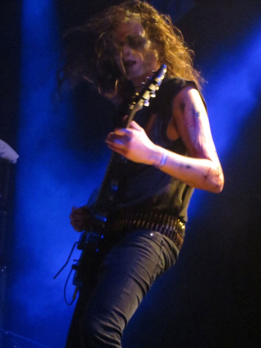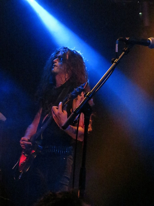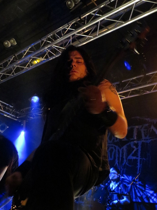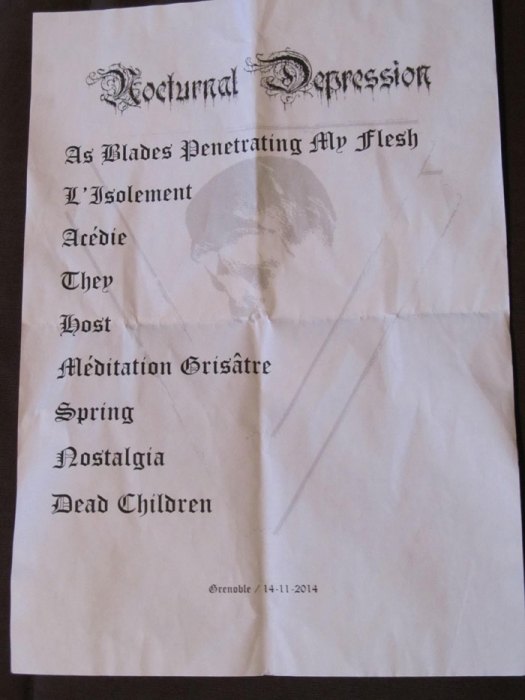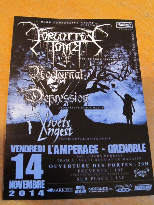 1 – Livest Angest 2 – Nocturnal Depression 3 – Forgotten Tomb D’abord des kilomètres d’embouteillage. Ensuite les éléments se déchaînent, la pluie et le vent m’accompagnent jusqu’à Grenoble où là-bas, ils se mutent en une forme de tempête. C’est bien une soirée Dark Depressive qui s’annonce et pour couronner le tout je suis à la bourre à mort. A force de tourner en rond pour chercher une gâche, je vais rater le début du concert. Galère !! Je suis obligé de me garer aux Dardanelles et je vois les minutes s’effondrer à la vitesse de la lumière. Je fonce à l’Ampérage et j’arrive tout pour assister aux 2 derniers titres du set de Livets Angest. Quel dommage !! Je ne les avais jamais vus sur scène et j’aurais aimé assister au set complet. Toutefois, c’est leur Black Metal glacial qui m’accueille à l’Ampérage et rien qu’à l’atmosphère qui se dégage de la scène, je comprends qu’une porte donnant sur les ténèbres vient de s’ouvrir. Les musiciens sont masqués tout de blanc et la voix aussi lisse que du papier de verre du chanteur vous pénètre jusqu’au fond de l’âme. Ils seront de nouveau sur scène le 23 janvier 2015 au Brin De Zinc en compagnie de Nocturnal Depression et de Physiology of Darkness. Peu de temps mort entre les sets, à l’Ampérage c’est quand même assez efficace. Nocturnal Depression refait un bout de balance histoire de se caler parfaitement et disparait pour une séance de maquillage. Intro théâtrale. On sent la tension dans la salle car ça ne respire plus. Nocturnal Depression joue à domicile et sont attendu non pas comme le messie, mais comme l’anti-christ local. L’entrée en scène est fracassante. Nocturnal démarre avec un « As Some Blades Penetrating My Flesh » tiré de cet album magnifique qu’est Suicidal Thoughts. Enchaînement direct sur l’un de leur chef d’œuvre : L’isolement Nocturnal Depression ne nous laisse aucun répit. Le combo grenoblois emmené par leur talentueux leader Lord Lokhraed envoie la sauce plein pot. Les titres s’enchaînent et nous sommes embarqués dans un long voyage aux confins de l’obscurité. Nocturnal Depression, c’est déjà 10 années d’existence et ils ne se sont pas troués une seule fois. Cela vient très certainement du recul et de l’humilité dont le groupe fait preuve. 6 bons albums, 6 splits avec d’excellents groupes, 5 démos, un EP, un DVD Live plus un nouvel album intitulé « Spleen Black Metal » qui sortira prochainement, que voulez vous de mieux. Ils sont à considérer comme des grandes références du Black Metal français et européen. Lorsque la dernière note tombe, j’ai l’impression que le concert n’a duré que 10 minutes alors qu’ils ont joué plus d’une heure. Le public de l’Ampérage est scotché, presque silencieux. Nocturnal vient de lui asséner une baigne magistrale. Ils n’ont pas oublié durant le set de rendre hommage à leur ville qu’ils aiment tant, ainsi qu’a leur public. Chapeau les mecs, c’était du costaud et c’était magnifique !!! Nocturnal Depression en ce milieu de soirée vient de placer la barre très haute. Maintenant Forgotten Tomb va devoir faire aussi bien si ce n’est mieux… Le combo italien de Forgotten Tomb, qui fête ce soir ses 15 ans à l’Ampérage se cale très rapidement. On sent vraiment la coordination et le grand professionnalisme. Mise à part un léger problème avec l’ampli basse d’Alessandro qui sera vite réglé, tout va bien. Le groupe quitte la scène, l’obscurité descend sur la salle et la musique d’intro démarre teintée de chants grégoriens qui vous collent déjà le frisson. Forgotten Tomb démarre en puissance avec Reject Existence tiré de leur chef d’œuvre « Under Saturn Retrograde ». Le son est vraiment bon, tout comme il l’était pour Nocturnal Depression d’ailleurs, si bien que l’on entend chaque instrument sonner avec précision. Cela est vraiment important pour un groupe comme Forgotten Tomb car les variations mélodiques sont très importantes car lorsque les tempos retombent, les riffs saturés laissent place à des lignes mélodiques extrêmement claires. Là aussi, c’est parti pour un magnifique voyage clair obscur où hurle le désespoir parsemé de ténèbre ou tantôt de lumière. Le combo italien assure à fond et n’a plus rien n’à prouver à personne. Depuis 1999, ce sont 6 albums, 1 compil, 1 album et 1 DVD Live, ainsi que 2 EP et 1 split qui jalonnent leur parcours sans aucune faute. C’est donc sur scène un véritable régal car on revisite notamment grâce à leurs 2 Medley tous les albums réalisés en 15 années. Mais ce soir, les principaux albums qui seront à l’honneur, seront « Springtime Depression » et « Under Saturn Retrograde ». Herr Morbid de sa voix hurlante et déchirée annonce la couleur à chaque morceau et lâche sa horde de musiciens dans un déluge de saturation. Son éternelle complicité avec Algol à la basse va faire que nous allons voir de superbes échanges musicaux sur la scène de l’Ampérage. Le public a pris une énorme déferlante dans la tronche, telle une grande gifle. Lorsque Forgotten Tomb quitte la scène, le public a du mal à redescendre et c’est sur des applaudissements discrets que le groupe fait un rappel pour clôturer la soirée. Et quel rappel !! Shutter, l’un des meilleurs titres du groupe tiré de « Under Saturn Retrograde ». Un sacré final pour boucler le concert des 15 ans à l’Ampérage. |