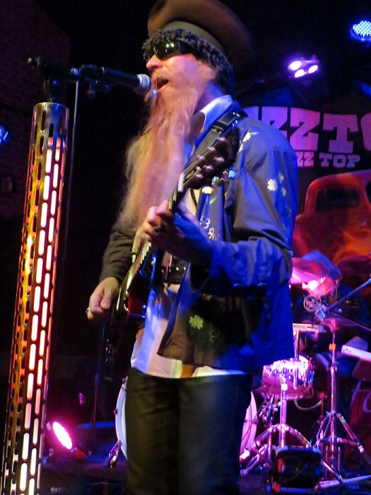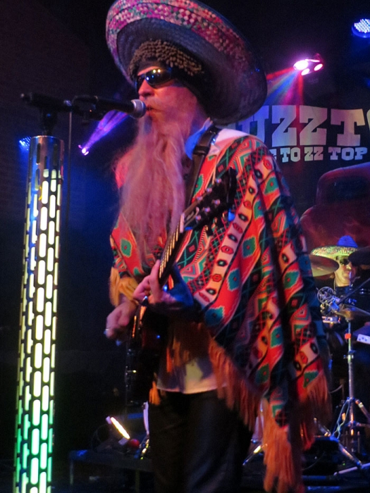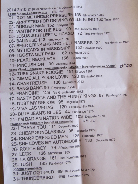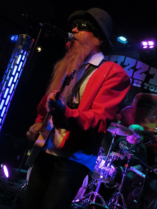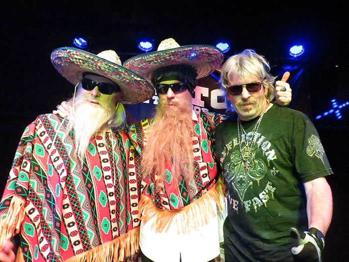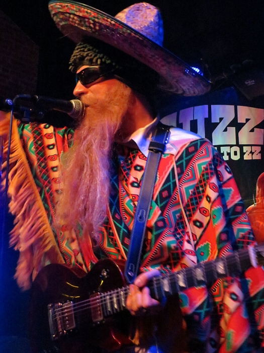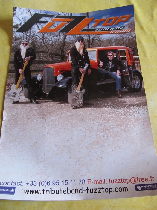 Bref, j’arrive enfin au Satellit Café, ce qui est une première pour moi. De l’extérieur c’est la classe, on dirait un Roadhouse planté sur l’highway 61. A l’intérieur super accueil et décor magnifique, vraiment un bel endroit. Bar, restauration, super belle scène rien ne manque. Le fond de scène et le matos des Fuzztop sont déjà dressés et ça sent bon le Texas. Je sens déjà que ça va y aller, ce soir c’est saga américa, attention les secousses !! Vêtus de rouge, les membres de Fuzztop entrent et balancent direct un « Got me under pressure » qui annonce déjà qu’ils ne sont pas venus pour faire de la figuration. Le groupe est totalement bluffant car les membres sont grimés et habillés comme les vrais ZZ Top. Cela demande un certain culot pour faire cela et surtout une bonne dose de courage car tout au long du set qui va durer 2h10 avec 31 morceaux à la clef, pas une seule fois ils ne seront ridicules, bien au contraire. Les meilleurs morceaux de ZZ Top s’alignent les uns derrière les autres comme « Waiting for the bus », « Jesus left Chicago », « Beer drinkers & hell » ou encore plus récent « I gotta get paid ». Si on se laisse aller quelque peu à la rêverie, on se trouverait presqu’en présence des vrais. Après c’est sûr, tout n’est pas totalement à l’identique et heureusement, à commencer par les instruments. Difficile quand même de se payer les grattes à Gibbons, surtout celle à fourrure qui m’a toujours fait rigoler. La voix de Jack Butller se situe un peu entre celle Lemmy et de Gibbons, j’ai bien aimé aussi. Non, franchement on dira tout ce que l’on voudra sur les « cover bands », ce trio là est vraiment excellent. Ces mecs ont fait un boulot phénoménal pour en arriver à un tel niveau et je leur tire mon sombrero. L’organisation du line up est ric rac et le timing serré. Patrick Girardon qui ne se contente pas de donner le tempo à la batterie assure également toute cette logistique en bon manager. Tous les 10 morceaux environ c’est changement de costume et ça ne traîne pas. Ainsi, tout au long du set, les Fuzz Top vont nous revenir sur la scène tantôt en veste violette avec chapeau camel, en blouson noir brillant avec le bonnet et la casquette pour terminer en poncho et sombrero. Et tout au long de ces changements qui font le spectacle et animent le set, les tubes continuent de s’enchaîner et on se régale. Quel plaisir de ré-entendre « Gimme all your lovin’ », « Dust my broom » de Robert Johnson, « Blue jean’s blues », « Sharp dressed man » et le grand chef d’œuvre « La grange ». A noter, une bonne communion avec le public qui a fini par se bouger et qui au bout-des 31 titres de la set list en demandait encore. C’était vraiment un très bon concert dans une ambiance très sympa. De plus les Fuzz Top sont des gars bien cool qui ne se la racontent et se prêtent au jeu des photos avec le public à la fin du concert. Franchement, à défaut des vrais qui ne sont pas toujours faciles à voir ou alors à des prix exorbitant, prenez plutôt l’option Fuzz Top, je vous garanti que vous ne serez pas déçus. Vous pouvez retrouver toutes les informations les concernant sur leur site officiel : http://www.tributeband-fuzztop.com/ Ou encore sur leur page Facebook : Fuzztop tribute to zz top Et prenez garde à bien prononcer Faz Top et non pas Feux Stop, question de phonétique… |