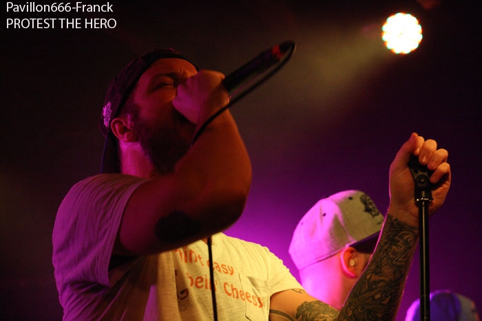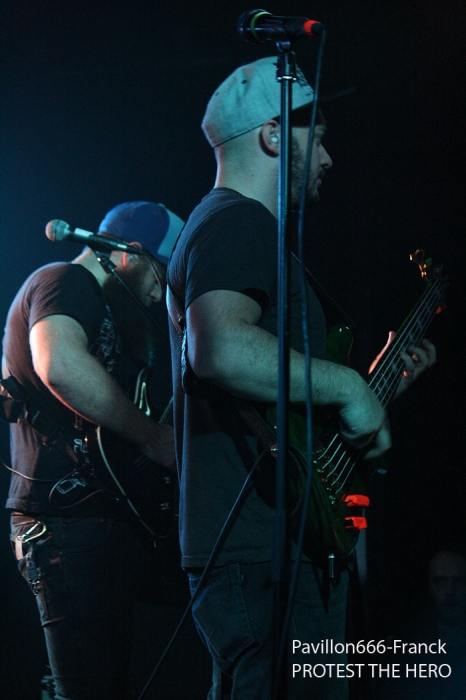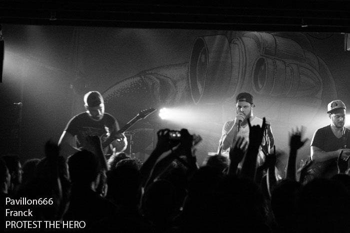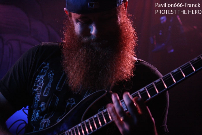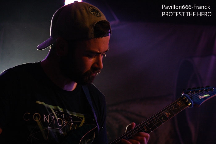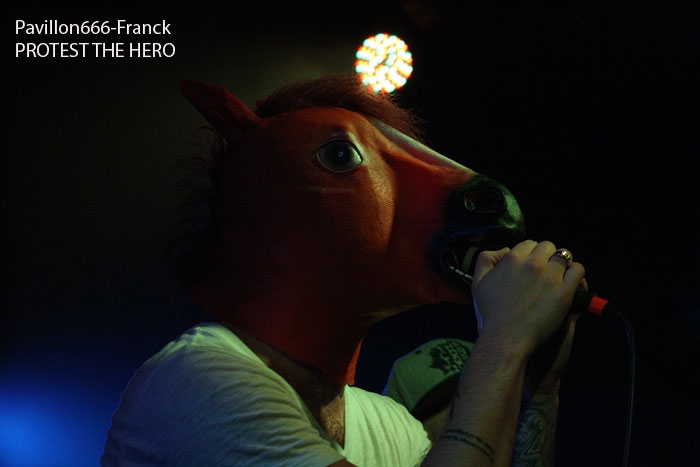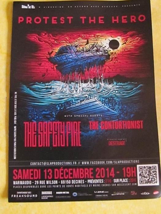 Ce coup-ci j’étais à peu près à l’heure à 2 morceaux près, mais un fâcheux incident digne des plus mauvais scénarios de science fiction va me faire rater tout le set de Destrage dont je n’ai quasiment rien pu écouter et dont je n’ai pu prendre aucune photo. Les changements de plateaux vont assez vite, pas le temps de trop souffler et de récupérer ses esprits que déjà The Contortionist entre en scène. Quelle claque mes amis !! Voilà un groupe qui va prendre le contrôle des esprits de tout le Warmaudio et nous faire un truc d’enfer. Je n’ai jamais aimé les tissus sonores et étiqueter à tout va tel ou tel groupe car j’estime que ça ne rime pas à grand-chose. Je pense plutôt qu’il existe des groupes qui font des choses bien ou encore d’autres choses que l’on apprécie moins bien. Mais dans le cas présent, c’est vraiment une musique atypique, captivante, à la croisée de tout un tas d’autres musiques y compris le jazz. Les américains déroulent leur manteau de rêve depuis la scène jusqu’au font de la salle et je sens tout le monde partir avec eux. Des lignes mélodiques superbes, une musique en parfaite harmonie entre les silences et soudains les envolées sonores les plus violentes. L’omniprésence de Mike Lessard, le chanteur, m’impressionne, il est la tension nerveuse du groupe. Tout semble se hérisser puis retomber dans le silence selon son flux vocal. L’ensemble des musiciens de « The Contortionist », sont tous d’excellents techniciens et des musiciens de haute volée. Avec eux, chaque note prend vie. Lorsqu’ils jouent, la musique prend tout de suite une autre dimension et c’est un vrai bonheur. J’étais dépité à la fin de leur set car j’avais l’impression qu’il n’avait duré que 3 minutes. Je pense que nous étions tous particulièrement unanimes, nous en souhaitions encore et encore, jusqu’au bout de la nuit s’ils le pouvaient… Re-changement de plateau, quand soudain retenti dans les façades des flonflons festifs débouchant sur une musique digne de la parade des dessins animés ou encore l’entrée des clowns au cirque. Mais au lieu des clowns ce sont les anglais de Safety Fire qui entrent en scène. Les Safety Fire ont remplacé ceux de The Faceless qui devaient venir mais qui ont malheureusement déclaré forfait. Le set débute sur les chapeaux de roue dans un style très noisy et surtout dissonant. Ils raccrochent vite avec leur style Metal Progressif très précis avec des grattes dont les sangles sont ajustées au ras des dents histoire de gagner en précision de jeu. Ca cogne bien et ils ne font pas semblant. C’est un style vraiment particulier que le leur, pas forcément facile d’accès à la première écoute vu que c’était la toute première fois que je les écoutais. Par contre, le public semblait totalement conquis, c’était mérité et c’était bien là l’essentiel. The Safety Fire ont bien mouillé le maillot et pour un groupe qui n’a que 3 ans d’existence, on peut dire qu’ils tiennent sacrément bien la scène et ont été impeccables du début à la fin. Les heures tournent et le public trépigne, quand enfin : Here Come The Heroes !! Non pardon, c’est un autre titre, c’est Protest The Hero qui prend d’assaut la scène du Warmaudio à 200 à l’heure et aux premiers riffs, on devine déjà que ça va envoyer du lourd. Le public s’est massé dans le pit et ça bouge déjà à fond. Saga Canada, attention les secousses !! Les morceaux déboulent en avalanche, la scène et la salle s’enflamment comme si on y avait balancé des cocktails molotov, c’est tout simplement énorme. Rody Walker au chant, fait marrer tout le monde avec ses anecdotes qu’il nous conte entre les morceaux. Tout y passe, la bière, les chapeaux, l’accent québécois etc. Nous aurons même le droit à un déguisement impromptu avec une tête de cheval. Franchement, c’est génial !! En plus d’être d’excellents musiciens et show men, ces mecs sont bourrés d’humour et tout le monde passe un sacré bon moment. Carrés, techniques et talentueux, on se régale avec ces 4 gars qui maîtrisent parfaitement la scène. C’est une bonne musique, dynamique, positive, de celle qui vous contamine immédiatement. On m’avait vaguement parlé de « Mathcore », mais comme vous le savez, je déteste les étiquettes sonores, alors pour moi, une sombre synthèse entre les Mathématiques et le Hardcore, cela ne m’inspire pas grand-chose (Je plaisante bien sûr) Non, franchement, c’est du bon gros rock qui décoiffe tout et qui vous met une ambiance du tonnerre et qui vous décolle de terre, que du bonheur en somme. Ce set explosif va également me paraître hyper court. Le public brulant va acclamer tellement fort les canadiens, qu’ils vont revenir pour un rappel. C’était superbe !! Merci à tous ces groupes d’avoir fait le chemin jusqu’à Décines pour nous ravir l’âme et le cœur. Un grand remerciement aux filles de Sounds Like Hell Productions qui m’ont réservé un accueil chaleureux. |