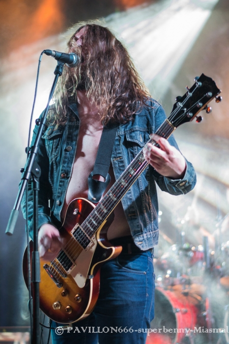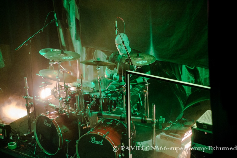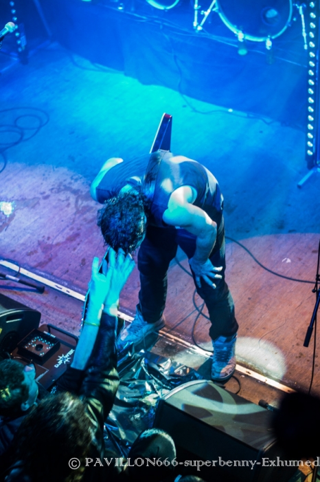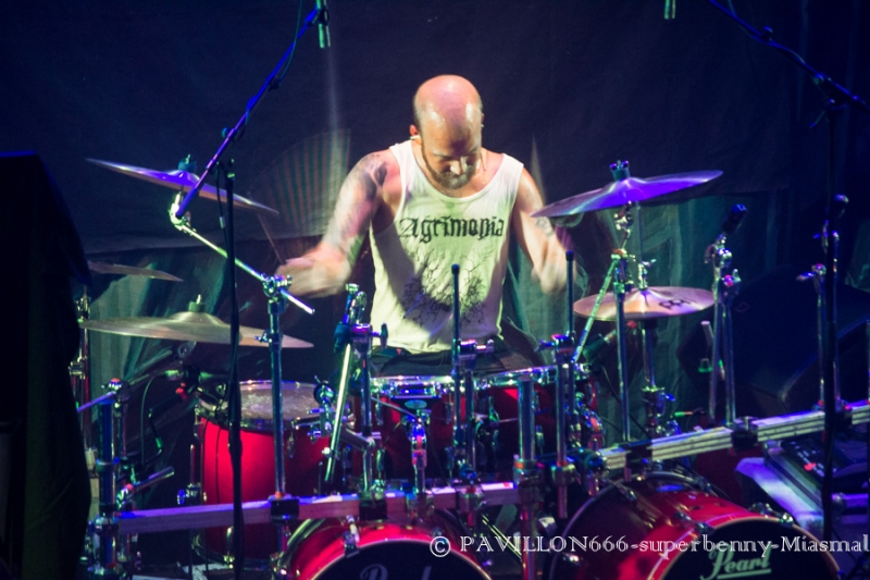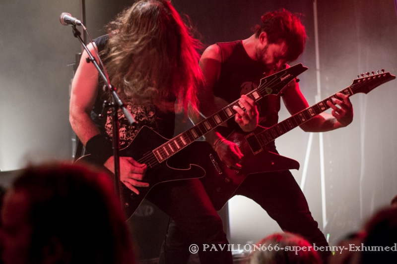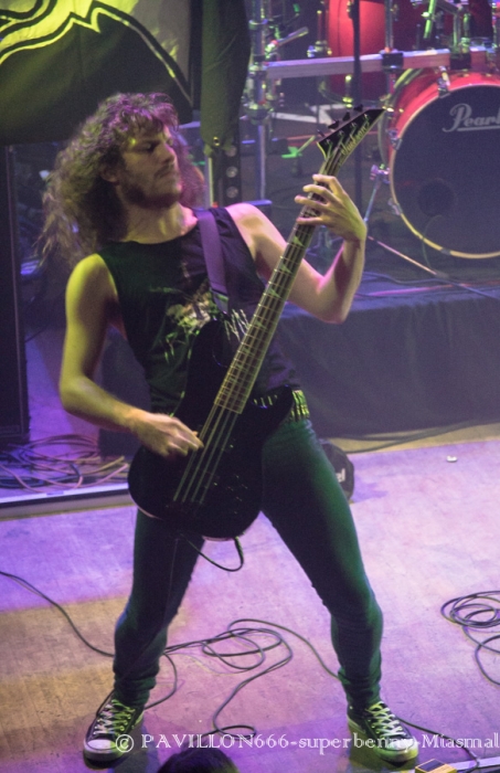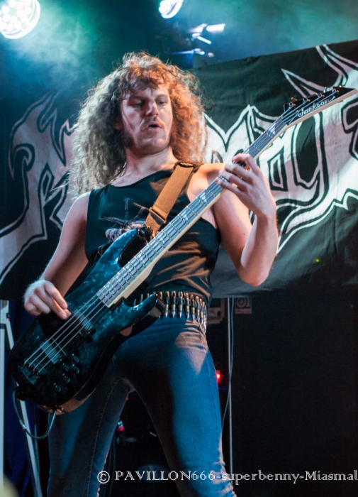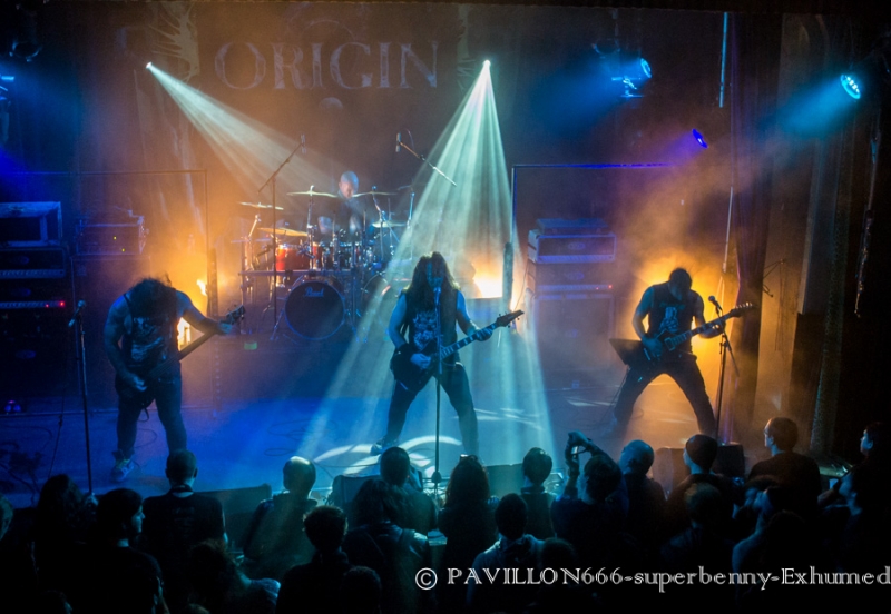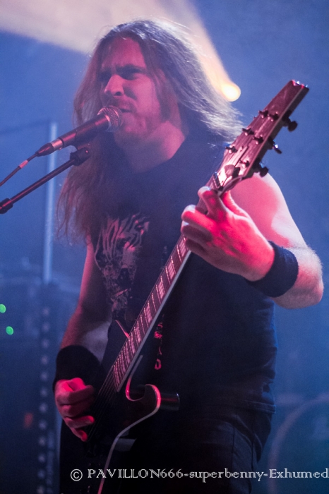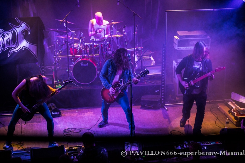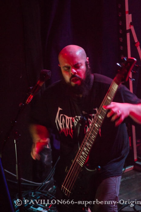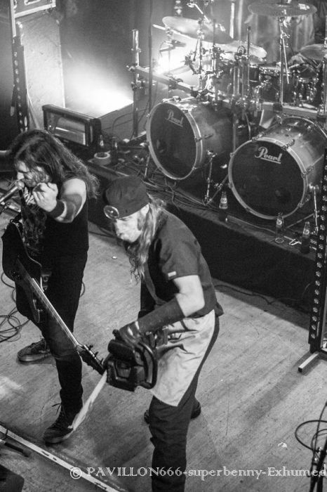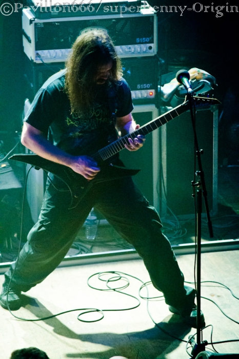 Notre affiche du soir, proposait 4 groupes de death/grind réunis pour la tournée “Hell Over Europe” de la tête d’affiche Aborted. Les suédois de Miasmal pour lancer les hostilités, suivis des spectaculaires américains d’Exhumed, Origin pour du carré et finalement les fous furieux d’Aborted. Ils ont donc choisi le Divan Du Monde où Aborted s’était déjà produit avec Benighted par le passé.Ce n’est donc pas le premier ni le dernier concert metal extrême dans cette salle, ainsi, autant les techniciens que les fans ont leurs repères. Le concert débute tôt et Miasmal est déjà en piste lorsque je rentre dans la salle. Le public est plutôt retranché, à regarder passivement et/ou attentivement, le fait est que ça ne bouge pas encore. Les suédois proposent un death assez thrash, notamment au niveau de la voix. On est pas dans du “growl” caverneux, mais plutôt dans du crié et hargneux. Le chanteur est aussi l’un des deux guitaristes, il assure avec sa tête chevelue l’empêchant de voir ses cordes et le public. Ces deux gratteux, membres fondateurs du groupe, assurent avec des soli bien heavy et mélodiques. Le bassiste fait preuve d’une prestance incroyable, notamment avec son look de redneck oldschool. Le batteur, se cache derrière ses fûts en les matraquant sauvagement.Le public commence à s’exprimer mais cela reste trop sporadique alors que le groupe termine son superbe set. Ainsi, Miasmal laisse place à Exhumed et la salle se remplit pendant les rapides balances. Exhumed est un combo venant de Californie qui envoie du bon death old-school, avec 6 albums à son actif, et qui sait faire le spectacle en live. Ceux qui ne connaissaient pas avant, ont vite compris la notion de spectacle mais aussi de gore. Avant tout, Exhumed n’est pas un groupe qui fait dans la dentelle niveau paroles, tout est basé sur une thématique du gore. D’ailleurs, Matt Harvey le leader du groupe s’en défend, en disant qu’il se sert de cette thématique de manière allégorique pour la ramener à la politique entre autre. Ce soir, Exhumed ne va déroger à la règle… Ca démarre donc très fort avec du blast, du rythme effréné, de la voix, là aussi, thrash. Par contre le bassiste, lui, complète avec une voix très caverneuse comme dans tout groupe de death metal qui se respecte. Le doublage des voix donne vraiment bien en live. Les guitares sonnent super bien, là aussi les soli et autre mélodies sont assurés avec brio. Le public est bien chaud et c’est à ce moment que le show commence. En effet, un “chirurgien” équipé d’une tronçonneuse fait irruption sur scène, il est acclamé par la foule, qui semble finalement savoir à quoi elle a à faire. Il s’agit bien d’un membre du staff d’Exhumed, qui chauffe la salle en menaçant le spectateur ébahi avec son arme. La musique repart de plus belle, et revoici notre hurluberlu qui refait surface, sans son engin motorisé, pour faire un stage dive mémorable. Cela a le mérite de vraiment mettre une bonne ambiance dans la salle.Et comme dans tout show d’Exhumed, le guitariste s’écroule brutalement, et il n’est sauvé qu’en se faisant ingurgiter de la bière par notre bûcheron/chirurgien. Evidemment c’est efficace, le guitariste se relève….pour régurgiter sur un sac poubelle prévu à cette effet dès le début du set. Même involontairement secoué par cette prestation scénique, il continue avec sa gratte en enchaînant avec un terrible solo. Après un dernier morceau, les membres d’Exhumed quittent la scène sans oublier de saluer comme il se doit les admirateurs du premier rang. L’audience, habituée ou non à ce groupe, reste de toute manière admirative de ce dont elle a été témoin! Vient ensuite Origin, groupe américain qui vient de sortir “Omnipresent” cette année. Il s’agit pour eux aussi de leur 6ième album. Leur show commence fort, le chanteur Jason Keyser utilise la scène en gesticulant avec virilité sur tout la scène.Le guitariste excelle dans l’art du sweeping, sa Jackson sonne bien aggressive. Les deux autres comparses, bassiste et batteur assure la rythmique avec efficacité. Les spectateurs, en nombre et actifs, ainsi que les lumières très sombres suffisent pour que je me délocalise à l’étage, plus calme avec une très bonne vue d’ensemble. Sur la fin du set très carré, Jason Keyser chauffe la salle avec un wall of death sans musique.Les acteurs de ce wall en sont ravis et permet à Origin de terminer dans une ambiance survoltée. Pour finir en trombe la soirée, ce sera avec l'aide de nos voisins du plat pays:Aborted. Ils profitent de cette tournée pour promouvoir la sortie de leur 8ième opus "The Necrotic Manifesto ". Sven, le leader charismatique communique avec le public en français, et leur demande de venir stage-diver, ce qu'il ne va se gêner de faire. Alors, oui, Aborted ne fait pas dans la dentelle, ça blast à la batterie, ça crie de toutes les façons, du "gruik" de porcinet au "growl" des plus ténébreux, l'ambiance est furieuse mais petit à petit un léger malaise s'instaure: Le public envahit la scène pour la squatter de longues minutes, ce qui semble saouler Sven, même s'il reste courtois. Et c'est vrai que c'est gênant lorsque qu'un chanteur, qui plus est, seul rescapé depuis la naissance du groupe, de devoir rester derrière les fans qui s'adjugent le show. Petit à petit la scène se dépeuple grâce à Sven, qui très malignement, invite Matt Harvey d'Exhumed et propose un ou 2 Wall of Death pour mettre le feu avec succès hors de la scène. Musicalement, le batteur semblait super zen, les guitaristes se rendaient coup pour coup lors des soli et le batteur était omniprésent. Le concert se termine, la sueur à coulé, la bière aussi, ça sent la transpiration, on a eu du crado, des paroles pas très fines, et oui les ingrédients du death métal étaient bien tous réunis pour réussir ce concert