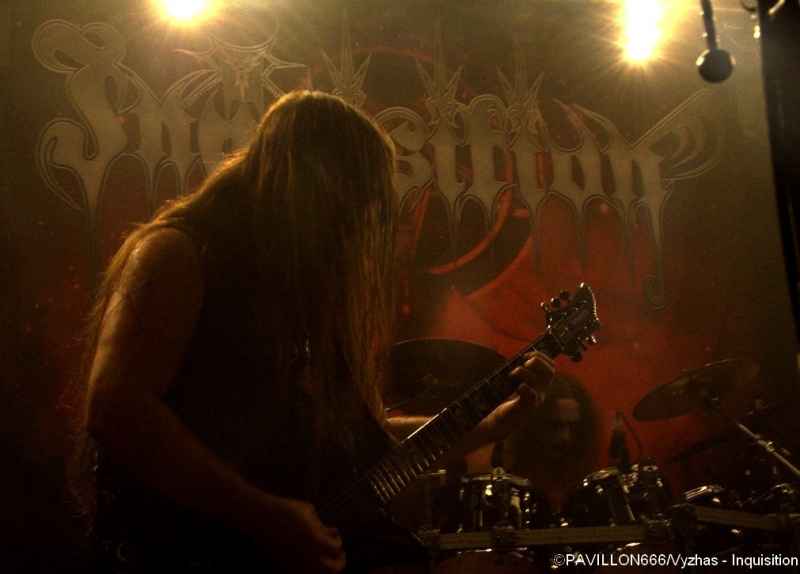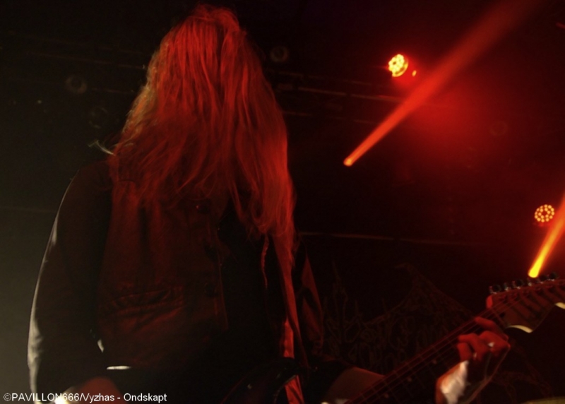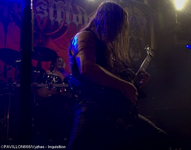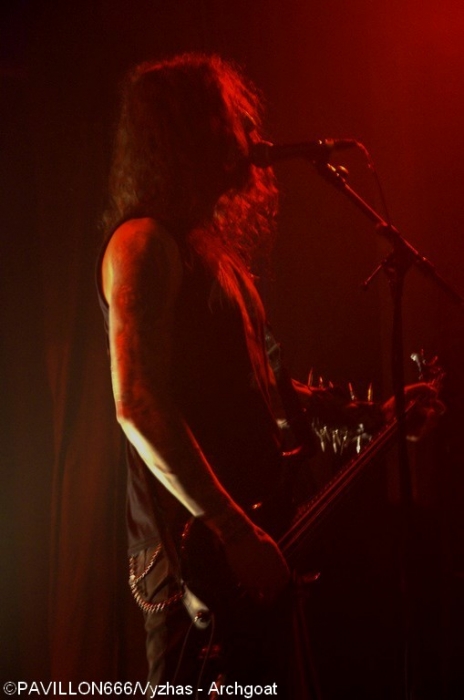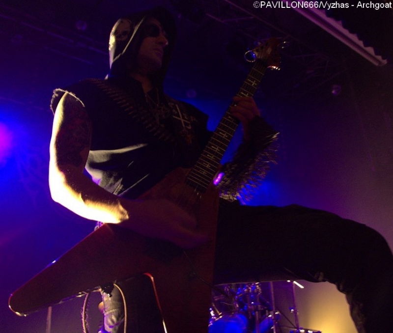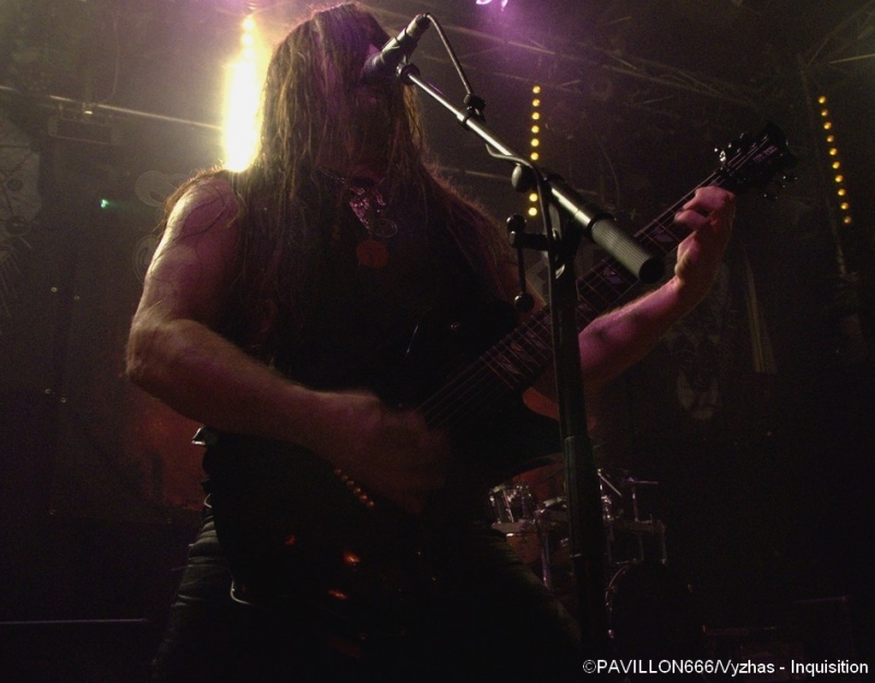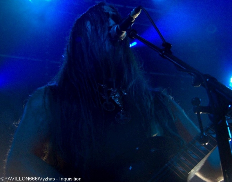 Le moins que l’on puisse dire, c’est que le show de ce soir attire du monde, et c’est dans une salle quasiment comble que Blackdeath investit la scène. Malheureusement, les russes ne font pas forte impression ce soir. Outre l’accoutrement à la fois clichesque et ridicule du vocaliste/bassiste, le quartet délivre un black « chaotique », d’une banalité déplorable et d’une pauvreté musicale ahurissante. Pour ne rien arranger, le groupe subit un son brouillon, à la limite du supportable. L’assistance est restée de marbre pendant ces quarante longues et pénibles minutes d’un show statique frôlant l’amateurisme. Un comble pour un groupe actif depuis 17 ans. Changement rapide de plateau, pour Ondskapt. Déjà de passage au Divan en première partie d’Endstille en mars dernier, les suédois reviennent interpréter dans son intégralité leur premier album « Draco Sit Mihi Dux » sorti en 2002. Pour les non-adeptes du combo, Ondskapt officie dans un black made in Sweden : une alliance subtile entre agressivité froide et mélodies pernicieuses. Ce soir, les membres arrivent assez sobrement sur scène, seul le vocaliste Acerbus débarque avec toute sa panoplie. Encapuchonné dans une grande cape noire avec des ossements pendouillant autour de sa taille, le bougre occupe la scène tel un gourou démoniaque, installant une ambiance ritualiste. Acerbus déverse toute sa haine avec des vocaux écorchés et caverneux. Pendant 45 minutes de set, les scandinaves vont enchaîner toutes les compositions de leur premier opus face à un public globalement réceptif à leur musique qui n’est pas sans rappeler Watain ou Shining. Il en ferait presque de l’ombre à la tête d’affiche principale : visiblement Archgoat est attendu comme le messie. Assez rare dans nos contrées, les finlandais défendent ce soir leur troisième album « The Apocalyptic Triumphator » fraîchement sorti le 27 janvier via notre label national Debemur Morti. Actif depuis 1989, Archgoat se réclame d’une tradition bestiale, primitive et profondément old-school de son satanic black/death. Dès les premières notes, l’immense foule se déchaîne, provoquant les premiers pogos de la soirée. Pendant quasiment une heure de set, le combo pioche équitablement dans toute sa discographie, et s’il met à l’honneur son dernier opus, il n’oublie pas de jouer des titres de « Whore of Bethlehem » (2006) et « The Light-Devouring Darkness » (2009). Le trio dispose d’un son précis et gras, faisant ressortir tout le côté entraînants de leur musique poisseuse. La voix gutturale et monocorde de Lord Angelslayer transperce ce mur de riffs de son habituel timbre abyssal. Les membres sont globalement statiques et ne communiquent quasiment pas avec le public, mais il ne fait aucun doute que celui-ci est définitivement acquis à la cause d’Archgoat. Setlist • Intro • Nuns, Cunts and Darkness • Lord of the Void • Apotheosis of Lucifer • Blessed Vulva • Grand Luciferian Theophany • Day of Clouds • Goddess of the Abyss of the Grave • Goat and the Moon • Dawn of the Black Light • The Dawn of the Antichrist • Rise of the Black Moon • Hammer of Satan La salle est désormais pleine à craquer pour accueillir Inquisition comme il se doit. C’est la troisième venue à Paris en un an pour le duo infernal, le succès de leur dernier album « Obscure Verses for the Multiverse » (2013) et leur signature chez les frenchies de Season of Mist ne sont sûrement pas étrangers à cet engouement pour la musique des colombiens sur notre territoire. Ambiance cosmico-satanique ce soir avec Dagon et son camarade marteleur Incubus. Les deux compères bénéficie d’un son puissant et lourd, quoique un peu fort, mais ne boudons pas notre plaisir, car il est grand pour tout fan du groupe ou de black qui se respecte. Pendant 1h30 de set, les colombo-américains vont représenter l’ensemble de leur discographie, mettant bien évidemment le petit dernier plus en avant, avec pas moins de quatre morceaux. Tous les titres vont se succéder sans temps morts et sans accroc. Dagon et Incubus sont en forme ce soir faisant preuve d’une précision éblouissante. Pourtant seul sur scène, le charismatique vocaliste/guitariste occupe parfaitement tout l’espace scénique, et déclame ces incantations de son timbre unique sorti d’outre-tombe. Les fans sont aux anges, écoutant religieusement l’Inquisition. Certains ferment les yeux ou lèvent les mains vers le ciel, littéralement possédés par les sonorités cosmiques de la formation. C’est complètement ruisselant que le duo finit cette dantesque et mémorable prestation sous une salve d’applaudissements amplement mérités. Setlist • Force of the Floating Tomb • Ancient Monumental War Hymn • Dark Mutilation Rites • Master of the Cosmological Black Cauldron • Astral Path to Supreme Majesties • Where Darkness Is Lord and Death the Beginning • Those of the Night • Embraced by the Unholy Powers of Death and Destruction • Command of the Dark Crown • Arrival of Eons After • Desolate Funeral Chant • The Realm of Shadows Shall Forever Reign • Infinite Interstellar Genocid Merci à Gunnar de Season-of-Mist pour l'accréditation/pass photo accordée à pavillon666 sur ce concert. Pour des raisons de confidentialité YouTube a besoin de votre autorisation pour charger. Pour plus de détails, veuillez consulter nos Politique de confidentialité. |