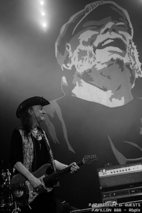 Le public était enfin chaud, c’était le moment de rentrer dans le vif du sujet. Après une brève pause, c’est Sven qui est revenu sur scène, guitare à la main. Cette fois-ci il était accompagné de son autre famille. Des visages plus familiers pour le public également. Xavier à la batterie, Stef à la basse et le Schultz géant, au-dessus de tous, qui supervisait les opérations. N’ayant pas trouvé de guitare à l’échelle de Schultz, le groupe a préféré confier le travail à Tom. Ce dernier est également connu sous le nom de Tommy Gun, actuellement guitariste de The Run. Mais qui allait bien pouvoir chanter les paroles issues du répertoire complet de Parabellum ? Au lieu de filer ce rôle à une personne, pourquoi ne pas proposer à toute une tripotée d’amis et proches de Schultz de faire le boulot ? C’est donc une flopée d’artistes, connus du public pour certains, peu ou pas connus pour d’autres, qui se sont relayé le micro durant tout le set.