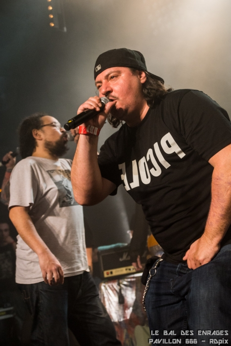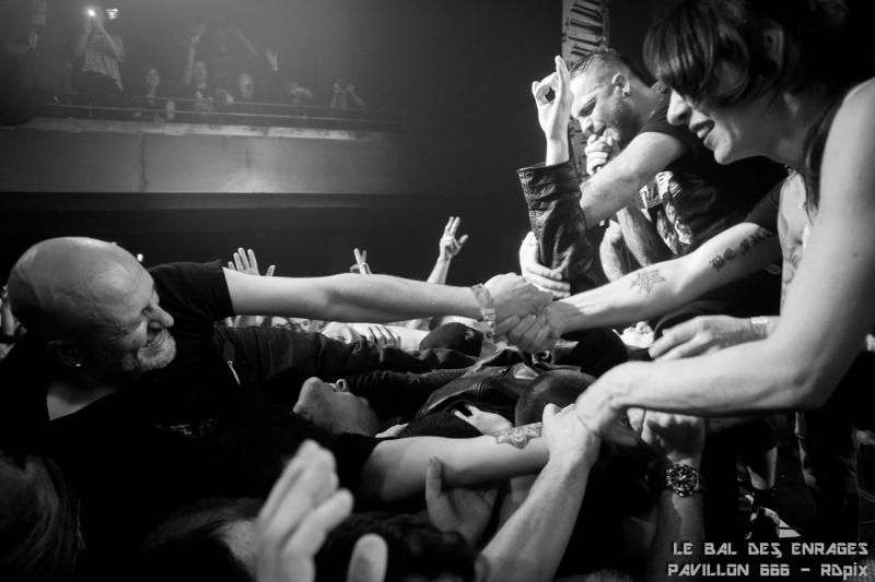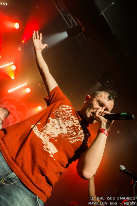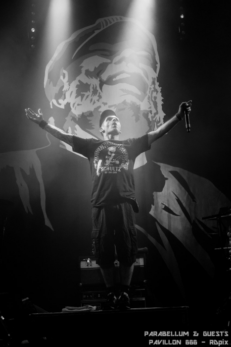 C’est tout naturellement Niko (Tagada Jones) qui a entamé les hostilités avec « Osmose 99 ». Le public était en ébullition dès les premières notes. Les pogos et les premiers slams ne se sont pas fait attendre. Les premiers d’une longue série qui n’a pris fin que trois heures plus tard. Reuno (Lofofora) a pris le relai pour « St Lazar ». La première grosse surprise fut de voir Sanseveriono prendre le micro pour nous chanter « Saturnin ». A ce moment, l’ambiance dans la salle est encore monté d’un cran. On a pu voir passer également Kick au micro et à la guitare (pour info, Kick avait écrit les paroles de plusieurs morceaux de Parabellum). Maroucha est aussi remontée sur scène pour prendre le micro. On a pu voir également Mado, la compagne du batteur, Poun (Black Bomb A), Kick (non pas celui-là, l’autre, celui qui joue de l’harmonica).