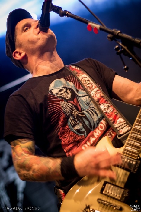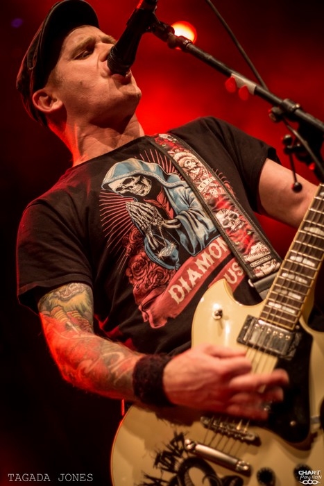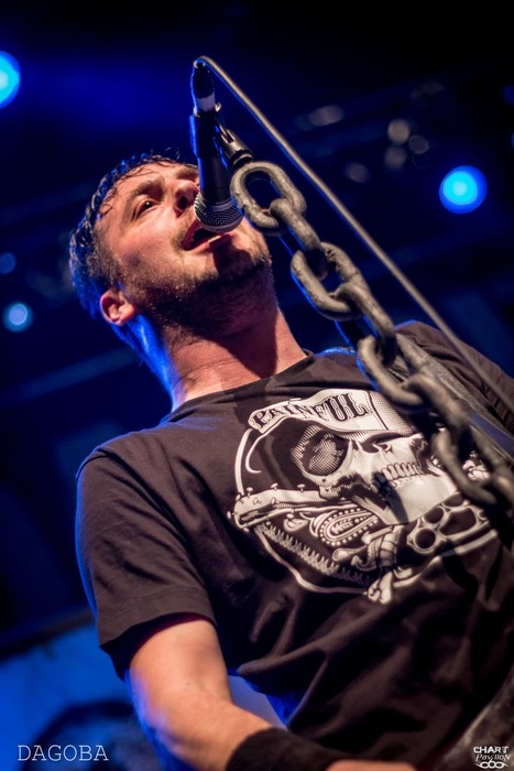 Ce sont les Rennais de TAGADA JONES qui concluent cette série de groupes français. Doit-on encore vous présenter ce groupe ? Depuis 1993, le combo écume les scènes et les festivals français en long, en large et en travers. Ayant son propre studio, TAGADA JONES dispose d'une liberté totale pour enregistrer ses albums et ne s'en prive pas le moins du monde ! Le combo nous donne l'impression d'être en activité permanente depuis un peu plus de 20 ans et c'est tant mieux ! La scène française a toujours eu une scène alternative de qualité et TAGADA JONES en a naturellement pris le leadership en compagnie d'autres formations telles que LOFOFORA ou PUNISH YOURSELF. Bref ! La France a besoin de ces groupes pour porter un certain message comme en témoigne le dernier clip du groupe, « Je suis démocratie » qui met en musique leur réaction face aux attentats de Charlie Hebdo en janvier dernier. Et les fans apprécient comme en témoigne encore une fois ce parterre littéralement ravagé du Transbordeur. La sauce prend très vite avec « De L'Amour et Du Sang », « L'instinct Sauvage » ou plus loin « Zéro de Conduite » ou « Cargo ». L'arrivée de Waner à la basse a redynamisé l'ensemble avec un jeu de scène impressionnant auquel Stef à la guitare n'a pas eu d'autres choix que de s'adapter en se mettant à d'avantage se déplacer sur scène, mais avec un plaisir affiché. Même si Niko reste encore accroché à son pied de micro, celui-ci ne manque pas de présence et de charisme. Je reste néanmoins avec une petite impression de rester sur ma faim après ce set pourtant énorme. Peut-être est-ce la salle un peu grande ou la profusion de groupes mais pour ma part les prestations au Ninkasi Kao de Lyon ont été tellement intenses que cette grande scène du Transbordeur coupe un peu la proximité habituelle avec le groupe. Mais bon, TAGADA JONES est une valeur sûre et cela a encore été prouvé ce soir.