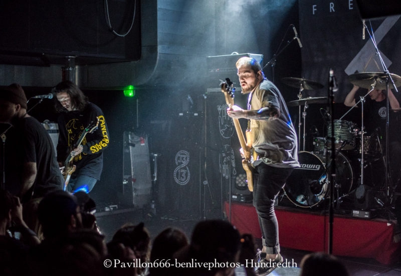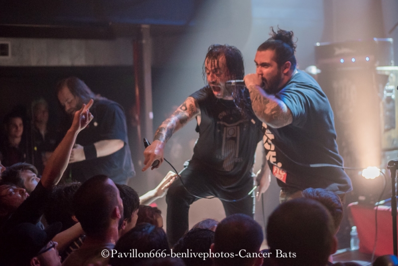 The Hundredth propose un metalcore/hardcore hyper énergique. Le chanteur Chadwick Johnson, n’hésite pas à descendre dans la fosse pour partager le micro. Leur bassiste est encore plus énergique. Il ne cessera de sauter dans tous les sens, sans réellement souffler. Ces deux là sont donc parfaits pour aider à mettre le feu dans la fosse, et nos jeunes (et moins jeunes) spectateurs n’en demandent pas tant pour se faire prier. Les autres membres du groupe ne sont pas en reste non plus. Leur son est surprenant. Je le trouve très agressif voire hardcore avec peu de passages “ambiant” chers au metalcore. Mais en écoutant sur le net, je comprends que non, Hundredth fait bien du metalcore assez traditionnel avec parfois des voix claires mais cela reste peut-être plus agressif que d’autres groupes. En tout cas leur set, composé d’un son agressif allié à une prestance virevoltante fut la parfaite alchimie pour mettre les fans dans les meilleures conditions pour accueillir les Canadiens de Cancer Bats.