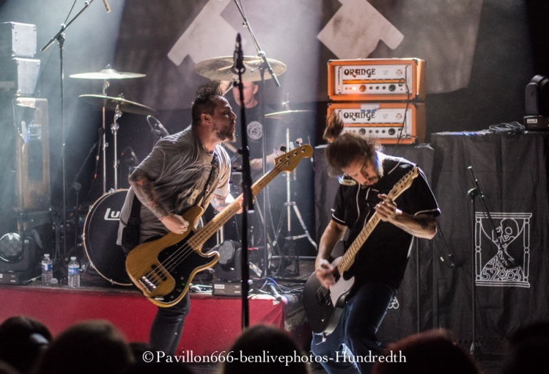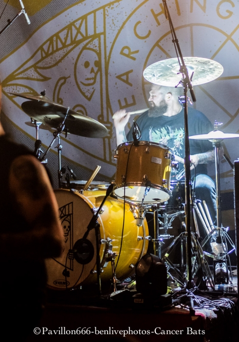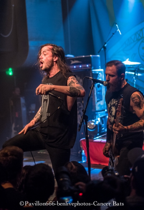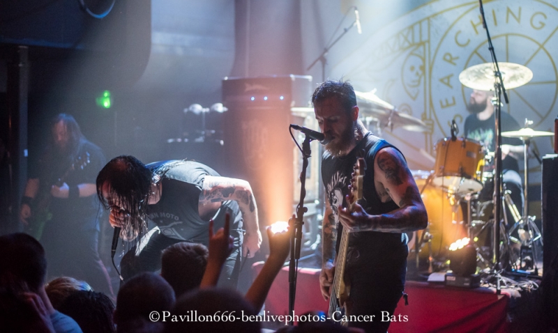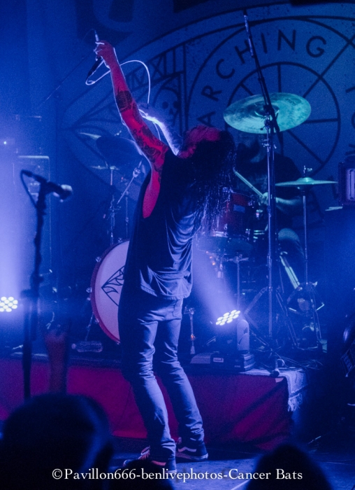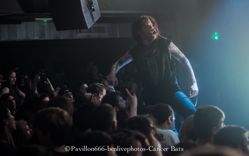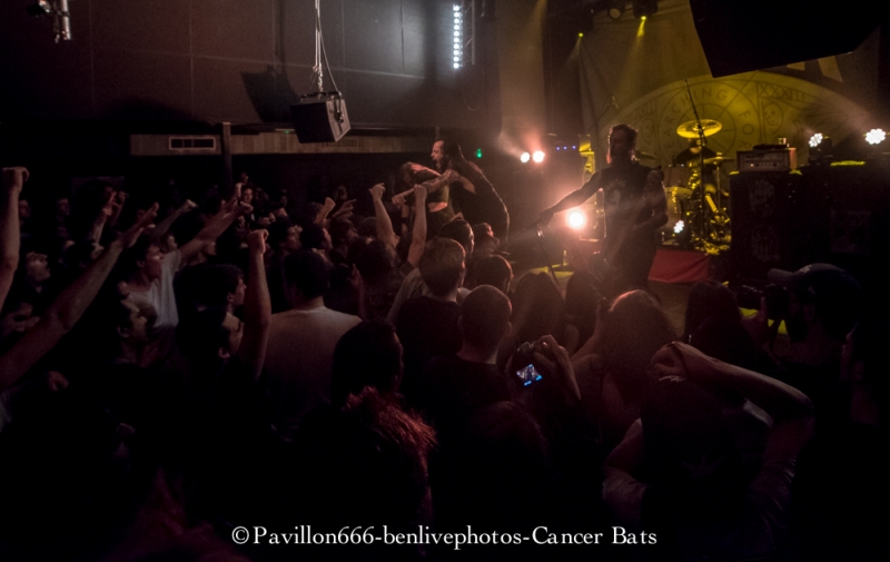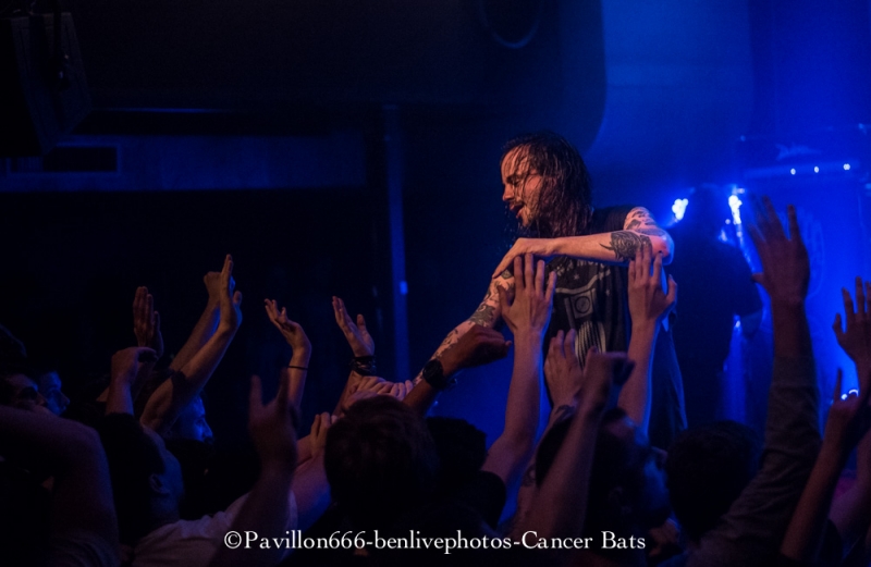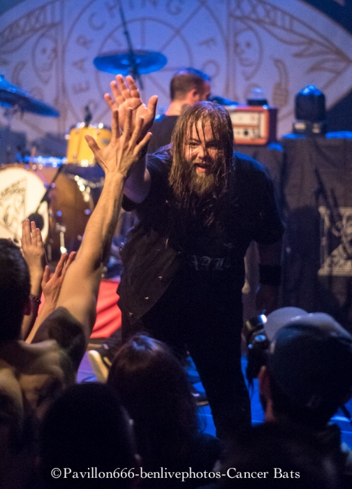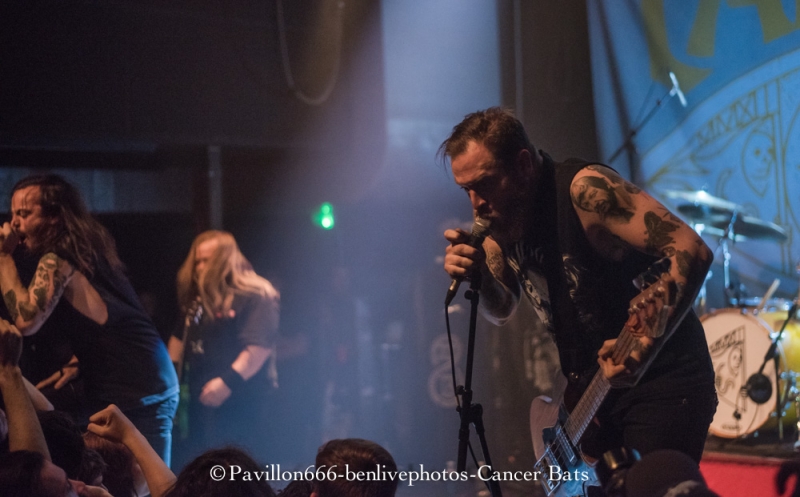 Les spectateurs ont une vingtaine de minutes pour se reposer. Parallèlement, la salle se remplit nettement. Même si Cancer Bats n’est pas tête d’affiche ce soir, il n’en reste pas moins que les Canadiens sont internationalement reconnus. L’audience vient aussi pour les voir. Cancer Bats est composé de 4 lascars bien remontés sur scène. A commencer par leur chanteur charismatique Liam Cormier, Scott Middleton à -l’unique- gratte, Mike Peters à la batterie et pour finir Jaye R. Schwazer à la basse ainsi qu’aux backgrounds vocals. Leur tournée a pour but de promouvoir leur nouvel album “Searching for Zero” sorti en mars. Dès les premiers accords, c’est l’effervescense. Leur metal punk embrase la foule qui gesticule dans tous les sens. Leur son reste assez original avec un mélange de metal et de punk mais aussi des influences assez sludge/stoner, notamment pour la guitare. Scott Middleton, le gratteux semble être accordé assez bas, le son est assez gras et crunchy. Il utilise aussi beaucoup d’harmonies naturelles et artificielles, ce qui donne une vraie bonne touche et permet de bien distinguer sa gratte. Au chant, Liam est plein de fougue. Ses cris sont juste plein de rage et de hargne. Il est aussi secondé par Jay, le bassiste, qui lui aussi ne se retient en rien et hurle de toutes ses tripes. Liam n’hésite pas non plus à s’adresser aux spectateurs en français pour raconter diverses anecdotes qui nous font sourire. La batterie est surélevée, mais tellement garnie que l’on a du mal a voir le batteur, du moins de mon point de vue. Par contre on l’entend parfaitement se déchainer dessus comme un forcené pour assurer ses rythmes qui ne semblent jamais ralentir. Cancer Bats nous fait une reprise de “Sabotage”, titre mythique d’un groupe mythique : Beastie Boys. Ce morceau a tout simplement envoyé le public dans une autre dimension ! Stagedive, headbanging, toute forme d’expression a été passée en revue !