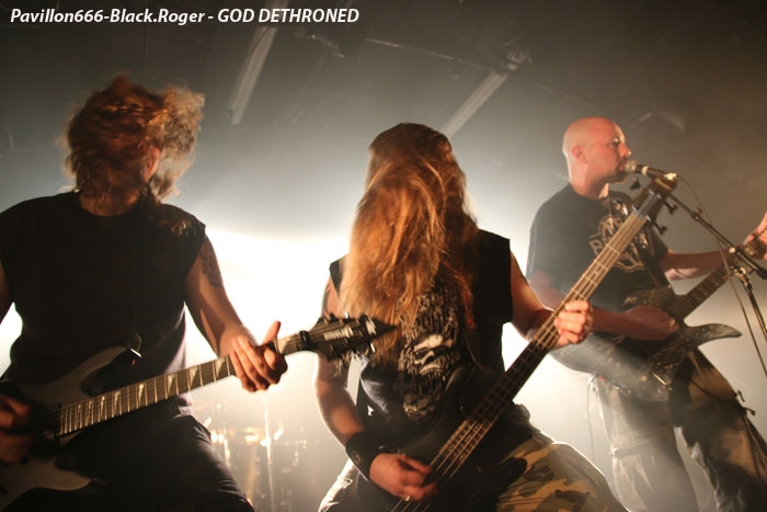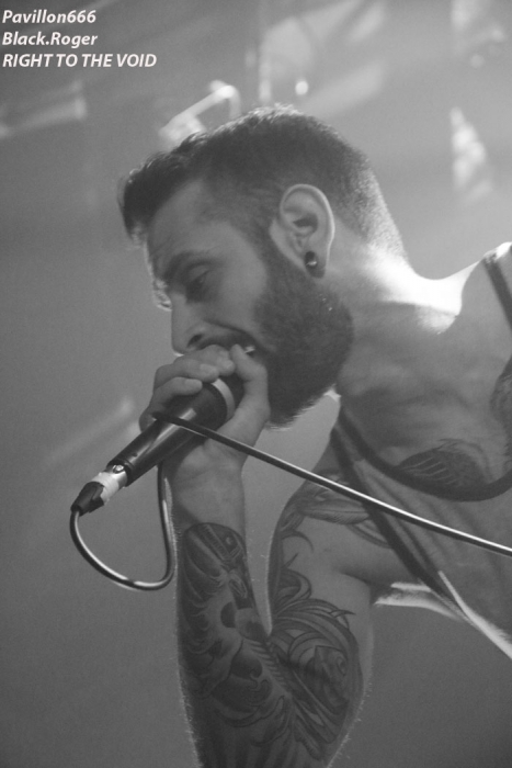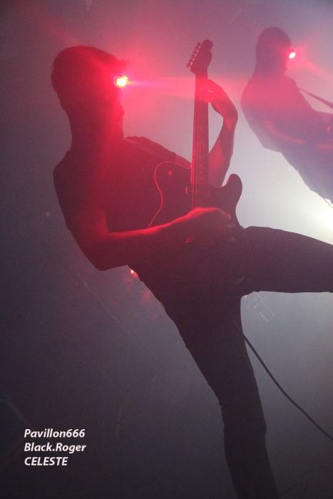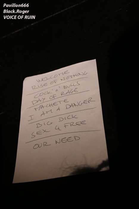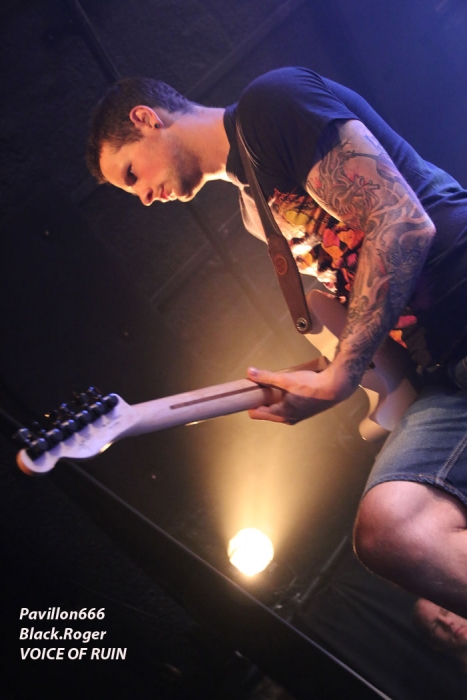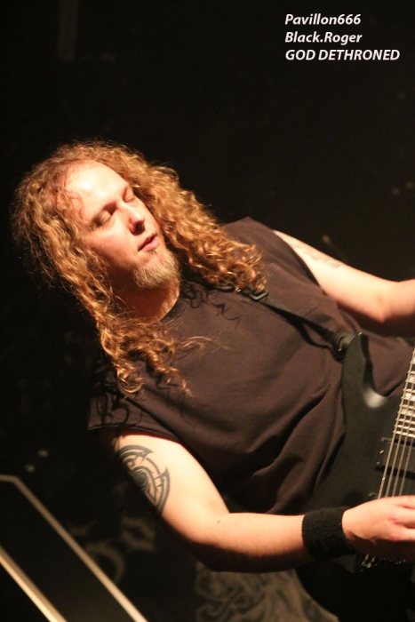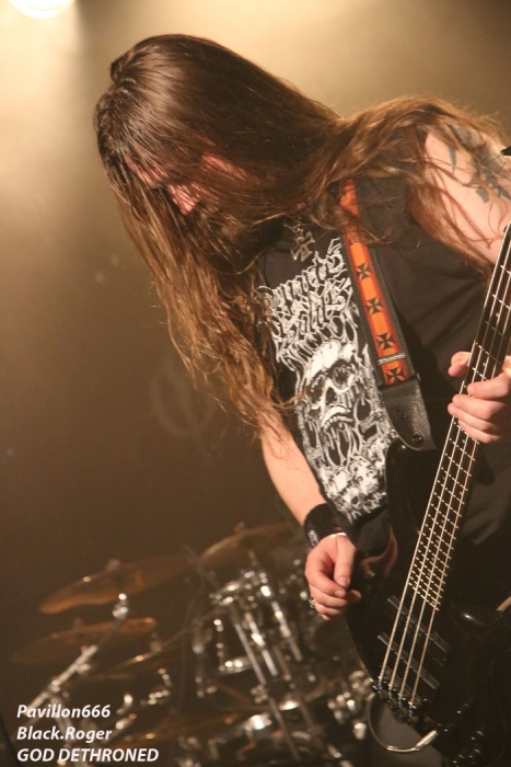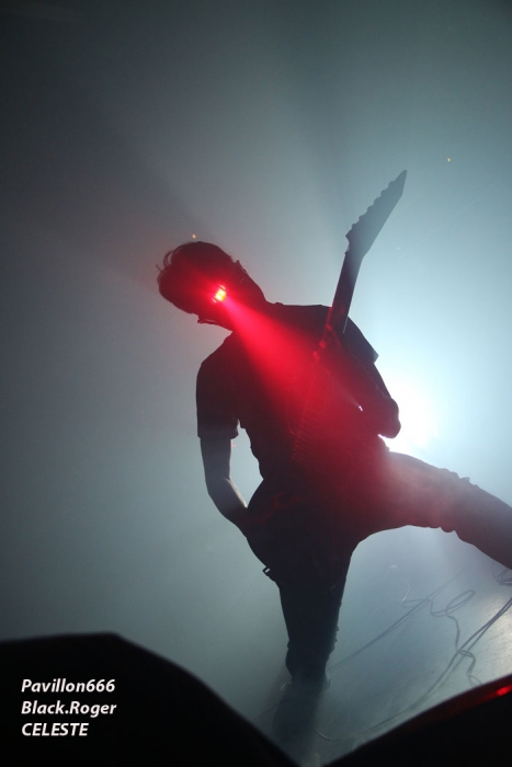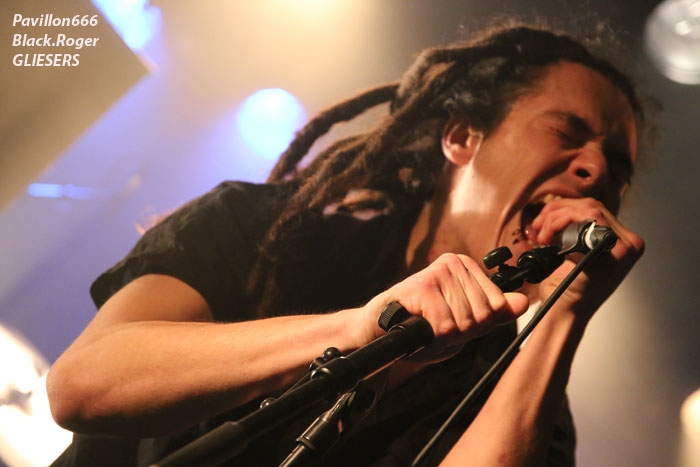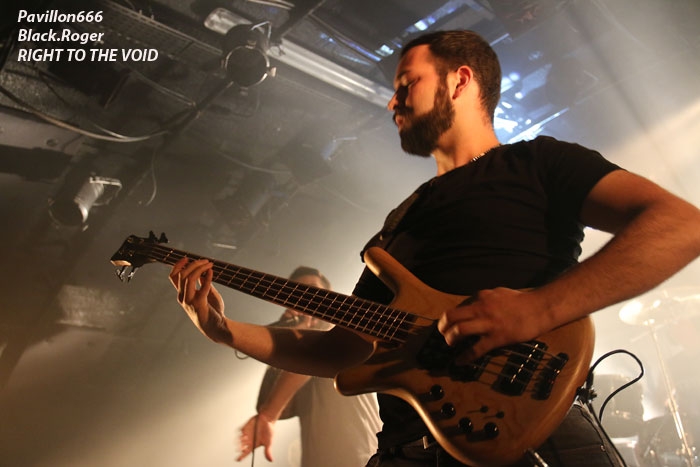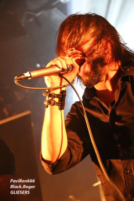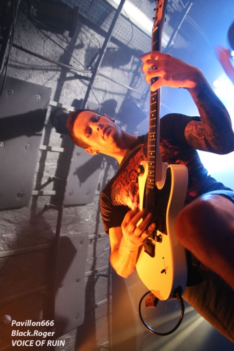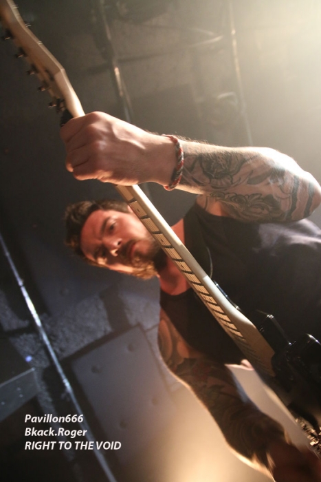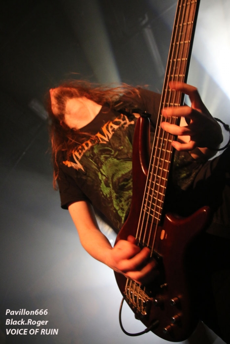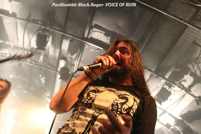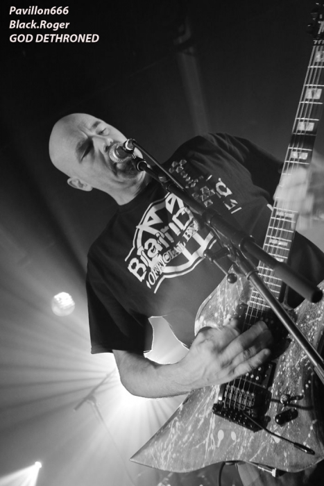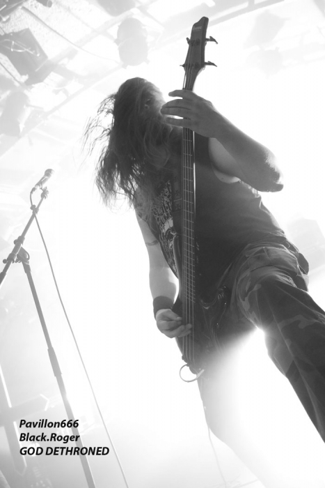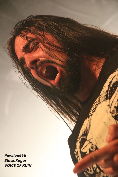 Ce vendredi soir 8 Mai nous sommes à 19heures devant l’entré des lieux, impatients d’assister à cette première soirée où nous attendent de pied ferme les membres de l’Association Wake Up Dead et l’Association Luciol gérante des lieux. Au menu, dans la cour devant l’enrrée, on nous propose de l’Hypocras et du Morterum en apéritif au stand de l’association organisatrice. Et dans la salle le menu musical sera ce soir alambiqué et brutal avec les bataves de GOD DETHRONED, les Lyonnais de CELESTE, les (petits) Suisses de VOICE OF RUIN, les Sudistes de RIGHT TO THE VOID et les grenoblois de GLIESERS, que la fête commence donc ! Premier groupe à monter sur le ring (sur la scène pardon) GLIESERS de Grenoble qui a la lourde tâche d’ouvrir la soirée. Ce combo de post-metal, prog-metal possède deux frontmen, première originalité. En second lieu leur dérive prog n’est jamais ennuyeuse. Ca joue fort, ça joue bien avec beaucoup de puissance à certains moments faisant suite à des passages atmosphériques bien sentis. Les compositions sont variées et le paysage musical installé par cette formation dauphinoise est remarquable et riche d’idées. Ajoutez à cela des musiciens talentueux et vous obtenez un set consistant et de qualité, alors on aime tout simplement. Pour la suite, RIGHT TO THE VOID ne va pas faire dans la dentelle avec son death mélodique épicé de thrash et aromatisé avec un zeste de hardcore. Et tout ça donne quelque-chose de costaud, de brut de décoffarge en live. Un EP et un premier album « Kingdom Of Vanity » ont fait découvrir ce groupe du sud mais ce fut sans plus En effet les voir sur scène apporte une certaine énergie aux compositions avec une bonne mise en place des musiciens, mais au bout de seulement trois ou quatre titres une certaine linéarité pointe le bout de son nez. Tout se ressemble trop et puis un certain manque d’originalité se fait jour également car ce genre de death-thrash à la Suédoise est trop courru en ce moment. Trop de formations se sont engouffrée dans cette brèche avec en plus un certain copier/collé d’un Gojira par exemple pour ne pas le nommer. Alors, rien de grave, le groupe a les moyens d’évoluer vers quelque chose de plus particulier, sortant plus de l’ordinaire et alors peut-être que la chrysalide actuelle deviendra papillon, qui sait ? Set-list en photo Place maintenant au deathcore agricole avec nos amis Suisses de VOICE OF RUIN qui ont mis dans leur brouette un nouvel EP « Consumed » à nous proposer mais pas que… En effet nos Helvètes favoris ont de la ressource du point de vue compostions et ont de l’expérience scénique à revendre ayant même écumé le pays du soleil levant en compagnie de The Black Dahlia Murder il n’y a pas si longtemps Alors, n’y allons pas par 4 chemins, Voice of Ruin envoie du « steak » comme dirait mon amis le deathcoreux fou. C’est un peu simpliste je vous l’accorde de présenter comme cela leur set, mais tout y est, ça joue fort, ça joue bien, avec des compositions accrocheuses tirées à bout portant sans répit sur un public qui pour la première fois de la soirée se met à bouger vraiment. Wall of death, Circle Pits à foison donc ce qui veut dire que Voice of Ruin a mis le public de Mâcon (et d’ailleurs aussi) dans sa poche tout simplement, il n’y a pas photo ! Alors conseil d’ami, si jamais cette formation issue des fermes Vaudoises passe près de chez vous, courrez, mais courrez-donc à pied, à cheval ou en tracteur, à leur concert vous m’en direz des nouvelles ! Set-List en photo Changement brutale d’ambiance ensuite avec la venue de CELESTE dont les musiciens se présentent à nous dans le noir complet avec simplement des frontales équipées de leds rouges qui indiquent présence et mouvements avec un peu de fumée aussi pour ce brouillard céleste (sic). Les Lyonnais nous plongent dans une atmosphère à la Neurosis soit, mais en y ajoutant une bonne part de sludge qui vous colle aux semelles du cerveau. Pas facile d’entrer dans le monde de Celeste, mais une fois la porte ouverte de notre esprit on se laisse emporter sans résistance dans un univers glauque entre black-metal et doom. Le son est fort, très fort, du coup il en devient presque brouillon à certains moments car tout grésille, tout crépite dans les amplis. Rien à voir donc avec l’écoute de leurs enregistrements studios dans votre cave. Mais ne nous arrêtons pas à ce détail peu important au final. L’important étant d’apprécier ce métal noir comme de l’encre, étouffant par moments avec des guitares saturées, des voix d’un autre monde, une ambiance funéraire quelque fois, une intensité rare même dans les passages plus calmes et une originalité à toute épreuve. A la fin du set on peut se poser la fameuse question, qui suis-je, où vais-je, dans quel état j’ère ? Celeste arrivera-t-il à recréer cette ambiance au prochain Hellfest ? Pourquoi pas, nous le verrons bien le moment venu. En tous cas ce soir les Lyonnais ont placé la barre bien haute dans le post-core, post-métal, post-quelque chose, et ce fut bien. GOD DETHRONED va ensuite réveiller en quelque sorte nos cerveaux embués avec son death métal cousin du black, les croix renversées sur scène annonçant la couleur. Henri Sattler chanteur/guitariste et fondateur du groupe reste le seul membre d’origine surfant sur la mer démontée de cette formation qui a eu ses moments de gloire par le passé, mais aussi un certain silence live durant quelques années. Du coup la formation death/black des pays-bas a perdu quelques fans en cours de route. Alors ce soir je me demande ce que cela va donner les ayant vu pour la dernière fois en 2006 au marché Gare de Lyon en ouverture de Bolt Thrower et ayant appris en 2011 la dissolution du groupe. Mais GOD DETHRONED renait de ses cendres comme le phénix de la mythologie grecque après 24 ans d’existence et une d