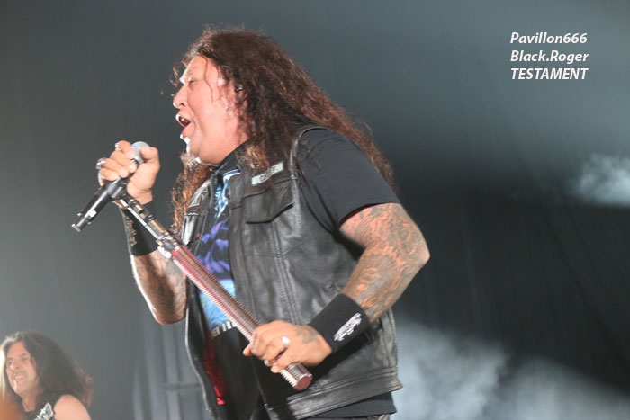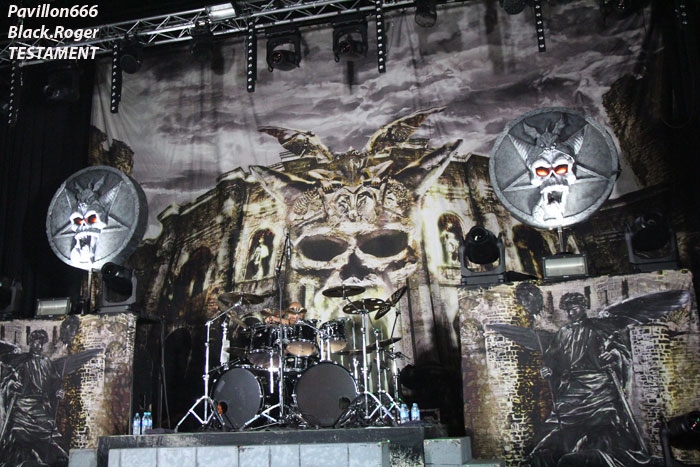 Second gros « morceau » de la soirée, voici après un certain temps d’attente tout de même, les vétérans du Thrash californien TESTAMENT qui se présentent à nous devant un décorum très remarqué avec un line-up de rêve à savoir Chuck Billy, Eric Petterson, Alex Skolnick, Steve Di Giorgio et Gene Hoglan.