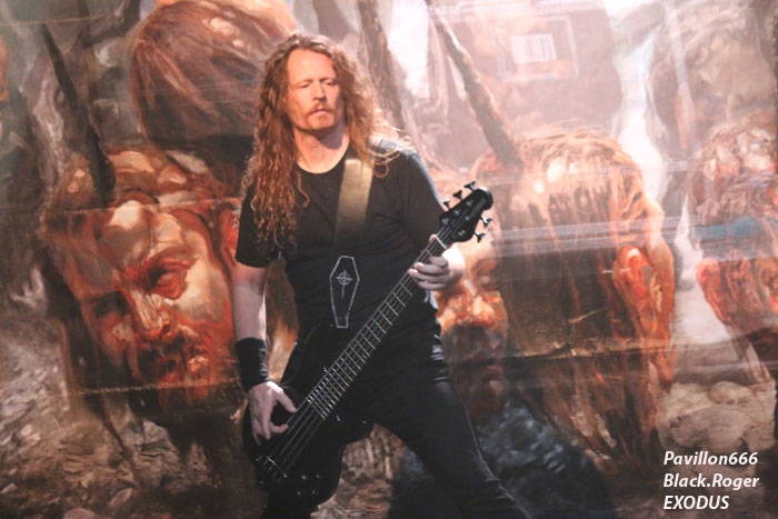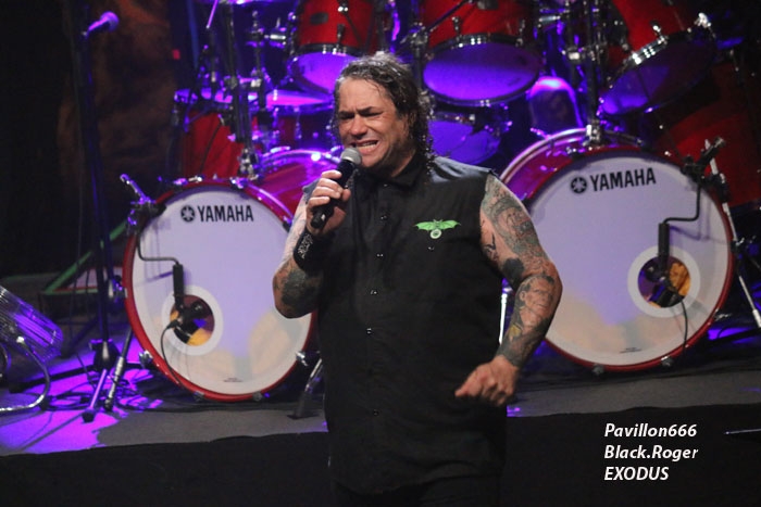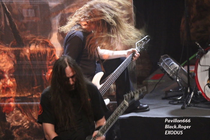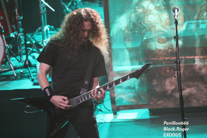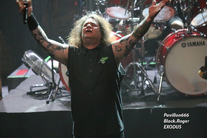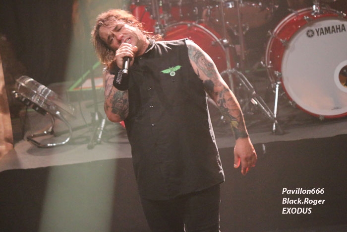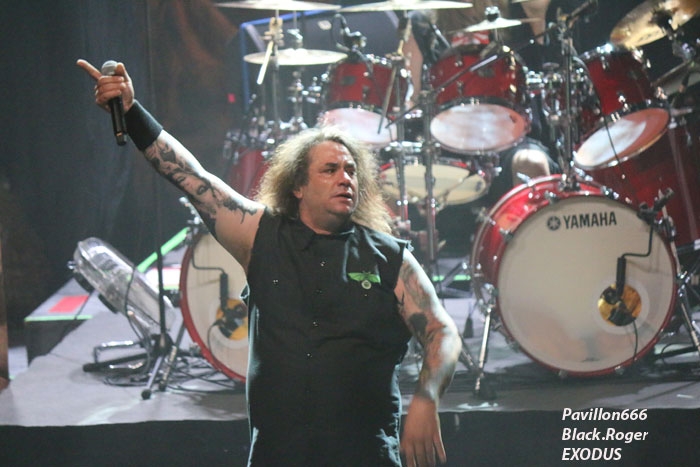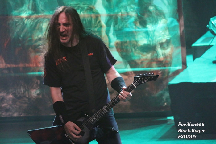Le guitariste Gary Holt (orange juice California sic) fidèle au poste depuis le début et Steve « Zetro » Souza revenu au chant après plusieurs aller-retours, se sont adjoint des acolytes puissants ne faisant pas dans la dentelle. Fatalement ce soir, le groupe va nous assommer avec son thrash destructeur de neurones. Les riffs des deux préposés à la six cordes Altus et Holt sont impressionnants d’efficacité et de puissance avec un Steve nous faisant profiter de son agressivité millésimée, micro en main.