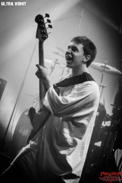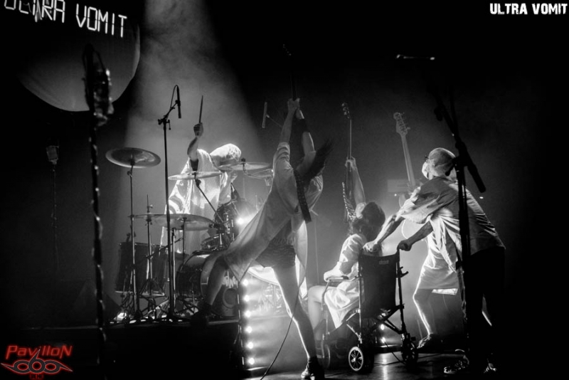 Je récupère mon pass et pénètre dans la salle de l’Espace Culturel de Rombas. Première mauvaise nouvelle : pas de crash barrière, deuxième mauvaise nouvelle : c’est déjà bondé de monde à l’intérieur. Mesurant un mètre moins vingt les bras levés sur un tabouret j’aime autant te dire que la tâche va s’avérer compliquée pour moi. Mais qu’importe je braverai la foule en délire pour t’avoir des photos lecteur. Ou pas on verra. La première partie est assurée par les Vosgiens de DOG’N’STYLE. Rock stoner aux influences multiples (heavy entre autres). Une chose est certaine ils ne manquent pas d’énergie et leur set bouge. J’ai un peu de mal à adhérer au départ mais leur envie, et leur enthousiasme semble contagieux et je me surprends à remuer la tête. A revoir je pense dans un autre contexte (oui j’étais là pour Ultra Vomit, j’aime l’humour grinçant et gras même si je ne collectionne pas encore les canards). Il y a du dynamisme, du potentiel et je pense que je vais m’atteler à approfondir ma connaissance quant à leur album. Je pensais que les personnes massées devant la scène bougeraient pour se désaltérer entre les deux groupes, histoire que je puisse me faufiler tel un ninja… mais non ils sont tous restés là. Bref on repassera pour des photos en conditions optimales ah ah ah… #RireJaune On va se débrouiller comme on peut. Une toile de projection circulaire est présente au-dessus de la scène. Le logo de la Fox apparaît mais façon Ultra Vomit. On ne lit pas « 20th Century Fox » mais « UV Ultra Vomit ». Le nom du groupe apparait ensuite en digital, puis un pouls retentit. Les Ultra Vomit débarquent sur scène en fauteuil roulant, reliés à des perfs (bouteilles de plastiques !), en boitant, se tenant aux pieds des « perfs ». Bref ils ont plus l’air sur la fin qu’autre chose. Un infirmier leur apporte leurs « médicaments ». Le pouls s’accélère et voilà nos Ultra Vomit requinqués en moins de deux. Nous voilà partis dans l’univers d’Ultra Vomit où se mêlent finesse, poésie et délicatesse. Non je déconne ! Nous avons entre autre été les cobayes d’une expérience surnaturelle durant laquelle Fetus nous a hypnotisés, si ! si ! je te le dis. (Bizarrement depuis ce concert je n’écoute plus qu’Ultra Vomit…) Merci à Julie de l’Espace Culturel de m’avoir permis d’accéder au balcon pour quelques clichés. J’assisterai donc d’en haut à l’appel du groupe qui cherche quelqu’un pour monter sur scène. Un jeune homme sera l’ « heureux » élu. Le groupe lui demande quel titre il souhaiterait chanter avec le groupe. Réponse : « Je collectionne les canards (vivants) ». C’est là que ça se gâte pour l’élu mais que nous (les autres) on s’est bien marré. Le groupe est ok mais impose une version gruik gruik. Kevin (le jeune homme ndlr) s’en sort tant bien que mal mais Fetus décide que c’était pourri et qu’il a gâché la chanson. Il le renvoit dans la fosse. Et lui dit « Tu sais comment on appelle les gars comme toi ?? » Et forcément le public a hurlé « Pauv’connaaaaaaaaaard » !!! Jolie transition ! Autre grand moment de la chanson française : la « minute Manard ». Manard le batteur du groupe délaisse ses fûts pour prendre un micro. Il est remplacé à la batterie par Flockos, guitariste à crête de son état, qui va s’avérer plutôt bon à la batterie d’ailleurs ! Il nous explique qu’il aurait bien chanté mais que des rumeurs persistantes circulent, et que ces rumeurs diraient qu’il aurait une voix de m****. Forcément le public lui fait une ovation et notre cher Manard se décide donc à chanter. Sauf que plus de son peu de lumière. Manard accuse les ingés lumières et sons de complot et quand tout revient à la normal nous offre un titre d’anthologie : « Ingé lumière et ingé son » (sur l’air de « Poupée de cire poupée de son» de France Gall). Bien évidemment il y aura un rappel et bien évidemment ils ne pouvaient nous laisser sans ce titre phare, et ils concluront donc le concert avec le fameux « Je collectionne des canards (vivants) », repris en cœur par tout le public. Le groupe nous a offert ce soir un concert terrible. Humour gras à souhait, déconnade, metal, tout y était. Parmi la setlist : Une souris verte, I Like to Vomit, Je collectionne des canards (vivants) , Pauv’connard, Jack Chirac… Sans oublier les échanges avec le public tout au long du concert, le tout dans une ambiance plus que festive. Merci à l’équipe de l’Espace Culturel de Rombas (avec mention plus plus pour Julie) pour leur fort sympa et l’accred ! Merci à Ultra Vomit pour ce très bon moment. Je reviens bientôt pour te raconter TESTAMENT, stay tuned… |