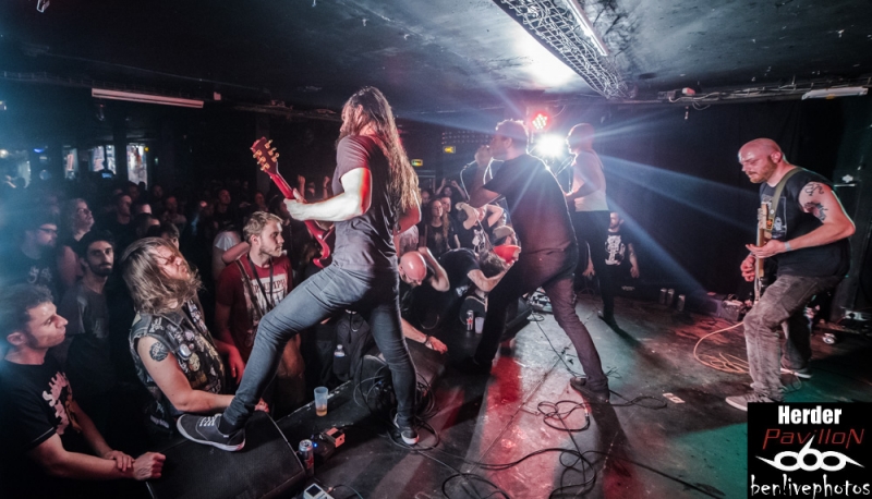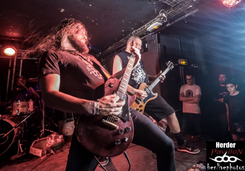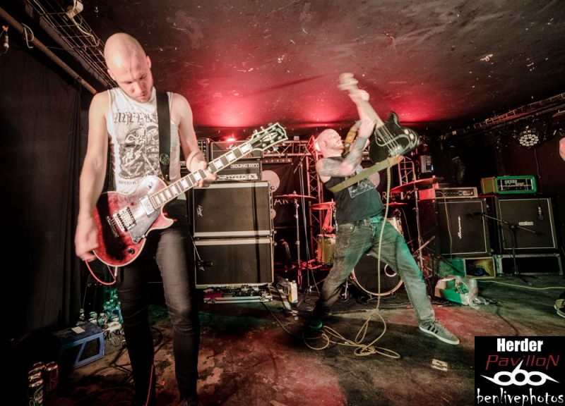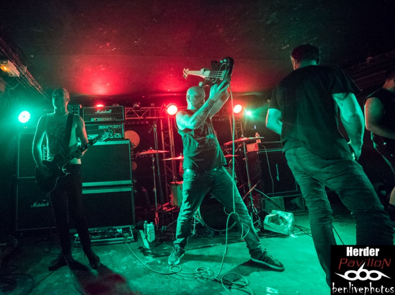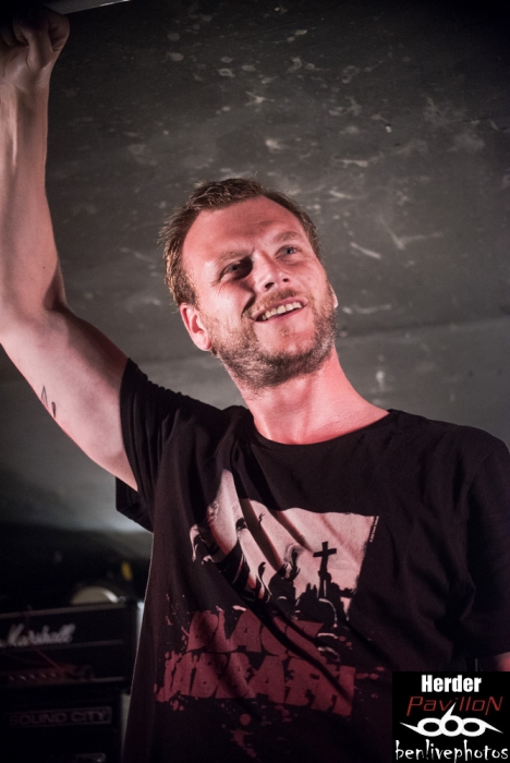 Sous un soleil de plomb, je me rends au Glazart, déjà bien garni par un public de metalleux qui se rafraîchit à la bière en écoutant le groupe Hooten Halers qui joue son blues en plein air. J'arrive un peu tard pour apprécier convenablement leur show mais la chaleur, le blues, la sueur ainsi la plage aménagée nous mettent quand même dans une ambiance bien lourde, bien "grasse". Las de leur prestation à cause de la canicule, ils nous inviteront à rejoindre le show officiel qui commencera par Joe Buck Yourself. Découverte totale pour moi, je rentre dans la salle vide mais avec une scène déjà prête. Joe Buck débarque sur scène avec son électroacoustique. Visage ridé par le temps et peut-être l'alcool, crête sur le crâne, ce grand sec est une gueule avant tout. Ce type semble avoir un sacré caractère. Il joue du blues en tapant sur un case de guitare aménagé en guise de grosse caisse. La voix est potable, la guitare très bien mais cette fameuse grosse caisse qui n'envoie pas le son aura pour effet de l'énerver et il s'en prendra aux ingé son. L'ambiance est donc un peu délétère mais le public semble apprécier. Les titres s’enchaînent bien. Ses fans reprennent les plus populaires et, excédé par le manque de son de sa caisse de fortune, il se décalera loin de son micro pour jouer un titre à proximité du public. Il finira tout de même son set plus détendu car le son semble mieux revenir. Sacré caractère ce Joe Buck mais aussi sacré zicos ! Après un break de 20min c'est Herder qui monte sur scène. Là autre style. Herder c'est un batteur, un bassiste, un chanteur assez baraqué et surtout trois guitaristes. Rien que sans brancher les instruments, on sait que ça va décaper. Le chanteur apostrophe le public qui s’amasse devant la scène prêt à en découdre. Il faut dire que leur sludge est quand même bien énervé et permet de bien faire bouger les groupies. Tous les membres se donnent à fond et partagent bien avec le public. Même le batteur quand même assez caché par ses comparses, sait se mettre en avant en tabassant comme un furieux ses caissons. Le set est tout simplement super carré et très professionnel. Il est l'heure de voir jouer Eyehategod ... ou pas ... En effet, l'orga nous annonce en deux fois que le groupe, bloqué par les ferries en Angleterre, arrivera avec pas mal de retard. Après s'être retrouvé dans mon fief clermontois au lieu d'arriver au Motocultor, Eyehategod va devoir commencer son set assez tardivement. Pas forcément cool pour eux au final. Mais voilà, Eyehategod c'est une légende. Ce n'est pas un retard qui va les empécher de jouer, le public le sait et le fait savoir en les acclamant lorsque l'on voit Jimmy Bower arriver en short/tongue dans les loges. Après avoir installé à la va-vite les têtes d'ampli et préparé la batterie, c'est Brian Patton qui semble être le premier prêt à commencer le show. Jimmy Bower prépare son matos mais est perturbé par un fan qui lui montre son joli T-shirt de son autre groupe Superjoint, passé au Hellfest quelques semaines avant. Les fans sont aussi excités que des groupies de One Direction ... Au moins on se marre. Quand tous les musicos sont prêts, Mike Williams débarque ... Il semble assez vénère et bien arraché quand même. Et c'est parti pour plus d'une heure de Larsen et autres sons plus crados les uns que les autres. Déjà Brian Patton et Jimmy Bower ont du mal à se synchroniser pour démarrer le set. Mais il faut signaler que les mecs ont posé leur matériel et joué direct sans avoir eu le temps de prendre un break avant le show. Mike Williams braille toute sa haine dans son micro. Les lignes de basse sont toujours entraînantes surtout en intro. Le titre "Sister Fucker" est celui qui connaîtra le plus de succès, le refrain "Burn Her!" étant repris par la plupart. Pour des raisons logistiques je n'ai pu rester jusqu'à la fin du show mais cela ne m'a pas empêché d'en apprécier la plus grosse partie. En tout cas, EHG a fait ce qu'il sait faire depuis toujours dans un climat hostile (retard, canicule) et cela semble finalement rendre les fans heureux. Le public a montré beaucoup de respect en les acclamant bruyamment. On se serait cru un peu en Louisiane, proche d'un bayou ou chacun suinte et sent la bière. C'était donc une journée parfaite pour faire venir EHG qui maîtrise et sait cracher ses angoisses comme pas un. Merci l'équipe Pavillon Webzine et à Loren de Glazart pour le pass photo |