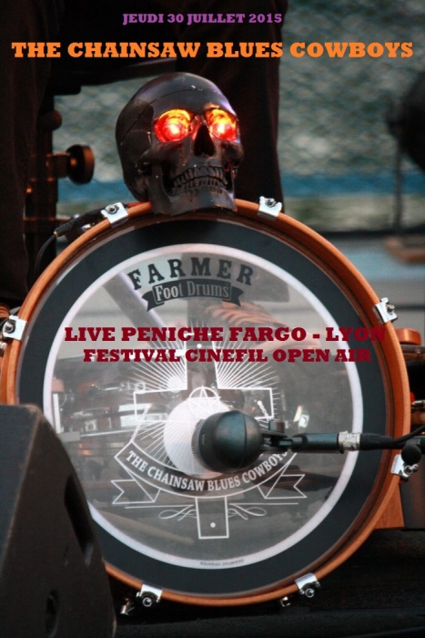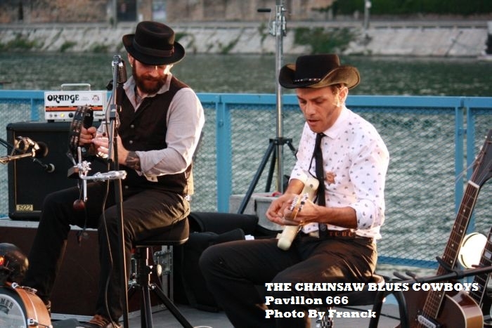 Les Chainsaw Blues Cowboys n’ont pas pour habitude de nous mener en bateau et pourtant ce soir c’est à bord de la péniche Fargo transformée en scène itinérante, qu’ils vont nous « blueser » une fois de plus l’âme et le cœur. La dernière fois qu’ils étaient venus à Lyon, c’était également sur une péniche, mais à l’intérieur puisqu’il s’agissait de La Marquise. Nous fêtions alors la release party de leur second album : « For a few chainsaw more ». Comme cet évènement ne date que d’avril 2015, nous sommes dans la parfaite continuité de cette sortie d’album et pour les inconditionnels de dirty fuckin’ blues with gospel spirit, ça va encore saigner ce soir. Le gentil animateur vedette déguisé en pingouin va nous faire un petit speech d’intro avant de laisser la place au duo grenoblois qui se trouve quand même un petit peu éloigné du public ce soir. Eux qui aiment bien la proximité avec l’auditoire ne vont pas se laisser prendre à contrepied et vont composer avec. C’est devant un public épars et un peu frileux que les deux bluesmen démarrent ce set pied au plancher. Le pédalier de James fracasse tous les tabous rythmiques tandis qu’Erich fait hurler sa strat façon blues texan. Le blues des Chainsaw Blues Cowboys agrippe les passants par l’oreille et les invite à s’arrêter et à s’assoir pour se laisser conduire l’instant d’un moment au bord d’un Rhône qui pourrait sembler comme un Mississippi imaginaire. En tout cas la magie opère comme d’habitude et le public tape déjà dans ses mains tout en riant des boutades et petites histoires imaginaires de James qui a complètement aéré l’atmosphère. Il n’hésite pas à des moments à quitter la scène pour rejoindre le quai et sans micro faire chanter tout le public. De toute façon, nos deux gaillards ont une telle expérience de la scène, que plus rien ne leur fait peur et s’il n’y a pas assez d’ambiance à leur gout, croyez moi, ils vont aller la chercher. Et même si le concert semble sans prétention puisque gratuit et en plein air, croyez bien que les Chainsaw Blues Cowboys n’ont pas fait le déplacement pour étendre le linge et je peux vous dire que sur scène les blues sans concession s’enchaînent et que ça envoie un maximum. Du rythme, du son, de la voix, du spleen, du slide, de la percussion, de l’harmo, absolument rien ne manque. Nous allons avoir le droit à un beau florilège de leurs meilleurs morceaux. C’est bien entendu le second album qui va primer, mais il y aura aussi des clins d’œil au premier. Erich va nous sortir toute la panoplie des grattes les unes après les autres selon les morceaux, notamment sa fameuse archtop que j’affectionne particulièrement. Gros crunch et méchant slide, c’est la devise de notre virtuose du blues lorsque les manches des guitares glissent entre ses mains et que le son passe à travers son Vox AC30. Chaque note sent la rocaille et la poussière des chemins du Delta. Même le son de son harmo vous prend aux tripes. Avec ce son saturé à souhait, Il respire à plein poumon les relents des bas fonds de Chicago lorsque le blues y régnait encore en maître. Encore une pure tuerie ce set des Chainsaw Blues Cowboys qui vont nous faire un petit rappel après que notre animateur Monsieur le pingouin les ait appelés les Chainsaw Blues Brothers. Remarquez, lors d’un concert récent à Aix en Provence, ils se sont bien fait appeler les Chainsaw Blues Country. Au final, on ne sait plus qui joue réellement. En tout cas je peux vous dire que le vendredi 07 aout au soir, ils seront présents au Festival du Sylak à Saint Maurice De Gourdans (01) et qu’ils ne viendront pas non plus pour faire de la figuration. Sérieusement, ne manquez pas l’épisode de vendredi sous aucun prétexte, pour un ultime règlement de compte musical à OK Sylak. Bravo et merci à l’association Cinéfil d’organiser des concerts comme celui-ci dans une ambiance très sympa, bon enfant et festive. J’espère que vous continuerez. Pour des raisons de confidentialité YouTube a besoin de votre autorisation pour charger. Pour plus de détails, veuillez consulter nos Politique de confidentialité. |