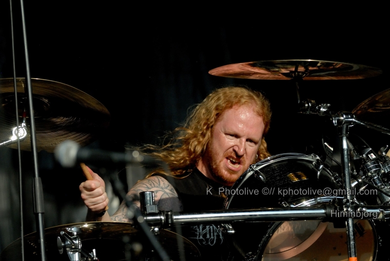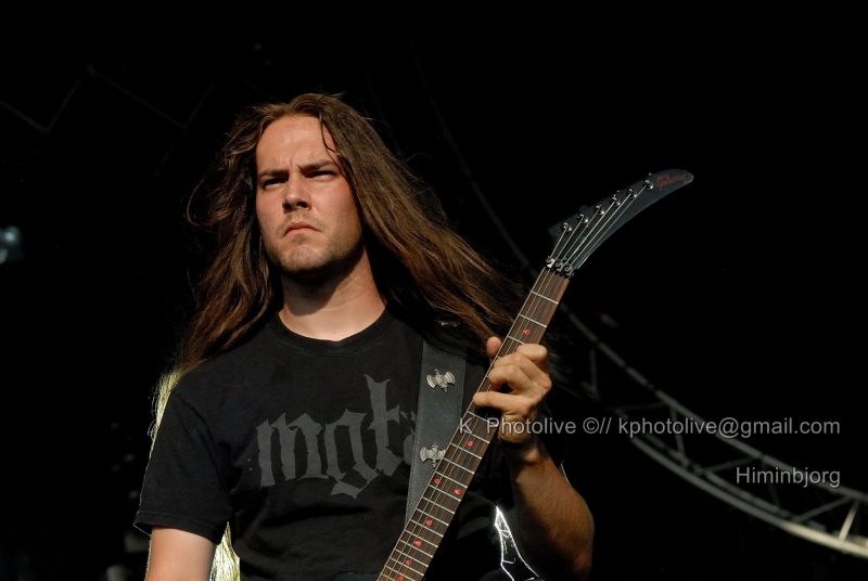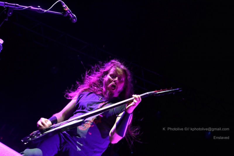 Fondé en 1991, ENSLAVED compte actuellement cinq membres dont un claviériste-chanteur. Grutle, le chanteur principal (42 ans) n'a pas de mal à établir le contact avec un public conquis d'avance et qui a sûrement déjà écouté leur dernier album intitulé « In Times ». La scène est joliment décorée et illuminée, on ne reste pas statique, on se déplace, on va d'une extrémité à l'autre en jouant et en chantant. Le frontman s'adresse régulièrement, en anglais, à la foule pour rappeler les grandes étapes de la carrière, presque 25 ans, du groupe qu'il a contribué à fonder.
