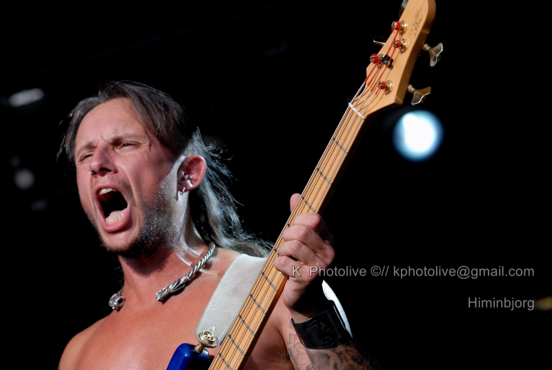 Une petite récréation est la bienvenue, la chaleur est éprouvante pour tout le monde. Et déjà une foule compacte attend l'arrivée sur la Odin Stage d'une formation bien connue des amateurs de black / folk / pagan metal, à savoir les régionaux de HIMINBJORG. Ils sont cinq sur scène, mais seul Fred appelé Zahaah, fondateur, chanteur, est titulaire de son poste dans le groupe. Les quatre autres, notamment Xavier, le batteur d' HYSTERIA, sont des musiciens de session, m'a-t-on dit. La présence d'une cornemuse n'est pas un détail compte tenu de l'orientation musicale pagan / folk du groupe au même titre que les claviers. Les textes de HIMINBJORG traitent de sujets sérieux, comme la guerre, le sol du pays qu'on aime et qu'on défend. Un nouvel album est récemment sorti après une dizaine d'autres au cours des 20 dernières années, il se nomme WYRD.