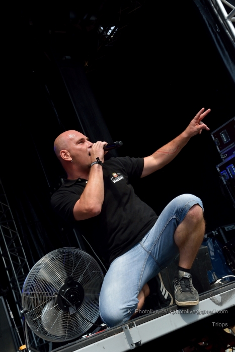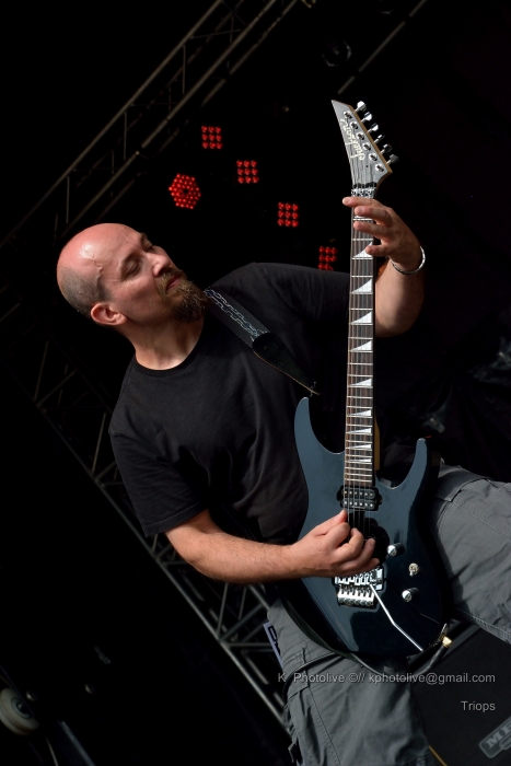 Ce groupe composé de cinq membres est issu d' ACETYLENE, autre groupe originaire de Bourg-en-Bresse et de la région toute proche. Jeep et ses quatre amis sont donc venus en voisins, soutenus par leurs fans. TRIOPS pratique depuis 2011 un thrash classique, mais de haute tenue. Le chanteur, surnommé Jeep, est visiblement heureux et ému de l'honneur qui est fait à sa formation. L'horaire de leur prestation n'est certes pas le plus favorable, mais le public encore clairsemé a aimé et applaudi cette petite demi-heure de « thrash bressan ».