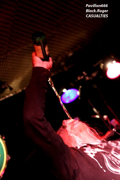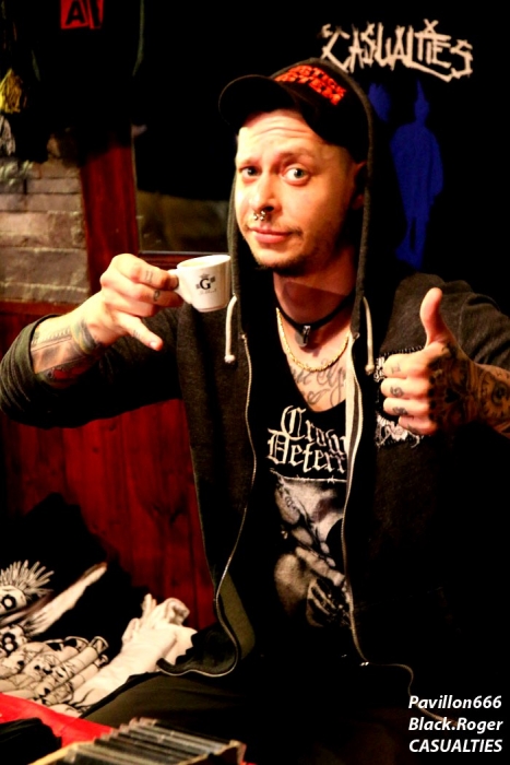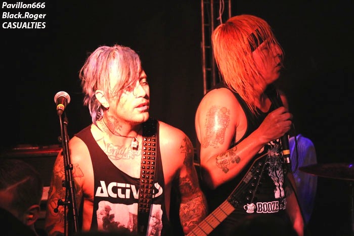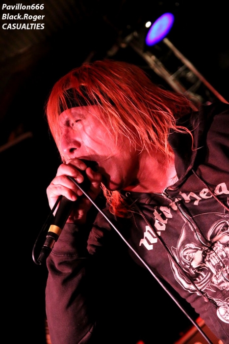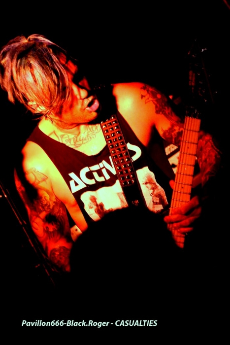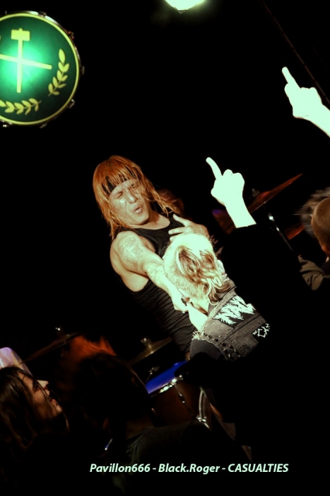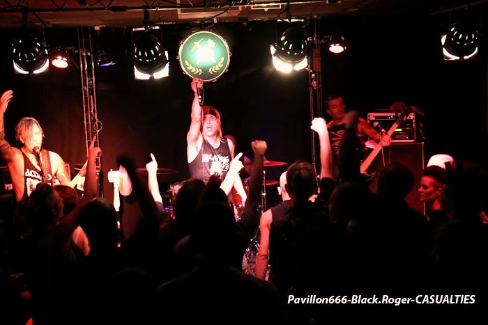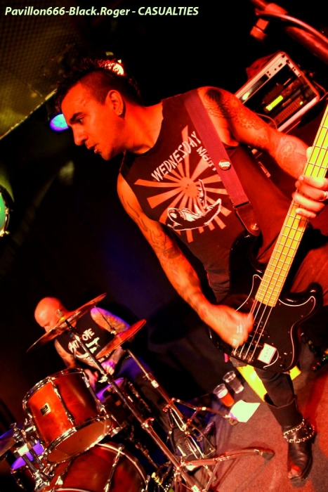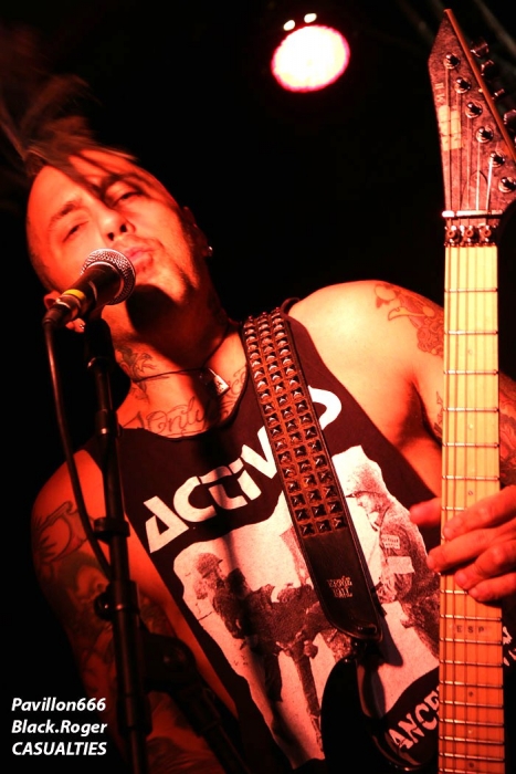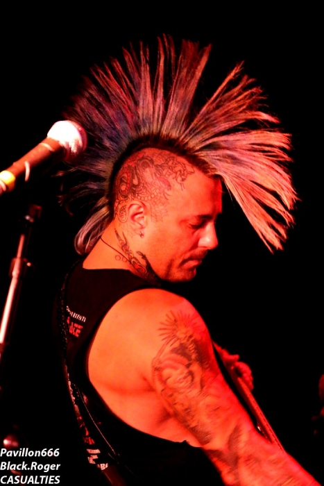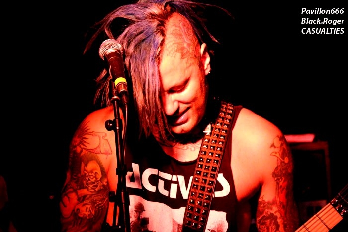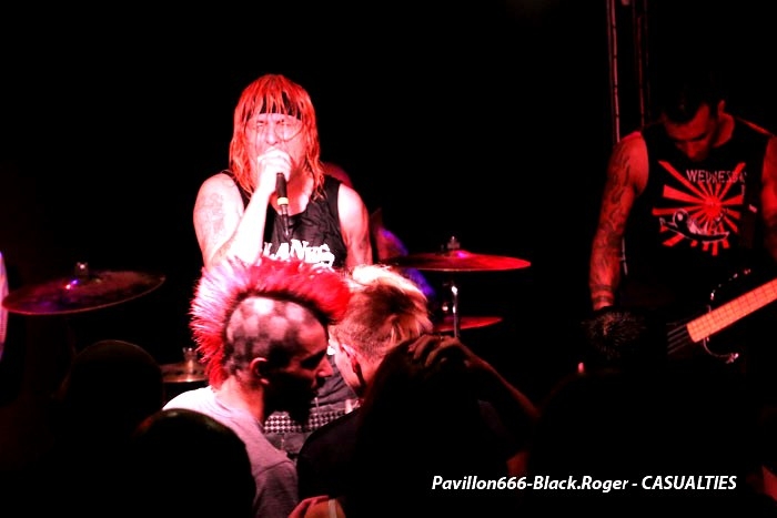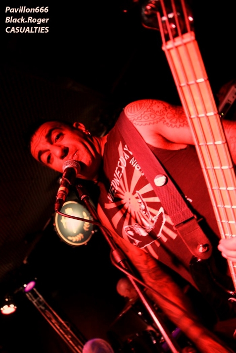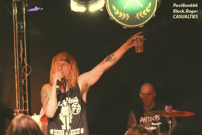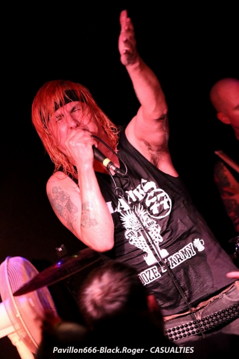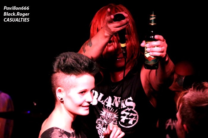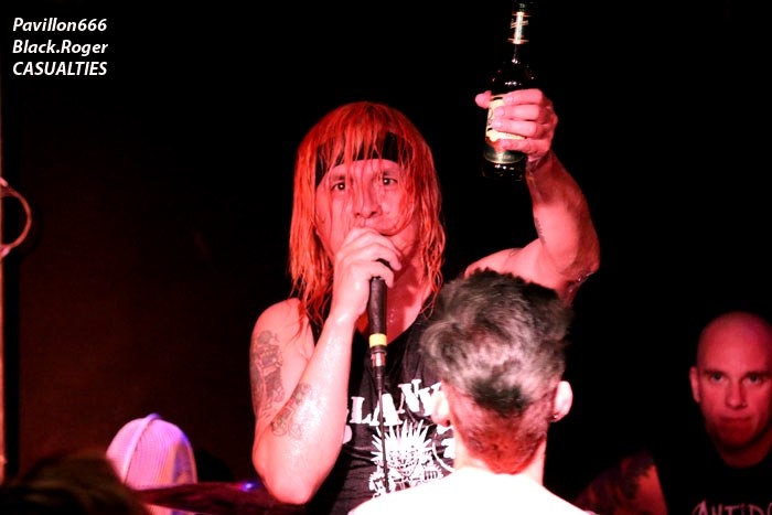 La soirée leur est entièrement consacrée, alors pas de première partie, on entre directement dans le vif du sujet vers 10 heures du soir, il faut bien prendre son temps et déguster les boissons houblonnée (ou pas) du bar et refaire le monde « no future » avec les amis et connaissances présentes ce soir et impatients de s’avancer au bas des marches vers la scène. Les « ricains » envoient alors le son sans plus attendre en mettant tous les potets dans le rouge pour un set qui s’annonce chaud, très chaud ! Le chanteur Jorge Herrera commencera direct à s’envoyer une canette de bière, le liquide dégoulinant de sa bouche, afin de se mettre en « voix ». Et c’est parti pour un moment rock n’ punk de folie. Durant les premiers titres la foule observe et attend le moment propice pour lancer le pogo, ce qui laisse le temps aux photographes de faire quelques clichés de près, les yeux dans les yeux. Puis, tout va très vite, ça part dans tous les sens, chaleur, sueur, mouvements sont au rendez-vous pour un moment intense et musclé, mais où est donc passé ma godasse ? Ceux de The Casualies connaissent la « musique » et nous envoient des directs « in your face » aux couleurs de l’anarchie, rouge comme notre sang, noir comme notre peine ! The Casualties étant inspirés au départ par The Exploited, The Sex Pistols et autres G.B.H. Les New-Yorkais sont LE punk de la côte Est des « states » comme Total Chaos est LE punk de la côte Ouest avec en commun la bonne parole agressive et subversive depuis plus de 20 ans. Leurs textes « anti-tout » de notre belle société font mouche encore et encore avec les refrains repris par tout le monde ou presque. Au menu donc du street punk, mais aussi une pincée de thrash, de rock et une louche de « oï ». Mais le groupe sait aussi faire la fête en régalant le gosier de certains devant la scène et même en organisant une cavalcade de chevaux humains dans une joute démente et festive. Bref on ne voit pas le temps passer et puis vient le moment des rappels, rappels appréciés, public content, alors on termine avec « fuck you ! », cqfd. Punk un jour, punk toujours, le public de ce soir rassemblant les jeunes en « crête » et les plus anciens sans « crête » a fait trembler les murs de La Tanière dans une ambiance incroyablement sympathique. Des soirées comme celles-ci étant à marquer d’une « pierre blanche ». Merci aux organisateurs, la Patte d’Ours et la Tanière pour ce moment de folie incontrôlée qui nous a fait rentrer de nouveau à « donf » dans la culture punk, amen ! |