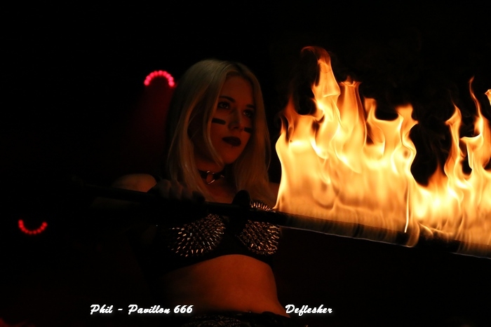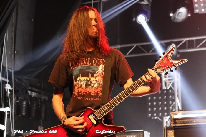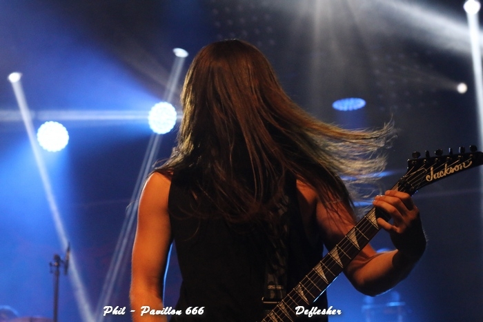 DEFLESHER a la lourde responsabilité d'ouvrir les festivités. Distillant des compositions death / thrash, le quintette épaulé par instant d'un show pyrotechnique évolue devant un public déjà garni pour ce début d'après-midi. Les morceaux structurés dans la pure tradition du genre ne sont pas désagréables, mais demandent un peu plus d'identité pour marquer les esprits. Le set des musiciens est appréciable bien que Arthur et Florent (guitares) soient peu mobiles sur leur côté respectif. La prestation scénique repose sur les épaules de Dimitri (chant) et Adrien (basse), le chanteur dreadlocké et son compère headbanguent à s'en décrocher la tête et haranguent régulièrement le public. Agrémenté de deux jeunes femmes usant d'artifices enflammés, le set perd de son énergie durant leurs interventions fébriles, flammes, feu et disqueuses sont de sortie. Ces intrusions ne s'adaptent pas vraiment à l'ambiance musicale.