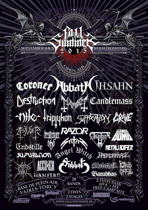 L'été touche à sa fin et la saison des festival métalliques se clôture également pour une reprise toujours plus forte avec toujours plus de décibels l'année suivante. L'occasion de clore cette cuvée 2015 en beauté avec le bien nommé Fall of Summer. Ouvrant ses portes pour la deuxième édition, l'événement avait placé la barre très haut en 2014 avec une affiche alléchante réunissant des artistes de renom tels que Watain, Sodom, Enslaved, Pentagram, Venom ou encore Carcass. Le challenge était donc de faire encore mieux cette année. Les métalleux de tout horizon avaient donc rendez-vous les 4 et 5 septembre toujours au même endroit de l'immense Base de loisirs verdoyante de Torcy en région parisienne, pour un line-up tout aussi renversant que son aîné.
