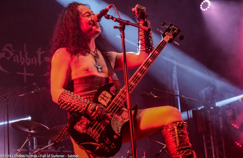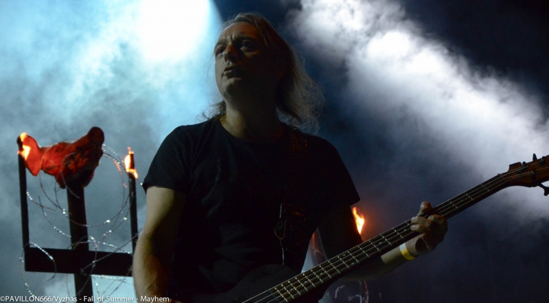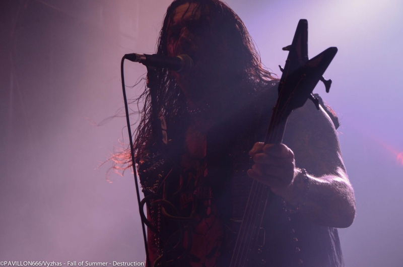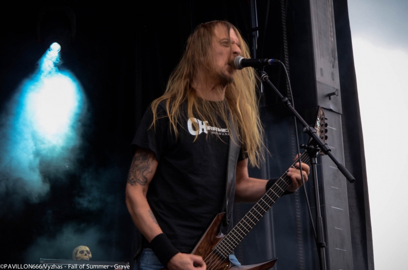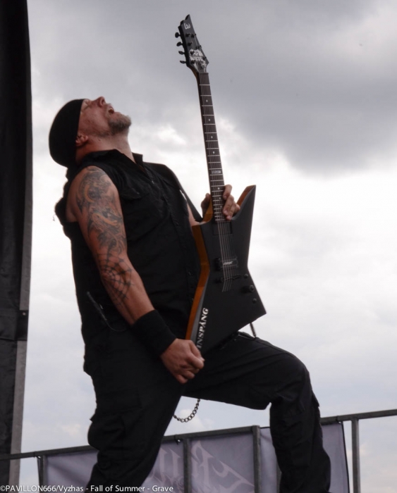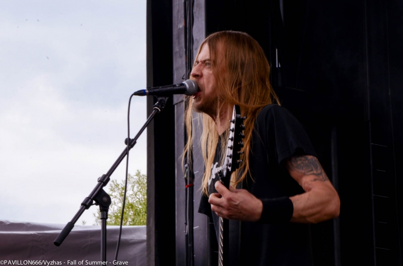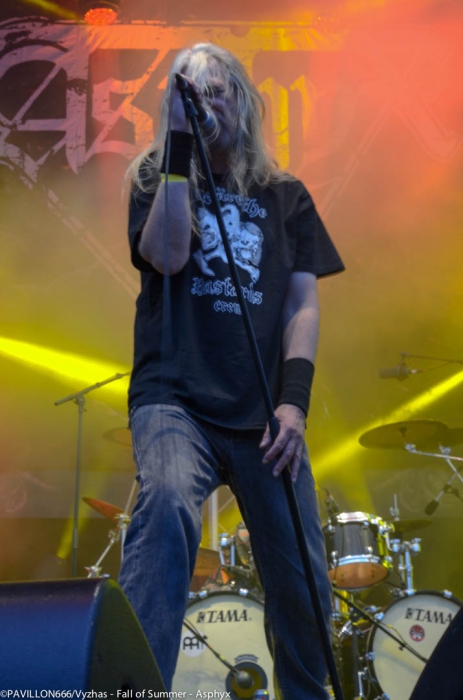 ENDSTILLE Après l'ouverture du stoner/doom des locaux de Barabbas, suivis du death/grindcore des ch'tis de Putrid Offal puis du thrash incisif des allemands d'Accuser, c'est au tour d'Endstille de démarrer les hostilités. Les teutons prennent d'assaut la Sanctuary avec leur black guerrier. Formé en 2000, les « cousins germaniques de Marduk » délivrent leurs riffs acérés face à une assistance plutôt timide mais globalement réceptive. Défendant leur dernier méfait en date « Kapitulation 2013 », le combo, amputé d'un guitariste, reste assez statique. Seul le frontman Zingultus, présent depuis 2009 dans la machine de guerre, arpente la scène tel un lion en cage. Complètement déchaîné, le vocaliste est très en voix et harangue la foule de sa voix écorchée, gratifiant l'auditoire entre deux morceaux, de quelques mots de français.Malheureusement la malédiction de la précédente édition s’abat sur le panzer musical avec un son brouillon et des basses assommantes plombant cette prestation. GAMA BOMB Faisant partie de la mouvance revival thrash aux côtés de Municipal Waste ou encore Havok, Gama Bomb investit la bien nommée Blackwaters Stage, située aux bords du lac de la base de loisirs. La musique des irlandais est à l'image de leur thématiques humoristiques : bas du front. On passera outre le pantalon bariolé du chanteur Philly Byrne, mais la performance à l'énergie communicative des thrashers leur vaut une salve de pogos et de slams. Mais comme de nombreux groupes de la nouvelle vague thrash, tous les morceaux du quintet se suivent et se ressemblent, l'ennui gagne vite votre serviteur. Ajoutons à cela des guitares approximatives et des basses à nouveau bien trop présentes. Un show qui ne marquera pas vraiment les esprits... Setlist : Zombie Blood Nightmare Slam Anthem Three Witches Smoke the Blow With Willem Dafoe Backwards Bible Hammer Slammer / Drop It Like It's Hot OCP Thrashoholic Last Ninjas Unite In the Court of General Zod Mussolini Mosh Escape from Scarecrow Mountain Hell Trucker We Respect You Terrorscope Bullet Belt GRAVE Attention légendes du death old-school à la sauce suédoise en vue ! Grave débarque sur la Sanctuary en toute simplicité. Après 26 ans de carrière au compteur, les scandinaves ne se sont pas assagis et c'est tant mieux ! Le groupe est venu fouler le Fall of Summer afin de montrer de quel bois il se chauffe. Quel bonheur de constater que le son s'est nettement amélioré et rend hommage aux riffs grassement pachydermiques des quatre gaillards, visiblement heureux d'être là. Après un léger problème technique, Grave propose une setlist équilibrée alternant titres mid-tempi rampants et brûlots nerveux, piochés dans l'ensemble de leur dix albums, dont le dernier « Endless Procession of souls » remonte à 2012 . Malgré un sentiment de linéarité se développant en fin de set, Grave délivre un show honnête et sans bavure pour cette première journée ! DESTRÖYER 666 On enchaîne sans temps morts avec les loups australo-néérlandais de Deströyer 666. Ambiance clous, cuirs et cartouchières sur la Blackwaters ! Autant dire que le quartet est attendu de pied ferme. Le public accueille comme il se doit KK Warslut et ses acolytes, prêts à en découdre avec leur Black/thrash incisif et sans concessions que le charismatique leader distille depuis plus de 20 ans . C'est une palanquée d'hymnes qui nous est envoyée à la figure avec le véloce « Black City, Black Fire », l'immense pièce épique « I am the Wargod » sur laquelle s’époumone la foule tel un seul homme, ou encore le « Bathory-esque », « Satanic Speed Metal » et son refrain repris en cœur par une assemblée en furie. Si la basse un peu trop en avant gâche quelque peu le plaisir sur certains morceaux, la voix toujours aussi délicieusement hargneuse de Warslut et la précision chirurgicale de ses sbires, compensent largement. Une excellente performance qui aurait mérité d'un son bien plus à la hauteur de la musique survitaminée de Deströyer 666. ANGEL WITCH La Sanctuary accueille des dinosaures du Heavy Metal, ou plutôt de la Nouvelle vague du Heavy Metal britannique. Formé en 1978, Angel Witch revient en France pour remettre les pendules à l'heure. Si leur album éponyme cultissime ainsi que la suite de leur discographie dans les années 80 n'a pas eu le succès escompté d'un Iron Maiden, leur retour 26 ans après leur dernier opus studio avec « As Above, So Below » en 2012 témoigne de la vitalité du combo qui, après toutes ses années de silence, n'a pas baissé les bras. Le Fall of Summer aura donc le droit à une setlist « best of » faisant tout de même une petite place de choix au petit dernier. Si la bande emmenée par l'indéboulonnable chanteur/guitariste Kevin Heybourne ne déchaînent pas non plus les passions, le public est plutôt enthousiaste face à cette prestation un brin nostalgique, qui bénéficie en sus d'un son à la hauteur de leur Heavy Metal racé. Setlist : Gorgon Confused Dead Sea Scrolls White Witch Atlantis Sorcerers Devil's Tower Dr. Phibes Angel of Death Baphomet Angel Witch Après avoir fait l'impasse, le temps d'un court répit, sur les légendes du doom funèbre et planant, Candlemass, c'est sur le mythique « Solitude » raisonnant à quelques mètres que se prépare le prochain bulldozer prêt à déferler sur la Sanctuary. ASPHYX Arborant l'imposant drapeau avec le logo blanc, les hollandais d'Asphyx sont attendus tel le messie par une foule extrêmement dense massée devant la scène. Les problèmes de basse ne semblent être qu'un lointain souvenir, car le quartet formé en 1987 bénéficie d'un son bien graisseux pour leur death lourd et poisseux aux accents doom rampants. C'est tout sourire que l'indestructible vocaliste Martin Van Drunen et sa bande débarquent pour faire parler la poudre. Très communicatif avec le public, n'hésitant pas à s'adresser à lui avec quelques mots dan