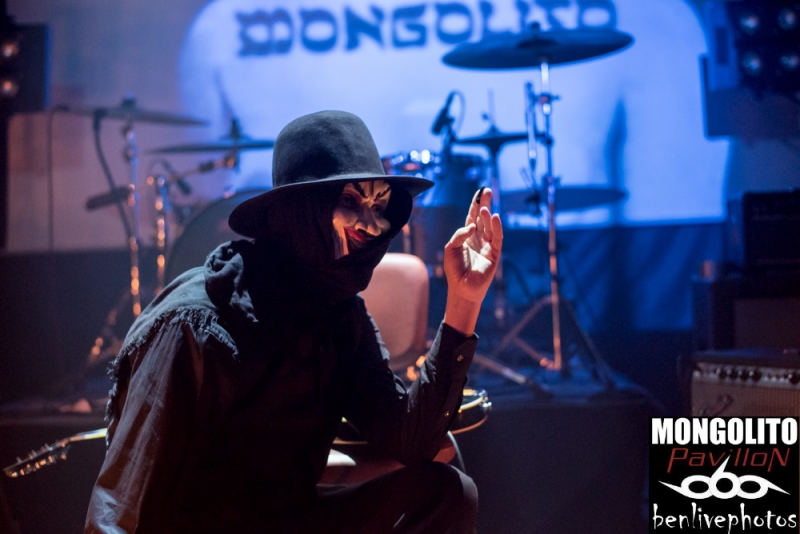 Mongolito est en fait le projet guitare de Marc De Baker. La mise en scène est très jolie, avec bougies, écran en arrière-plan, costume avec chapeau ainsi qu'un masque. C'est assis que Mongolito va nous démontrer ce qu'il fait comme "explorations guitaristiques". On remarque d'innombrable pédales à effets (looper, wah-wah...) et c'est là que le talent de Mongolito prend effet. Il jongle avec ses pieds pour enregistrer des sons qu'il agrémente de son talent technique à la guitare. Cela ressort en ambiance très psychédélique et sombre. Le gaucher nous jouera 2 ou 3 titres assez long et finira par exploiter sa bouteille de vin vide en faisant des slides sur sa 6 cordes.