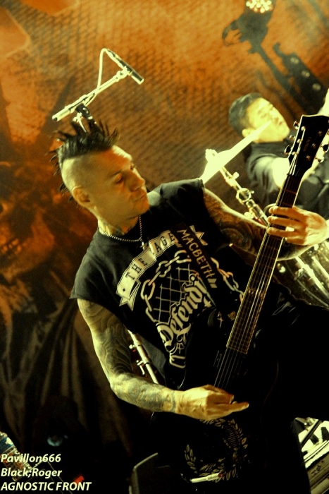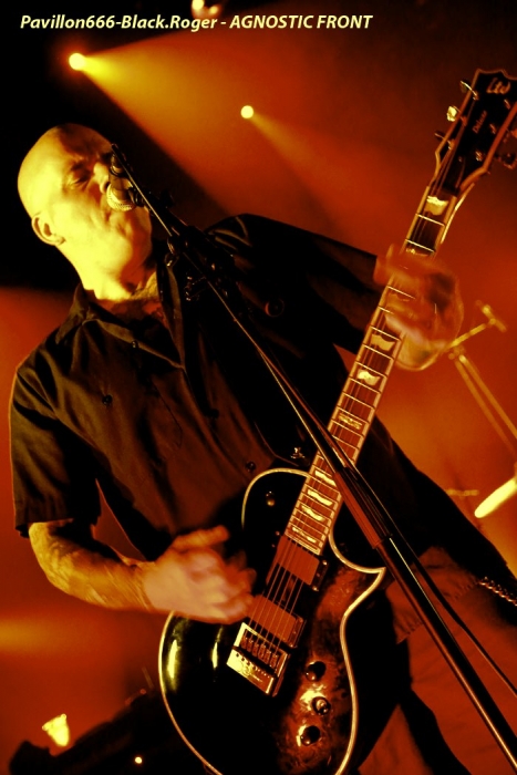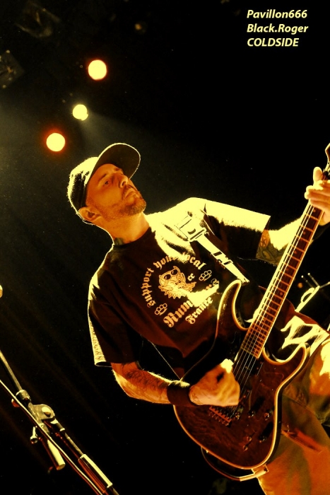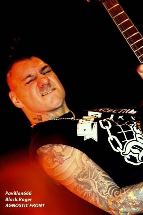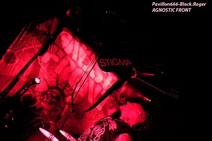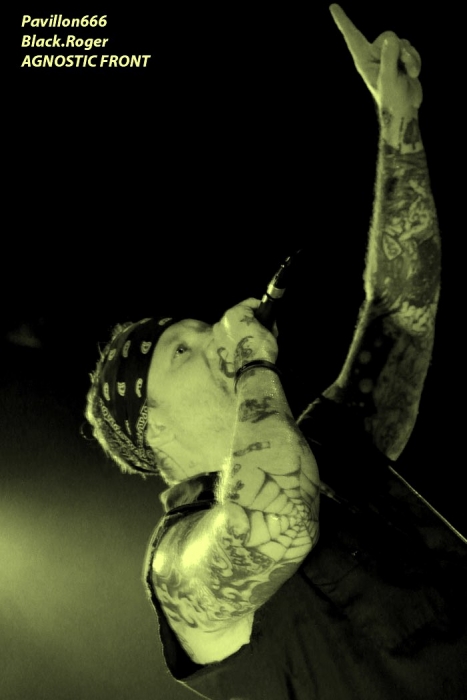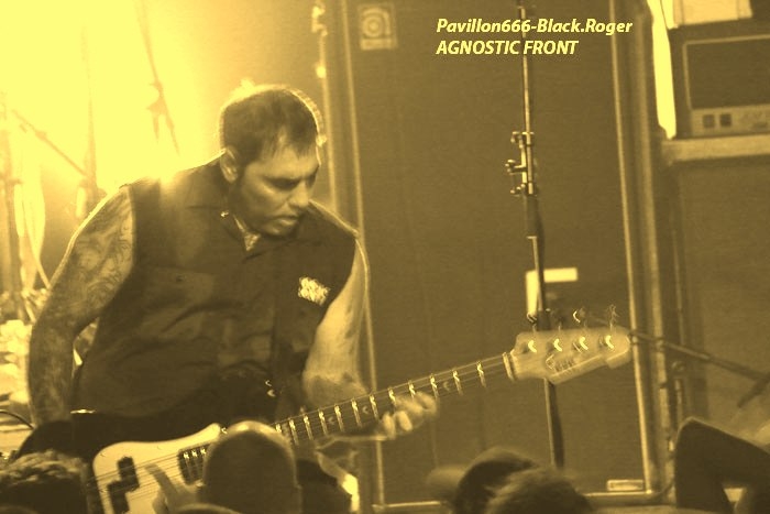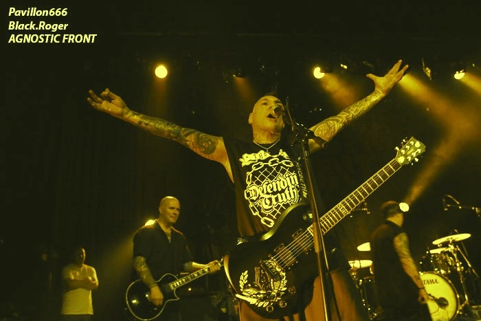 Durant cette tournée Européenne (dont seulement trois dates en France) ils sont accompagnés par les Californiens OLD FIRM CASUALS et les Floridiens COLDSIDE, la soirée risque d'être très chaude et fortement agitée. Car cela ne fait aucun doute vu l’engouement actuel des « coreux » pour tous les concerts de la région. Alors, c’est parti, ouverture des portes à 20heures 30 et premier groupe en lice dès 21heures. Les Floridiens COLDSIDE débarquent sur scène avec sous leur bras un nouveau « méfait » intitulé « Outcasts, Thugs and Outsiders », paru en Février dernier. Ce groupe semble très proche d’Agnostic Front et de de Madball, le titre de l’album comprenant en guest Roger Miret et Freddy Cricien cqfd. L’imposant chanteur Alfred « Opie » Dufour en impose devant le micro et nous balance un hardcore typé NYHC de bonne facture, bien plombé, bien lourd avec chorus à la clef, classique certes, mais d’une efficacité redoutable en live. D’ailleurs le public ne s’y trompe pas et commence à s’agiter par des « one steps » devant la scène, ça promet ! Pas de surprise donc avec les « voyous » Floridiens qui vont nous délivrer un « true » hardcore imparable avec tous les ingrédients inhérents a ce style, plus style de vie au départ que style musical… Bref COLDSIDE nous a mis dans le bain de l’underground typé New-Yorkais et Bostonien d’excellente façon, très bon set efficace, on aime. La suite verra sur les planches le groupe Californien OLD FIRM CASUALS dont le frontman chanteur/guitariste n’est autre que Lars Frederiksen de RANCID. Cette formation n’étant que l’un de ses nombreux projets parallèles en somme. Ici nous entrons de plain-pied dans le street-punk, le « Oî » aussi avec un show 100% rock n’roll en fait, du pur binaire en folie. Ce binaire nous ramenant dans une certaine époque punk/rock à la Sid Vicious pourquoi pas, avec outre une rythmique écrasante, un guitariste doué s’éclatant en live, quelle claque ! Bon, seule ombre au tableau, le chant de Lars est moins bon qu’il y a une vingtaine d’années, mais le spectacle en live vaut le détour et au final leur coté punk mélodique, même si un peu répétitif à la longue, compense cette « faiblesse ». Résultat un set énergique et honnête qui a énormément plu dans ce Brise-Glace plein comme un œuf, tout en sueur qui commençait à « fondre ». Après quelque atermoiement, le « back-drop » d’AGNOSTIC FRONT s’éclaire en rouge et le guitariste Vinnie Stigma, tout excité (comme d’habitude), débarque avec le reste de la troupe emmenée par le charismatique Roget Miret. Et là, c’est un tsunami qui est déclenché immédiatement devant la scène, garez-vous ! Et durant plus d’une heure ce sera la folie dans la salle, une vrai tuerie hardcore déclenchée par ces pionniers du NYHC qui officient depuis les années 80 partout à travers la planète. Pas de faiblesse au programme comme pour contrer les dires de certains malsains qui trouvent un peu lassantes les prestations des « vétérans » du style… Pour l’instant, la magie est toujours là, le public de ce soir n’en a cure, il faut voir cette relation assistance/musiciens, relations complices s’il en est. Agnostic Front effectue actuellement une tournée Européenne afin de promouvoir son dernier album « The American Dream Died », tout un programme ! Ces rebelles punks de New-York contemporains de l’époque des Dead Kennedys et des Black Flag on « accouché » d’un nouveau style au fur et à mesure de leur évolution passée fait de punk et de rock en y ajoutant cette dimension plus agressive dénommée hardcore, un hardcore de référence pour New-York. Alors certes, aujourd’hui la base reste hardcore old-school, mais les musiciens ont réussi à infiltrer des éléments plus modernes, et ça le fait croyez-moi. Agnostic Front est toujours engagé et enragés, et finalement on aime ça. Avec une set-liste composée d’anciens et nouveaux titres, de « For My Family » jusqu’au dernier rappel la fameuse reprise des Ramones « Blitzkrieg Bop » !es New-yorkais ont mis le feu au Brise-Glace d’Annecy et ce fut tout simplement énorme. Set-List : The Eliminator, Dead To Me, My Life, My Way, That’s Life, I Can’t Relate, For My Family, Friend Or Foe, Victim In Pain, Your Mistake, Police Violence, Only in America, Old New-York, All Is Not Forgotten, Peace, Crucified, Blind Justice, Last Warning, Never Walk Alone, Gotta Go, Riot, riot, Upstart, Police State, Enough is Enough, No War fuck You, A Mi Manera, Addiction, Paulie The Dog, Blitzkrieg Bop. Rien à rajouter en conclusion, vous savez tout, ou presque sur cette nuit agitée. Reste à remercier le Brise-Glace pour son invitation faite à pavillon666. Mais aussi nous n’oublieront pas de remercier les trois groupes de l’affiche et naturellement le nombreux public déchaîné pour l’ambiance installée. |