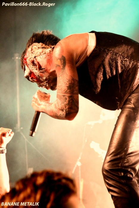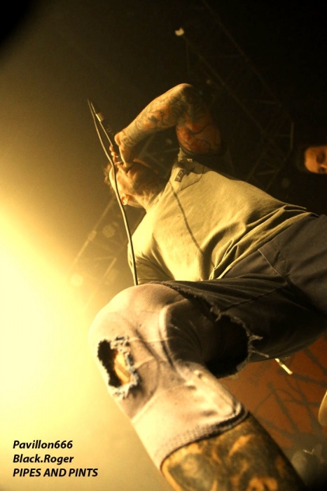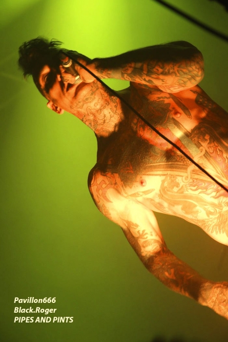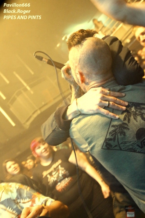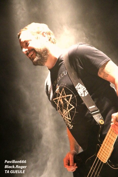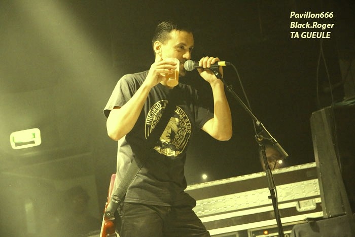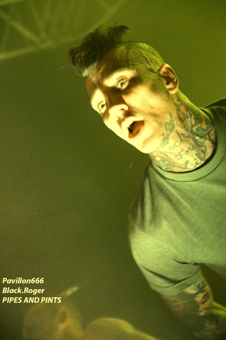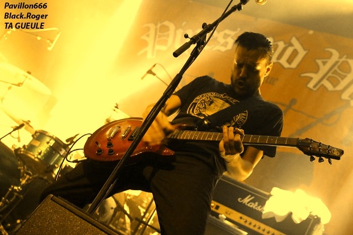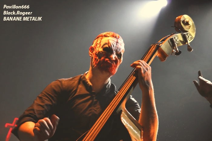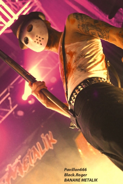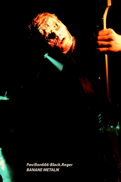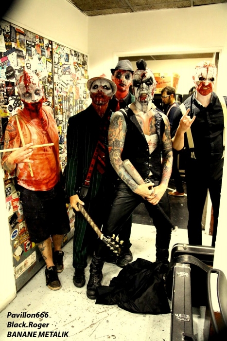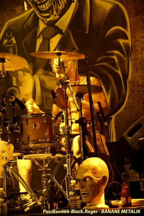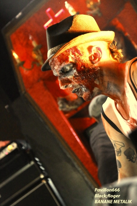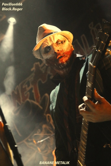 Afin de « chauffer » le Kao on nous propose les Tchèques de PIPES and PINTS et les dangereux punks Lyonnais TA GUEULE qui doivent remplacer au pied levé DEMENTED ARE GO absents ce soir suite à un fâcheux contretemps. Que la fête commence donc avec TA GUEULE (soyez polis quand même). D’ailleurs ils le sont avec des envois au second degré voyons, des envois rapides et plombés servant des textes « vicelards » et provocants vous remontant les bretelles, on aime. En effet Ta Gueule ce n’est pas du punk/rock/metal de bas étage, mais de gratte-ciel. Le trio ce soir vous gratte la cervelle, que dis-je vous l’égratigne avec les propos acides de Chris. Adrien nous remonte les tripes au cerveau avec sa basse ronflante et Romain essaie de détruire son kit de batterie. Pour ceux qui ne connaissent pas, les discours du chanteur/guitariste vous mettent le dos au mur, ou face à vous-même, vous avez le choix. Les déflagrations sonore qui s’en suivent sont imparables et vous collent au plafond, punk un jour, punk toujours mais ici renforcé par la lourdeur du métal parfois. Mais ou est « Dieu » dans tout cela ?, Dans le « 666 » ou devant la scène pour un « hardcore muscle et karaté » ? Alors il faut être « tendre » sur un air de « samba » et à ce moment là « mangez-moi les burnes », « subutex » en prime ! Voilà en gros la set-list de Ta Gueule. Ok on la ferme et on apprécie , mais on ne se défoule ce soir que sur les derniers titres, dur à chauffer le Kao !. C’est PIPES AND PINTS, combo Tchèque qui va s’en charger ensuite avec une démonstration punk au alures de musique celtiques avec cornemuse tout droit sortie des « highlands ». Alors là le public va se déchainer dès les premiers titres. Le folk-punk de ceux de Prague fait mouche avec une chorégraphie scénique de haut vol et des compositions qui accrochent indéniablement. Ce rock « couillu » mixé à des mélodies « country » est carrément dément en live. Le quintette joue dans la même cour que celle de THE REAL McKENZIE et autre DROPKICK MURPHY, alors vous voyez le tableau, l’ambiance festive d’enfer est installée pour toute la durée du show. Oui, car show il y a vraiment. Les musiciens font le spectacle sans négliger une bonne musicalité de bon aloi, musiciens maitrisant parfaitement leurs instruments et servis par un bon son. Le frontman n’hésite pas à s’infiltrer dans le public afin de jeter de l’huile sur le feu, mettant ainsi ce public dans sa poche, énorme ! Les titres défilent, le set est conséquent, les participants du concert « participent » vraiment pour une ambiance de « ouf », une ambiance généreusement déglinguée. Maintenant que tout le monde est brûlant comme la braise, les monstres de Banane METALIK vont venir « achever » le travail pour cette soirée, disons très, très agitée, on aime également. Je m’éclipse backstage maintenant afin de « shooter » les « Bananes » avant leur entrée en scène. Et puis je reviens vite dans la salle afin de ne pas perdre une miette de la prestation des fameux BANANE METALIK. Nos amis « frenchies » du psychobilly ont donc fait étape dans notre bonne ville de Lugdunum sur leur tournée actuelle « Sangre Familia » qui est faite afin de promouvoir leur dernier maxi 6 titres « The Gorefather » paru en Septembre dernier. Mais revenons sur le devant de la scène du Kao ce soir jeudi 29 Octobre. Ca démarre à fond les ossements dans une ambiance funèbre mais festive en fait, et le public se lance immédiatement dans des slams échevelés et des pogos musclés. Alors, dire que le quintette était très attendu n’est qu’un doux euphémisme ! Peu de temps après le début des hostilités, un ennui technique guitare vient perturber quelque peu le show macabre, mais tout rentre bien vite dans l’ordre, tout repart à « donf ». Et le mélange punk, metal, sexe et gore fait son œuvre dans une démonstration non conformiste en diable. D’ailleurs, Ced666 le frontman, provoque, harangue la foule, invitant tout ce beau monde à monter sur scène évidemment. Sur scène où l’un des membres du groupe nous menace même avec un fusil. Méchamment efficace ce set ! Et durant une petite heure ce sera la même, la même ferveur de l’assistance, la même accroche de par les compositions du quintette qui nous emmène dans sa dimension incroyablement mortelle avec à l’appui « Funeral March », sans oublier les filles avec la reprise d’un titre connu ré-intitulé « Poupée de Sang » ! Et puis, la machine horrifique nous quitte, mais revient pour deux petits titres en rappel. Nous, on en aurait bien reprit une louche de ce set hors-norme et sauvage, mais bon nous aurons l’occasion de voir et revoir encore et encore cette formation assez unique en son genre qui a déjà foulé les scènes du monde entier, amen ! Enorme soirée au final, placée sous le signe du punk sous toutes ses formes, mais s’adressant aussi aux rockers et métalleux de tous poils, tous unis pour une ambiance incroyablement noire et festive en même temps. Merci à Médiatone, merci aux trois formations qui ont « assuré » et merci au public qui a répondu présent ce soir là ! |