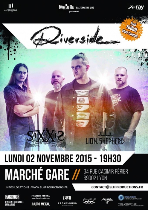 C’est un peu le cas pour cette soirée au Marché Gare qui s’annonce plutôt rock progressif et même plus surprenante encore. Quoi qu’il en soit, les filles de Sounds Like Hell Productions ont eu une fois de plus du nez en faisant venir trois groupes aussi inattendus que musicalement bons. En tout cas, une chose est sure, c’est que cette scène a son public et ce soir il s’est déplacé en masse pour ces trois superbes affiches. Comme je n’ai pas la prétention d’être un expert en quoi que ce soit, j’essaye toujours de vous décrire au mieux une atmosphère et un ressenti. Aussi, si je suis très loin de donner des détails précis sur vos groupes préférés, ne m’en tenez pas rigueur. J’essaye toujours de conduire mes live reports le plus intelligemment possible avec beaucoup d’écoute et de ressenti sur ce que j’ai vu. Et là ce soir, j’en ai entendu des belles choses au Marché Gare. Tout d’abord avec les polonais de Lion Shepherd et leur rock progressif très énergique et vraiment entrainant. Le seul problème, c’est que Riverside avait déjà installé son matos et les claviers prenaient une place de dingue ce qui laissait peu d’espace sur la scène aux deux premiers groupes. Néanmoins Lion Shepherd a fait avec et nous a délivré un set tout à fait dépaysant aux couleurs orientales. L’ambiance musicale de Lion Shepherd est plutôt planante et très mélodique. Ils revendiquent un côté psychédélique que j’ai eu beau chercher et que je n’ai pas trouvé. Les musiciens qui composent le groupe sont tous d’un excellent niveau. Le chanteur, seul maître au micro, juste appuyé par le contre chant du guitariste déroule une voix claire aux reflets obscurs colorant étrangement la musique de ce combo des plus étonnants. En tout cas pour moi, ce fut une sacrée découverte. Le guitariste a beaucoup de feeling et un jeu de guitare très fluide. Il est vraiment très agréable à écouter. Il maîtrise également parfaitement le jeu du luth qui va intervenir dans plusieurs morceaux et donner cette teinte un peu mystique qui ouvre les portes de la musique vers l’orient. Au final, c’est un groupe assez magique que j’ai beaucoup apprécié, notamment pour son côté évasion et ses ouvertures musicales. Je pense que les essayer c’est les adopter, alors allez les découvrir via leur page facebook et leur site officiel : http://lionshepherd.net/ je pense que ça vaut largement un détour de votre part. Toujours dans un style progressif, mais cette fois ci un peu plus nerveux, voici venir les américains de The Sixxis sur la scène du Marché Gare. Les sudistes de Sixxis sont un line up des plus traditionnels. Composés de deux guitaristes, un chanteur claviériste et violoniste, un bassiste et un batteur, leur musique fait parfois un peu penser à tous ces groupes de référence comme UFO, Rush ou autres Led Zeppelin, qui ont résolument façonné le hard rock dans les années 70. En tout cas, on peut raconter ce que l’on veut, ça envoie sec et sur scène ça rock un maximum. Le chanteur et sa voix haut perchée à la Robert Plant est campé derrière ses claviers et balance un max. Excellent violoniste, il va même durant une poignée de morceaux nous faire profiter de sa virtuosité sur cet instrument apportant également au set des Sixxis une saveur quelque peu orientale et une tonique de jeu à l’ensemble du groupe qui est assez intéressante. Les deux guitaristes sont particulièrement bons et n’hésitent pas à échanger les phases de jeu rythmiques et solos tout en maintenant chacun les contre chants en continu. Les solos sont particulièrement techniques et les deux guitaristes n’hésitent à balancer de grandes envolées sonore chacun à leur tour. Le duo basse batterie est totalement impeccable. Le batteur est dans un trip totalement exalté et cogne ses futs tel un vrai bûcheron. C’est absolument incroyable de le voir jouer car le corps de ce gars est en permanence en mouvement. Le tempo groove à mort et lui avec. L’ensemble est vraiment cohérent et ce set est un plaisir pour les oreilles autant que pour les yeux. Si vous ne les connaissez pas, allez les découvrir via leur page facebook et leur page officielle : http://thesixxis.com/. Ainsi vous comprendrez aisément pourquoi ils remplissent des salles entières. Pour terminez cette affiche, voici le gros morceau de la soirée si je puis dire. Les polonais de Riverside en 14 ans de carrière n’ont musicalement et scéniquement plus grand-chose à prouver. Déjà six albums au compteur plus un live, sans compter les Ep et tout le reste, on peut dire qu’ils ont pas mal roulé leur bosse. Et ce soir, c’est un public totalement impatient qui trépigne de les voir entamer leur set qui va durer 1h45, ce qui n’est pas rien et encore ils ont décidé d’écourter d’un quart d’heure pour que les autres groupes puissent jouer un peu plus longtemps. La scène est magnifique avec des lights superbes, le tout agrémenté d’un son qui ma foi aurait pu être meilleur vu l’envergure mélodique du groupe. Les quatre polonais sont totalement à l’aise sur la scène du Marché Gare avec un public totalement acquis et conquis. Mariusz le bassiste et chanteur de Riverside est un véritable frontman. Fin bassiste et excellent chanteur, il assure totalement le show avec la complicité de Michal aux claviers et au chant. Les compositions de Riverside sont assez longues et se découpent souvent en plusieurs phases avec des breaks musicalement très riches. De toute façon, la musique de Riverside est en général très dense avec des schémas mélodiques parfois assez complexes qui peuvent soit errer et flotter sur les silences ou bien être totalement groovy. Je pense que les influences des polonais sont très diverses allant des Pink Floyd jusqu’à Genesis en passant par Les Porcupine Tree, voire Opeth. Je pense surtout que leur univers musical est très riche et 