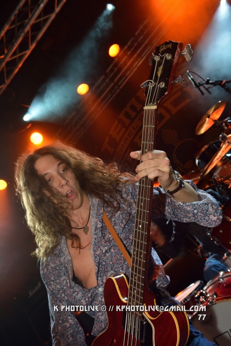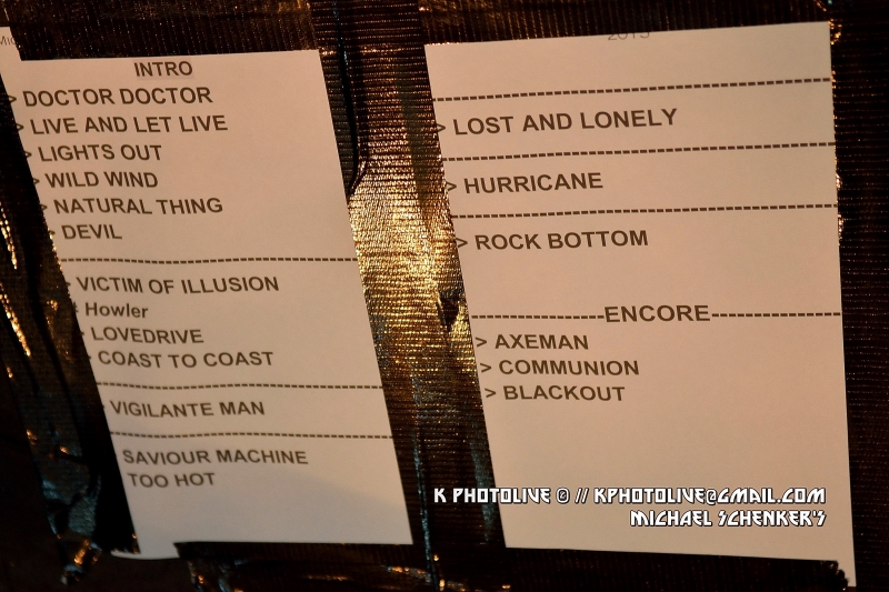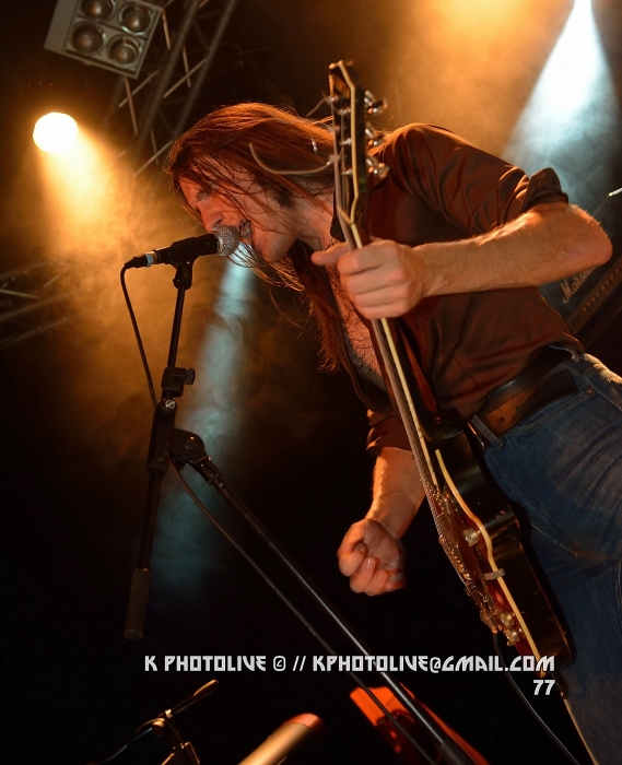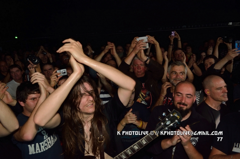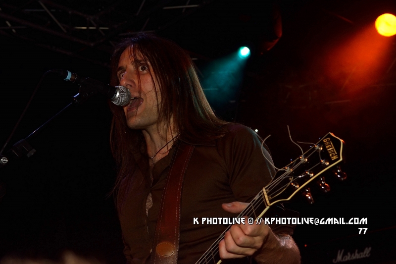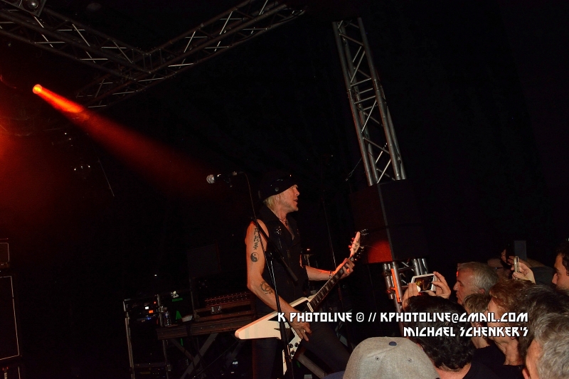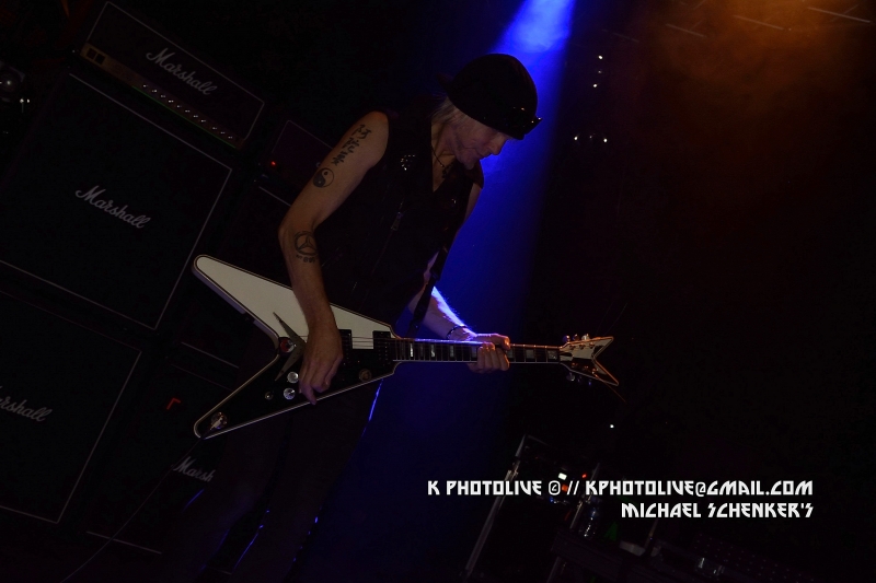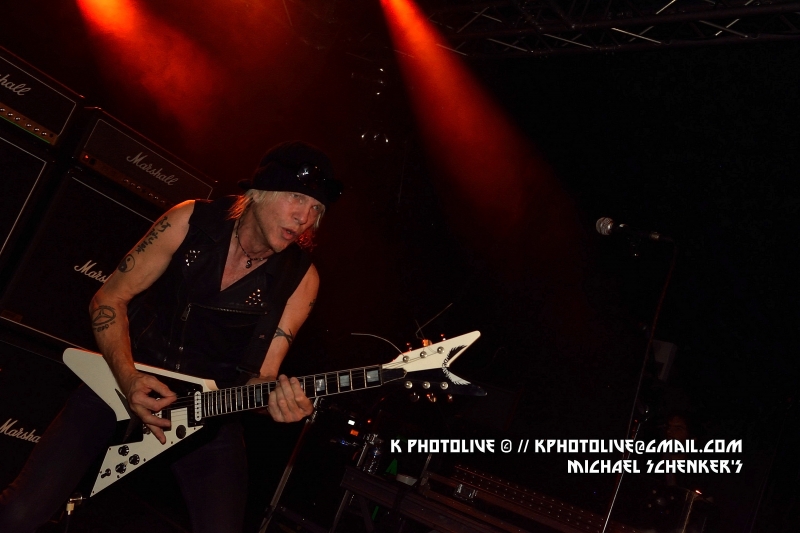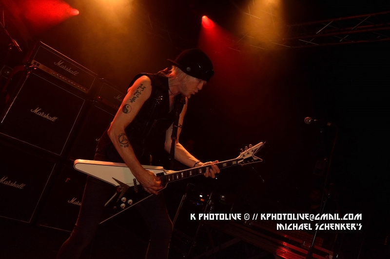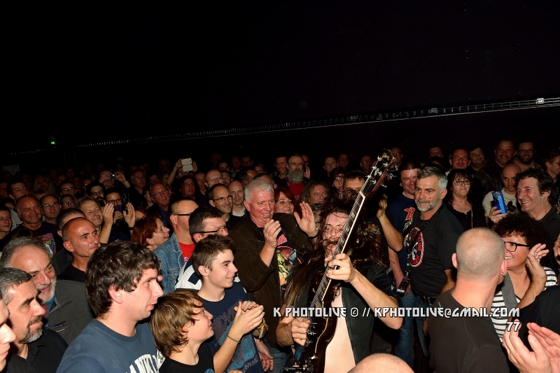 SCORPIONS, le mythique groupe de hard rock allemand (Land de Basse-Saxe, Nord), UFO, MSG, RAINBOW ont connu, au cours de ces 45 dernières années, un grand succès avec l'un ou l'autre de ces cinq artistes de renommée internationale dans leurs rangs. Inutile de préciser que Michael Schenker est et a été un modèle pour de nombreux guitaristes. En ce doux vendredi soir de novembre, c'est à La Tannerie de Bourg-en-Bresse que le groupe de MS a choisi de faire étape, entre le Luxembourg et la Provence, pour le plus grand plaisir des nombreux « hardeurs » quinquagénaires. C'est aussi l'occasion de présenter leur nouvel album (sorti en mars 2015) intitulé « Spirit On A Mission ». Les quelque 550 spectateurs de la salle bressane, pour la plupart nostalgiques des années 70-80, n'auront pas été déçus. Venus de l'Ain, des vastes régions Rhône-Alpes-Auvergne et Bourgogne-Franche-Comté, quelques mordus du hardrock des débuts les avaient déjà vus il y a juste un an à Annecy. Et ici, ce soir, le terme « événement » est employé dans sa juste acception. Dès 20h 40, c'est devant une salle bondée que le quartette '77, venant de Barcelone, donne le ton, accueilli par une belle ovation. Le public ne tarde pas à manifester son enthousiasme pour ces quatre gars, dont un très jeune batteur, énergique au possible, au talent prometteur. Une ambiance festive s'installe dans les rangs serrés qui se pressent dans la fosse et au-delà. On sait rapidement à qui et à quoi on a affaire, du hardrock lourd et puissant, techniquement de grande qualité, quoique assez classique. Face au public, dos au public, frontman dans la fosse, les Catalans n'ont pas de mal à déchaîner les dizaines de fans acquis à leur cause, qui frappent dans leurs mains...Ils sont tellement sympathiques, toujours souriants, ces quatre Espagnols aux cheveux longs ! Une deuxième descente dans l'arène, et le set de 45 minutes va s'achever sous les applaudissements de leurs nouveaux fans. Bizarrement, leur musique me rappelle par moments le rock qu'on écoutait la nuit, sur les radios, il y a quarante ans ou plus… Une pause, changement de plateau, tellement compacte, la foule...Les gens attendent sagement une petite demi-heure l'arrivée de Michael Schenker et de ses quatre compagnons. A 22 heures, le co-fondateur de SCORPIONS, casquette de laine noire sur la tête, lunettes de soleil par-dessus, pantalon moulant, se présente sur la scène, acclamé comme un héros...un guitar hero, ou un rescapé, oublions son parcours instable et tumultueux et retenons son visage pâle illuminé d'un éternel sourire, l'homme voûté, penché vers son public attentif et admiratif, toujours à droite de la scène...Il change à plusieurs reprises de guitare, lui le grand maître, le virtuose de la Gibson, le chanteur au perfecto, Doogie White, s'incline et baise la main d'une admiratrice, Francis Buchholz, le charismatique bassiste blond, est lui aussi attentivement observé, Wayne Findlay invite le public à participer au show, quant à Herman Rarebell, batteur sexagénaire, de grande notoriété, est-il dans un bon jour ? Certains le trouvent fatigué, « poussif », ai-je entendu. Pas de temps mort, on frappe dans les mains, on applaudit à l'envi, puis un joli solo de guitares, un Doogie White qui torture son pied de micro, disparaît et revient...une suite de séquences comme dans un film. Voilà le spectacle ! On assiste à quelques moments purement instrumentaux, le temps de reprendre son souffle...et Michael Schenker réapparaît sur le devant de la scène, une guitare blanche à double manche à la main, concentré, penché sur elle comme une mère sur son enfant, lèvres tremblantes. Le temps passe, la température monte...Doogie retire son perfecto et enchaîne aussitôt quelques morceaux connus et chaleureusement applaudis. Rien d'ennuyeux, tout semble naturel lorsque la foule reprend « Rock Bottom ». Le guitariste de Hanovre caresse ses guitares, leur parle, leur adresse compliments ou reproches, image attendrissante que d'aucuns jugent dérisoire ou puérile. On annonce le single « Communion », on s'achemine donc vers la fin du set, fausse fin en réalité, car nous avons droit à un long final interactif. Le concert de MICHAEL SCHENKER'S TEMPLE OF ROCK aura duré une heure et quarante minutes. Plus habitué à chroniquer des concerts de rock metal, j'ai tenté sans a-priori et sans préjugé de décrire et commenter ce que j'ai vu et entendu, durant cette « soirée pas comme les autres ». De l'émotion, oui, des questions aussi. En attendant l'autre Schenker, Rudolf, le 30 novembre prochain avec SCORPIONS à Lyon. Il convient de remercier La Tannerie pour l'accueil réservé à tous, les spectateurs venus en nombre et parfois de très loin. Sans oublier Didier pour sa précieuse collaboration comme photographe. Bravo aux artistes des deux groupes ! |