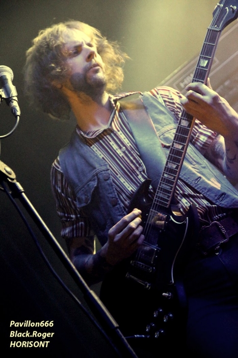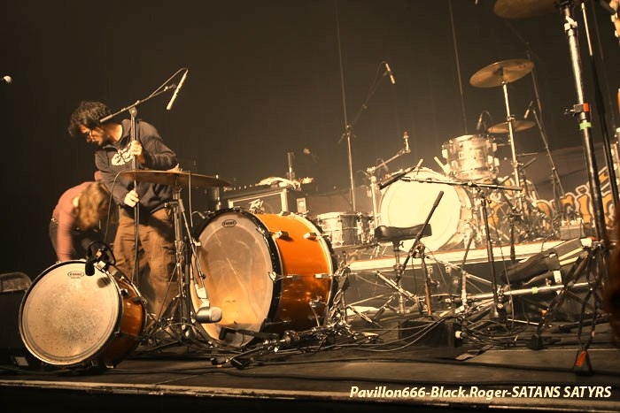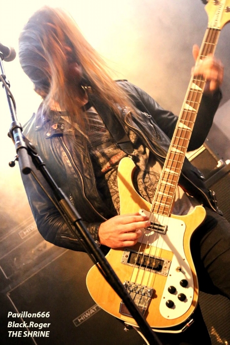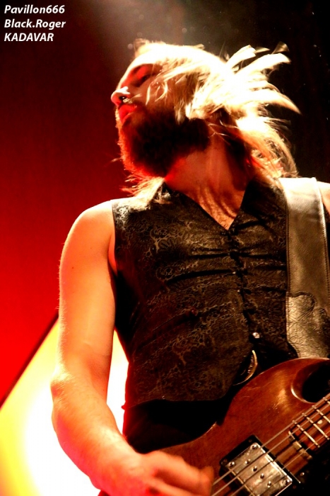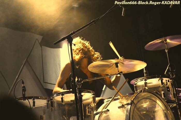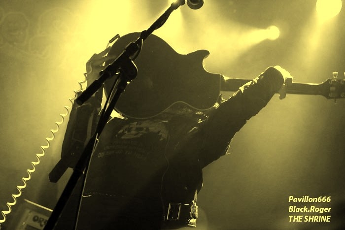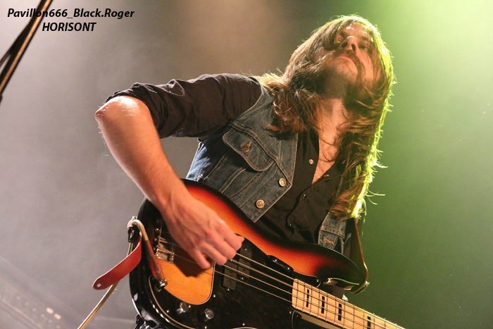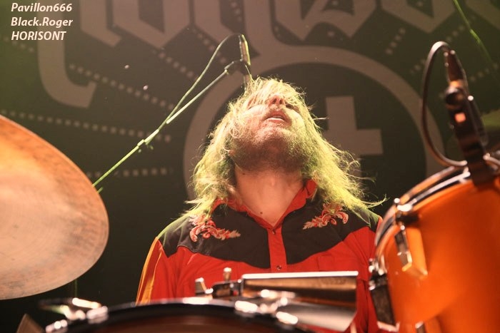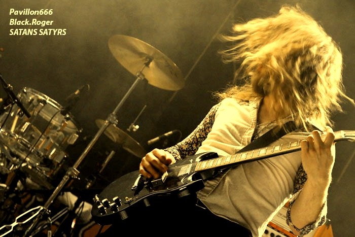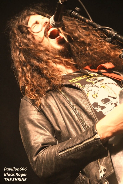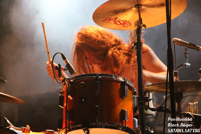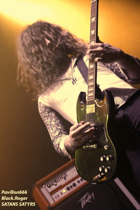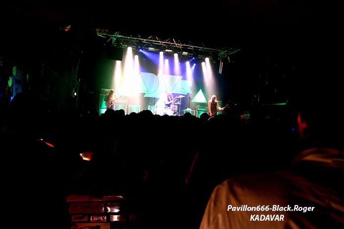 Dans cet esprit Médiatone Lyon nous propose au Kao de Lyon ce Lundi 23 Novembre un plateau de choix nettement orienté stoner tout simplement. Au menu les Allemands de KADAVAR, les Californiens de THE SHRINE, les ricains de SATAN’S SATYRS et les Suédois d’HORISONT, pour une soirée gros riffs enfumés et psychés qui débute à 19 heures et des poussières. HORISONT, vous de connaissez pas ? Alors vous allez apprendre à les connaitre ce soir durant la petite demi-heure qui leur est allouée en ouverture de la soirée. En effet ce quatuor de Gothenburg (Suède) ne donne pas dans le death mélodique mais va créer la surprise avec un set incroyable de hard-rock classique certes, mais d’une efficacité redoutable en live. La sortie d’un 4ème album « Odyssey » leur donne l’occasion de partir en tournée avec Kadavar et ils ont bien raison car leur prestation courte mais intense va nous faire découvrir ce groupe au look 70’s riche de par ses compositions et leur interprétation en live. Leur son vintage nous fait remonter le temps et nous ramène au old-Deep Purple, au Thin Lizzy des débuts et à Angel Witch aussi précurseur de la NWOBHM. Un chanteur actionnant les bons vieux claviers, un guitariste discret mais bien net dans ses cordes, un bassiste pour le fond sonore épais et un batteur incroyable et fabuleux envoient le son. D’ailleurs ce soir les 4 batteurs qui vont se succéder sur les planches seront de haut niveau il n’y a pas photo. Pour en revenir à HORISONT nous avons prit une claque tout simplement, que le revival crade et poussiéreux est bon à entendre avec des musiciens de cette trempe, avec une tenue de scène très étudiée aussi. Excellent fatalement, énorme aussi vous l’aurez comprit. Passons maintenant à une formule trio avec les Virginiens de SATAN’S SATYRS qui eux nous arrivent des « states » avec sous leurs bras un troisième opus à défendre intitulé « Don’t Deliver Us ». Ces Satyrs fondés par le batteur multi/instrumentaliste Claythanas nous proposent un univers assez « kitch » au final avec une imagerie satanique de bazar comme il s’en faisait il y a plus de quarante ans dans le rock, dur si vous voulez. Ces Satyrs qui envoient du doom à la Electric Wizard mais ici un peu plus crados avec une défonce punk qui vient de temps en temps ruer dans les brancards du rock avec un esprit rebelle sentant la Harley et la poussière de la route. La voix du chanteur est un peu criarde, à rapprocher de celle d’un certain Robert plant, mais l’on s’y fait vite. Et puis il y a cette batterie redoutable qui va finir en morceaux sur scène et devant dans la fosse. On se serait cru à un concert des WHO qui cassaient tout en fin de set dans les sixties, mais vous n’étiez pas encore nés à cette époque ! Au final ça nous a bien , hein les rockers de tous poils biens dans vos « santiags ». Avez-vous déjà entendu parler du groupe THE SHRINE ? Moi si et je suis curieux de voir enfin à quoi ça ressemble en live. En provenance de Los Angeles voici donc devant nous ce trio étiqueté « psychédélic violence rock n’roll » Donc cette prestation ne devrait pas ressembler à de la « variétoche » de super-marché style « popette à minettes », bien que je n’ai rien contre les chattes et jeunes demoiselles ici présentes soit dit en passant. Alors, vous mettez vos casques lourds à l’image du merch du groupe et préparez-vous ça va « swinguer », rocker plutôt avec les titres notamment de leur dernier enregistrement en date « Rare Breed » paru chez Century Media excusez du peu ! Vous aimez le stoner, vous aimez le punk, vous aimez les ambiances psyché ? Et bien The Shrine combine ces éléments avec un certain doigté, une certaine variété instaurée pour des ambiances « acides » et des réveils brutaux, rock n’roll en diable. N’oublions pas les soli en prime, longs, bien longs, délicieusement planants et comme disait notre Antoine national « la fumée dans les yeux, un éléphant me regarde » souvenez vous en les plus anciens d’entre vous. Résultat un show particulier qui avait sa place dans cette soirée, un régal ! Il faudra un peu plus de temps pour installer la scène avant la venue des Berlinois du Stoner. Car KADAVAR s’est mis aux triangles lumineux en décorum et le kit de batterie aux éléments transparents va être placé carrément en bordure de scène où les spectateurs pourront presque le toucher du doigt ! Après « Kadavar » en 2012, « Abra Kadavar » en 2013, voici en cette année 2015 la sortie du i opus des Allemands intitulé tout simplement « Berlin » que le trio va nous présenter en outre ce soir. Mais avant tout une question se pose, pourquoi ce trio Berlinois a-t-il réussi en 5 ans et trois albums à tenir le « haut du pavé » dans cette veine revival 70’s, labellisé rock stoner ou metal/rock si ça vous chante ? On ne le sait ps vraiment au final. Peut-être que ces barbus adorateurs de l’esprit rock des années bénies d’il y a plus de 40ans ont su dépoussiérer le style en lui redonnant vie avec des riffs accrocheurs et refrains entêtants dans le domaine sale, cru et aventureux de l’époque évoquée ? En tous cas le fait est là et Kadavar continue de défrayer la chronique avec des tournées incessantes créant un certain « buzz » autour de lui. Et même si leur dernier enregistrement souffre de longueurs nous retrouvons en son milieu des titres qui font mouche grâce à la qualité des musiciens et leurs prestation scéniques sans faute. Ils semblent y croire, nous aussi ! Excellent moment passé hier au soir en leur compagnie avec rappel à la clé évidemment. Nous aimons bien entendu ce qui transparait comme une certaine sincérité et non une récupération d’un certain passéisme à la mode. Ne me reste qu’à remercier Médiatone pour cette affiche, qui même proposée un Lundi soir, à su rassembler un public conséquent. Meri aux 4 fo