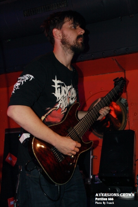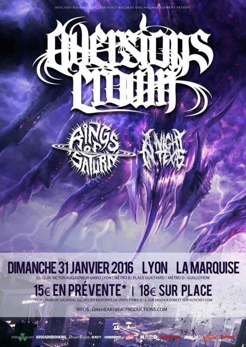 En effet, pour une fois Paris va être délaissée au profit de Lyon pour nous présenter une belle affiche pleine de promesse ce soir à la marquise. Il sera donc question de metal extrême au programme avec trois jeunes groupes australiens et américains. Les australiens de « A Night In Texas » sont les premiers à prendre d’assaut la petite scène de La Marquise. Raffut et sueur assurés, ils vont déchainer les watts comme pas deux en surfant sur la vague résolument extrême de leur metal particulièrement violent et incisif. Sans frime, ni esbroufe, voici un groupe plutôt brut de décoffrage qui va direct au plus simple. Ces mecs sont captivants et jouent particulièrement bien. Leur chanteur est un très bon leader assez charismatique qui n’hésite pas à inviter le public à se bouger. C’est avec un son énorme que les titres s’enchainent et La Marquise commence à tanguer. Le public répond présent et les australiens assurent un bon set. A Night In Texas est le groupe le plus expérimenté des trois présents ce soir et très franchement, cela se sent immédiatement au vu du niveau de leur prestation sur scène. Les guitares sont réellement énormes et tout aussi tranchantes. Cela va de la rythmique bien lourde au solo coupant comme un rasoir. La section rythmique en impose aussi. Le duo basse batterie est hyper costaud et assure une solide ossature à chaque titre du set. La voix très death du chanteur vient se poser sur le tout jet donne un ensemble hyper cohérent et ultra solide à la fois. Question metal, A Night In Texas ne fait pas dans l’acier, mais plutôt dans la fonte. Ce jeune groupe australien à l’avenir prometteur possède déjà à son tableau de chasse deux Ep et un album, « The God Delusion » et sans hésitation je peux affirmer qu’ils sont mon coup de cœur du plateau de cette soirée. De plus, j’ai eu l’opportunité de discuter un peu avec eux et ce sont des mecs vraiment sympathiques et agréables qui ont beaucoup d’humour. Par conséquent, pour ceux qui ne les connaissent pas, ils sont à découvrir d’urgence. C’est au tour des américains de Rings Of Saturn de monter sur les planches et de nous montrer pourquoi leur musique a suscité autant d’engouement sur youtube. Il est vrai qu’au premier abord, leur line up surprend un peu. Le combo ne possède pas de basse et ils ont des guitares avec des manches pas possible avec plein de cordes partout. Les deux guitaristes doivent bien en comptabiliser au moins 16 à eux deux. A cela on ajoute un chanteur, un batteur, un son de basse préenregistré et cela donne une vue d’ensemble du combo californien. C’est un groupe très intéressant même s’il paraît légèrement décalé au sein de l’affiche de ce soir. Même s’ils font preuve d’une certaine agressivité dans leurs morceaux, il n’en demeure pas moins que c’est un groupe avant tout axé sur la technique de jeu et la mélodie, avec des schémas et des plans musicaux particulièrement complexes. Par moment, on sort même complètement du contexte metal pour aller vers des sphères beaucoup plus progressives. Techniquement, les deux guitaristes de Rings Of Saturn sont particulièrement doués, c’est déjà du gros niveau. Dans un esprit très inattendu, très californien, un des deux gratteux porte un bonnet rouge avec deux paires de lunettes de soleil. Est-ce une astuce pour mieux jouer ? Très franchement je l’ignore, d’autant plus que la seconde paire ne lui a pas servi de la soirée, donc cela restera une énigme… Le chanteur de Rings Of Saturn est très accrocheur. Au beau milieu de cette prestation à la fois très progressive et très technique, il vient poser comme un coup de masse un énorme chant tendance hardcore. Ce chant en demi teinte à la fois clair et hurlé vient rehausser tout l’ensemble qui par moment reprend des penchants plus ou moins deathcore. La seule chose un peu étrange est cette basse virtuelle qui revient comme un leitmotiv sonore et qui décolore un peu la cohérence musicale des californiens en apportant un petit côté artificiel à ce combo des plus étonnant. Pour clôturer cette soirée riche en découvertes, les australiens d’Aversions Crown entrent en piste. Non content d’être la tête d’affiche, ils vont en plus se payer le luxe de retourner La Marquise. Avec la sortie de leur album « Tyran » en 2014, les australiens délivrent un gros deathcore hyper énergique avec une grosse puissance de feu transformant pour un soir notre petite Marquise en navire de ligne de type cuirassé. Aversions Crown est un combo très carré et vraiment en place. Malgré les grosses saturations et le jeu destructeur de la section rythmique, il n’y a absolument rien qui déborde. Chez Aversions Crown, tout le monde semble savoir bosser ensemble et cela ne rend le groupe que meilleur. Les deux guitares font un maximum de boulot sur scène échangeant tour à tour riffs et solos. Et même si le son est énorme et tout en puissance, il passe nickel dans les façades, ce qui fait que le rendu est très bon et permet de souligner l’excellente qualité sonore de leur performance. Malgré l’étroitesse de la scène de La Marquise, les cinq australiens sont sans cesse en mouvement. Le set est vraiment vivant, le public bouge et l’ambiance est particulièrement bonne. Aversions Crown est un groupe chaleureux qui n’hésite pas à échanger avec le public et à se donner à 200%. Pendant qu’une chaleur atroce et suffocante monte dans La marquise, tant et si bien que l’on se croirait en plein sud Vietnam, le quintet ne lâche rien et enfonce la pédale d’accélérateur tout en continuant d’envoyer des tonnes de décibels à chaque titre qui passe. Le duo basse batterie est percussif au possible, tandis que les deux grattes sont sur la fréquence crache la mort. Au chant, Mark Poida met littéralement ses tripes sur scène et balance sans concession un chant hurlé bien 