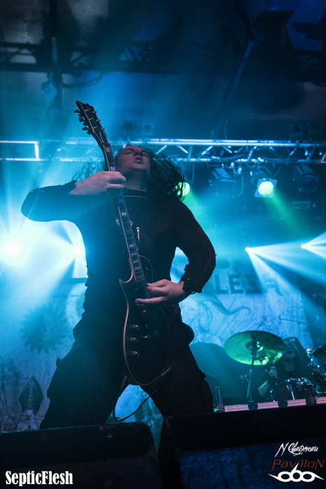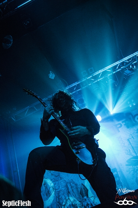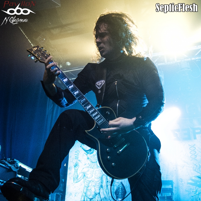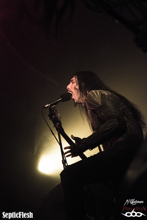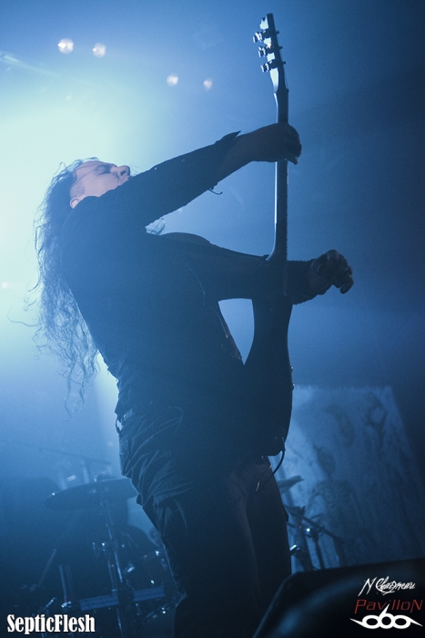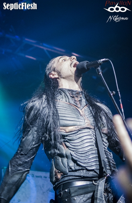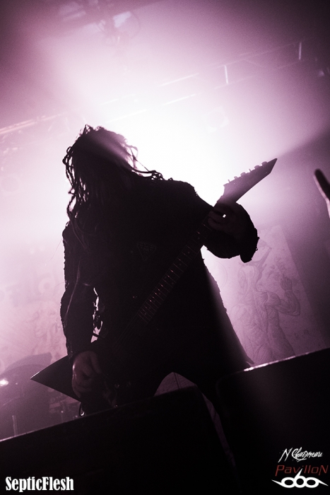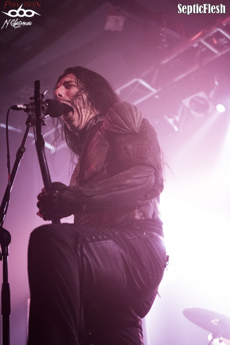Après un petit quart d'heure d'attente ladite suite arrive. Tandis que les lumières n'éteignent de nouveau, une mélodie emplit la salle. Les amateurs de SEPTICFLESH auront reconnu l'intro de DOGMA sur laquelle les grecs ouvrent leurs shows depuis la sortie de l'album TITAN. L'ambiance change drastiquement par rapport au show d'ABORTED : à l'hyperactivité scénique de SVEN succède la puissance stoïque de SPIROS "SETH" ANTONIOU. Cette différence se ressent également dans le public : pas de slam ni de circle pit mais une alternance de pogos et d'arrêts soudains. Car si les morceaux de SEPTICFLESH peuvent nous secouer aussi bien que ceux d'ABORTED, certains passages mélodiques figent la salle quelques secondes, jusque ce qu'il faut pour repartir de plus belle.
