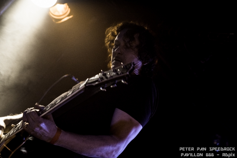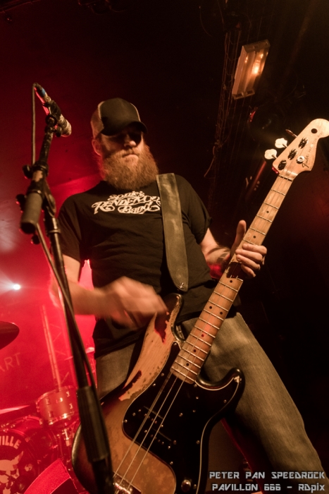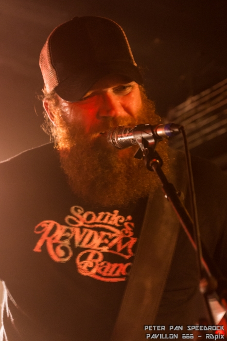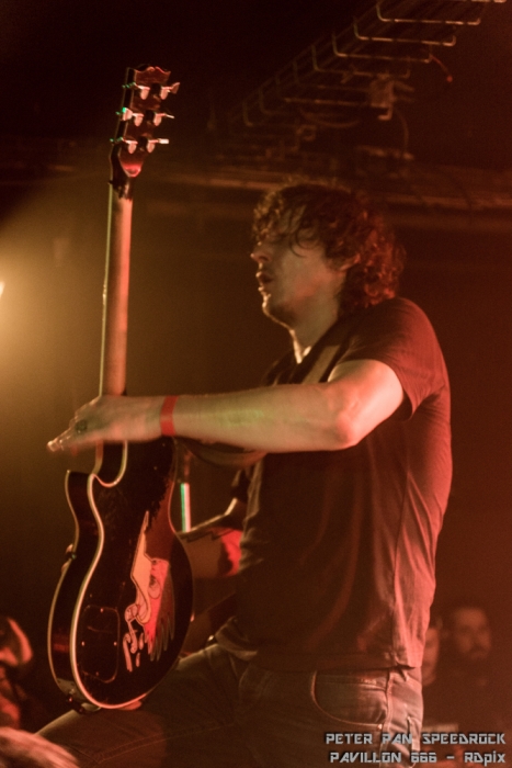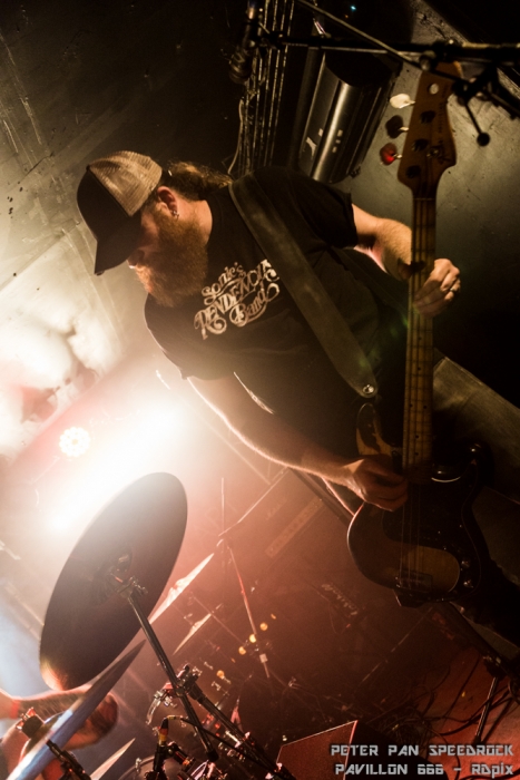 C’est le power trio du plat pays qui a repris les rênes ensuite. Face à une salle qui commençait tout juste à frémir, Peter Pan Speedrock à fait monter la température d’un cran. Leur style : des sonorités southern rock agressives couplées à des rythmiques arrivant parfois à la limite du hardcore. Tu mixe un redneck du Kentucky avec un hooligan Hollandais, tu lui mets une guitare dans les mains et c’est probablement ce genre de musique qui en ressortirait. Ajoute à ça une basse très (trop ?) présente et un batteur-jongleur chaud comme la braise, ça te donne le cocktail explosif mené par un guitariste-vocaliste au charisme indéniable. Il a fallu un morceau au groupe pour faire passer la salle de l’état frémissant à l’état d’ébullition bien avancé.
