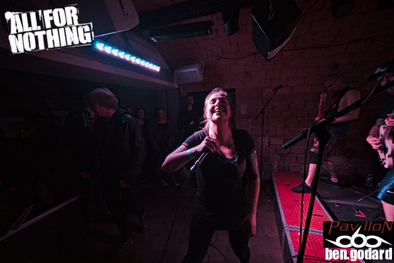 Tout d'abord, pas grand monde à l'éntrée. Certains râlent un peu que le public coreux ne soit pas là, et c'est pas vraiment faux. Soit, il faut quand même aller voir ce que ça donne à l'intérieur. Il n'y a pas foule non plus. Peu importe Cowards fait ce qu'il a à faire. Je ne sais pas si c'est la salle ou de moi mais leur set fût l'un des meilleurs que j'ai pu voir d'eux. Le chanteur braille dans son micro avec véhémence, ça sonne bien malsain! Leur style est assez orienté powerviolence/hardcore assez dépressif. Mention spécial au guitariste qui joue diaboliquement avec le public grâce à son faciès limite flippant. Le batteur est un peu en retrait, tout comme les fans qui laissent le devant de la salle au chanteur pour qu'il puisse s'exprimer librement. Les riffs, assez métal mais bien sombres, sont entrainants et on en redemande! Après quelques coups de guitares aussi tranchant que la lame d'une hâche derrière la nuque, Cowards en rajoute une couche avec quelques larsen sournois qui nous achèvent. La suite c'est All For Nothing, 5 hollandais avec une femme, Cindy, au chant. All For Nothing c'est quand même devenu en quelques années un groupe populaire dans le milieu du hardcore. Vous les avez peut-être vu lors du Persistence Tour 2015 (avec Walls Of Jericho notamment) ou bien au fameux Superbowl Of Hardcore rennais. Ce soir, c'est donc beaucoup plus intime comme soirée! D'ailleurs les têtes habituelles ne sont pas vraiment là, à quelques exceptions prêts. Il faut donc s'habituer à voir des pogos plutôt que des moshers furieux. Malgrés la hauteur très limite, le set commence par un saut effectués par les guitaristes et le bassiste. Oui, s'ils veulent se lâcher, ils le feront. Cindy alpague la foule, et son sourire et sa bonne humeur permettent au public de s'approcher. L'audience semble d'ailleurs découvrir pour la première fois ce groupe. L'énergie déployée par les uns et les autres membres du groupe permet au public de se lâcher plus. Un nano circle pit aura même été aperçu! Les morceaux s'enchainent avec des riffs saccadés, d'autres sont plus rapides, inspiré d'un bon vieux punk. Finalement c'est assez variable. Cindy nous parle brièvement de leur tournée en Indonésie qui semble les avoir époustouflés. En fait, All For Nothing se donne à fond et ça fait plaisir à voir! Ils communiquent avec le public, ils motivent les plus réticents..Le set était juste excellent avec une douzaine de titres. Le Klub, petite salle réputée de la scène métal parisienne, à bien géré la venue de groupes hardcore. Le public hardcore n'avait pas trop fait le déplacement mais fût finalement remplacé par de jeunes personnes qui ont tout de même bien donné. Les groupes ont fait leur show sans concession et avec sérieux. A refaire et à revoir! Merci à Pavillon, au Klub et à l'orga pour le pass' photo. |