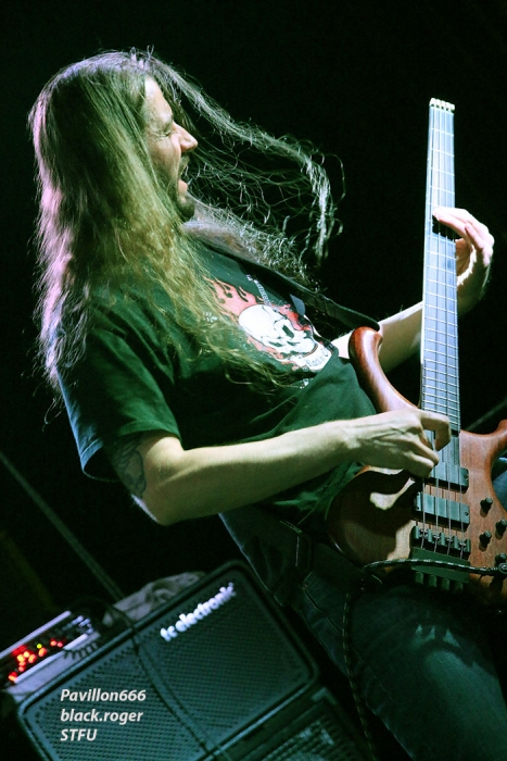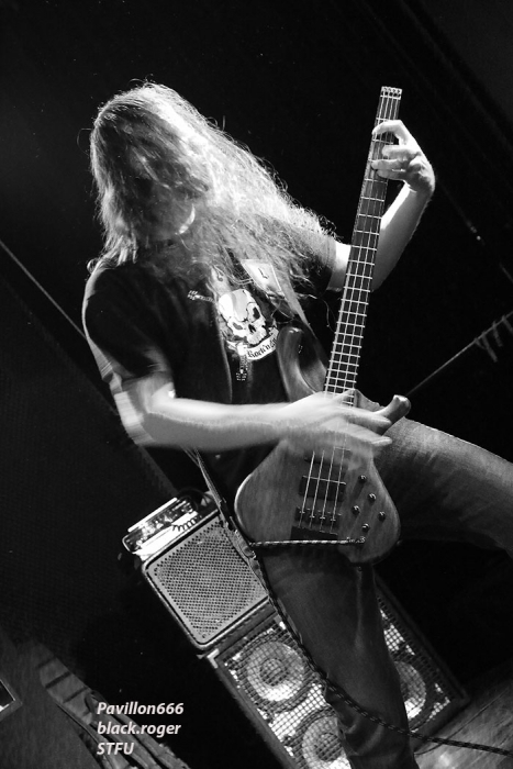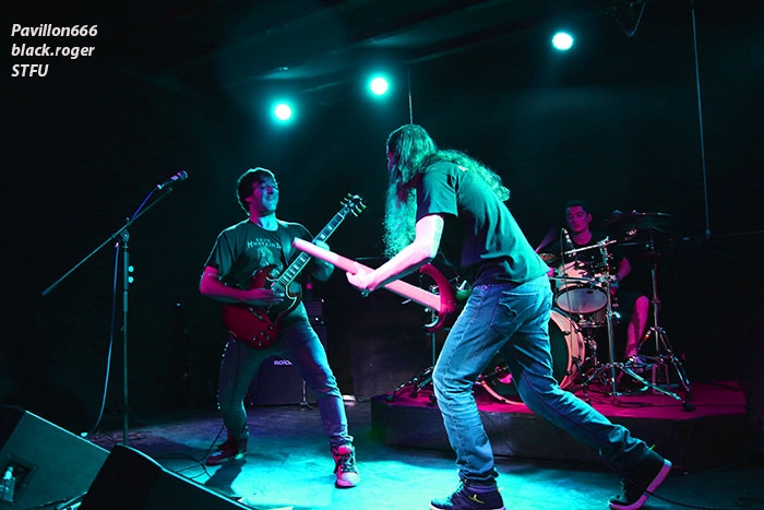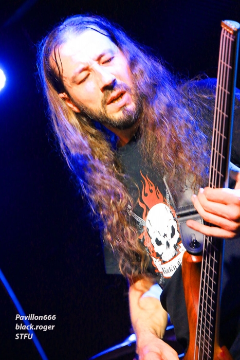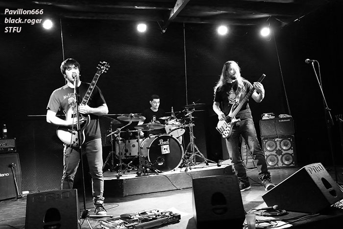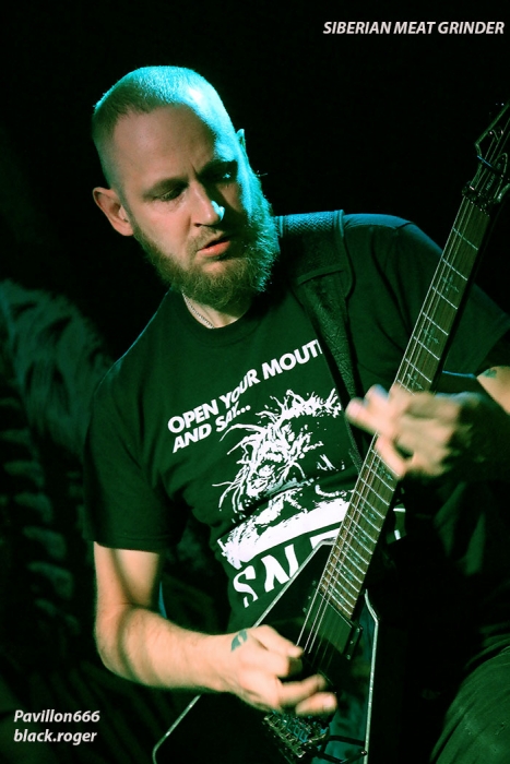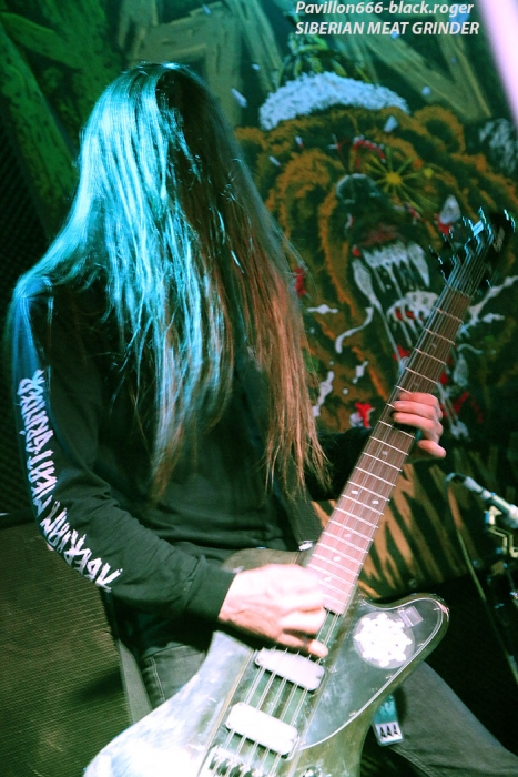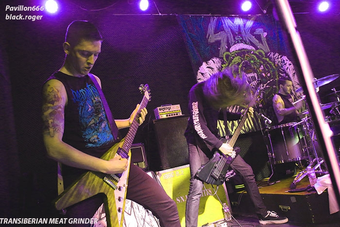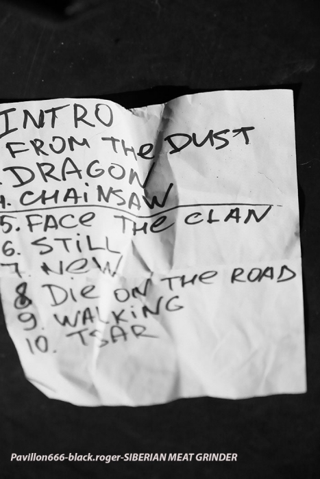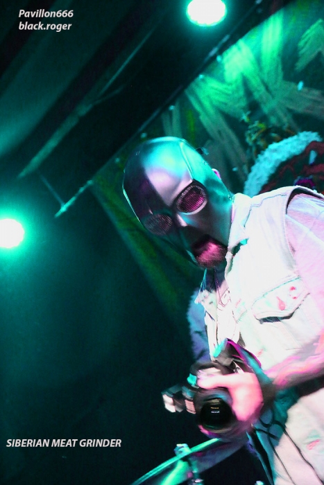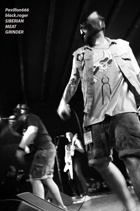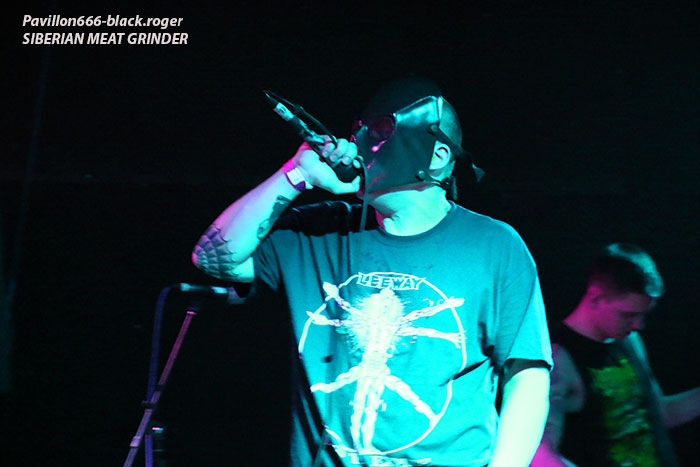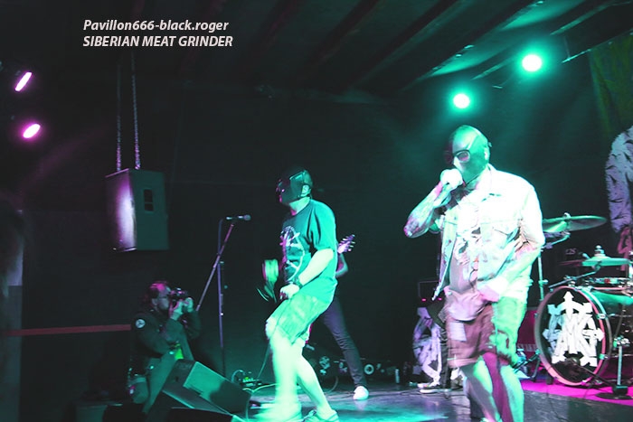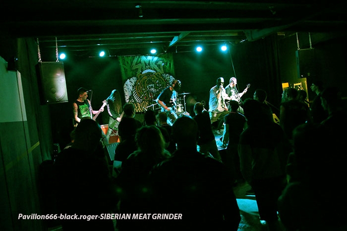 STFU est un trio qui fait du bruit, c’est ce que je pense dès le premier titre ce soir. Un chanteur/guitariste se roulant par terre, un bassiste issu du thrash des 80’s et un batteur acharné sur ses fûts, voilà une présentation sommaire de la formation de Lugdunum. Mais que nous proposent-ils donc au travers de compositions rapides, violentes, mais aussi incendiaires ? Et bien du crossover engagé et enragé, cocktail détonant mélangeant tout ce qui traine dans l’extrême, du thrash, du punk, du hardcore et autres joyeusetés qui arrachent tout simplement. Le chanteur fait « miauler » sa 6 cordes n’oubliant pas des soli lame de rasoir, le bassiste fait trembler l’ampli-basse, et le batteur sait jongler avec ses baguettes. Que demander de plus ? Rien en fait, ce trio ne demande qu’à tourner, tourner encore et enregistrer accessoirement, un nouvel EP étant prévu courant 2016, on aime ! Set-List en photo. Et maintenant, place rase sur la scène, on déménage tout, amplis, kit de batterie, pour installer nos Russes préférés qui tournent actuellement en Europe ne ménageant pas leur énergie, hier à Rennes, aujourd’hui à Lyon et demain à Montpellier… Au bout d’un (long) moment, SIBERIAN MEAT GRINDER est enfin prêt à déverser sa rage et sa violence à l’aide d’un crossover thrash/hardcore/punk//grind et plus si affinités, aargh ! Et l’on sent que ça va faire mal, très mal d’ici quelques minutes car le « check » nous fait ouïr un son énorme en prélude du set. Effectivement, le sextette se lance soudain dans un tourbillon extrême d’une rare intensité avec un son à décorner un troupeau de taureaux en rut. Là devant nous deux « aboyeurs » masqués mènent la danse et à leurs côtés deux guitaristes, un bassiste (5 cordes) et un batteur nous font entrevoir, musicalement parlant, les portes de l’enfer. Diable, comment résister à ce mur sonore nous faisant penser au tarmac de l’aéroport de Roissy ? Alors, devant l’estrade coreux et métalleux de tous poils vont être obligés de s’agiter dans tous les sens, et c’est donc parti pour un bon moment de folie ordinaire, de défoulement old-school, mais où est donc passée ma godasse ? Ici pas de post-métal alambiqué et tordu, ici on vous prend à la gorge sur une rythmique effroyablement efficace, ici on vient vous provoquer non-stop devant un mur de guitares effarant et thrashisant à l’envi, alors, « destroy everything » (comme dirait jamey jasta – Hatebreed) ! Un micro d’une main, un appareil photo de l’autre, l’un des deux frontmen photographie non-stop le public, les flashes sont inversés, ou les photographes photograpiés ! Bref, l’ambiance est là, une ambiance qui fait plaisir à voir dans la chaleur du Warmaudio. Mais le set se termine, quand on aime on ne voit pas le temps passer, alors rappel réclamé, rappel effectué, puis s’en vont. Décidément, en Russie il y a du bon, encore un constat édifiant ce soir en voyant ces musiciens qui viennent jusqu’en France nous balancer des sets de furieux, carrés et sans bavure, la classe quoi !!! Pour info, ce groupe a été formé en 2010 par des membres de différentes formations Russes de hardcore, punk et rap, comme notamment le groupe MOSCOW DEATH BRIGADE. Deux albums à leur actif « hail to the tsar » (2012) et « versus the world » (2013), des graffitis bien entendus et des tournées à n’en plus finir. Set-list en photo. En conclusion, une belle découverte, groupes excellents en live tout simplement. Merci le Warmaudio de nous avoir proposé ce concert bien particulier, même un lundi soir ! |