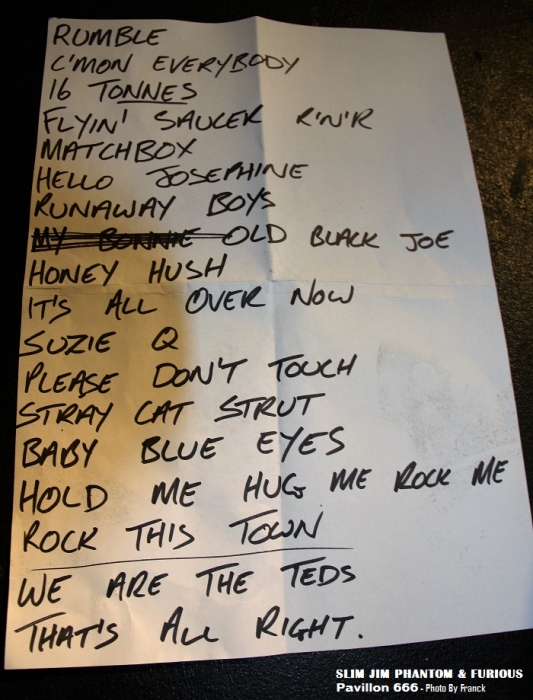 Durant le concert, Slim Jim est venu s’agenouiller en bord de scène près d’un petit garçon qui était assis là et lui prenant la joue il lui a dit : « Il faut sourire mon grand, t’’es à un concert de rockabilly, c’est génial !! ». Il reviendra d’ailleurs le voir à la fin du concert avant de s’éclipser et de signer quelques autographes au public.
