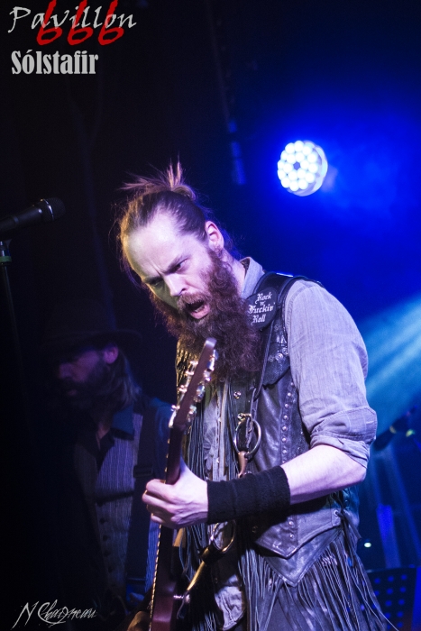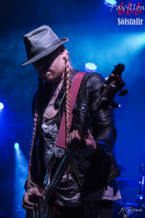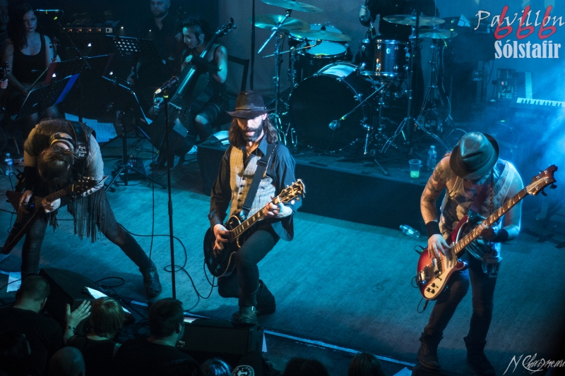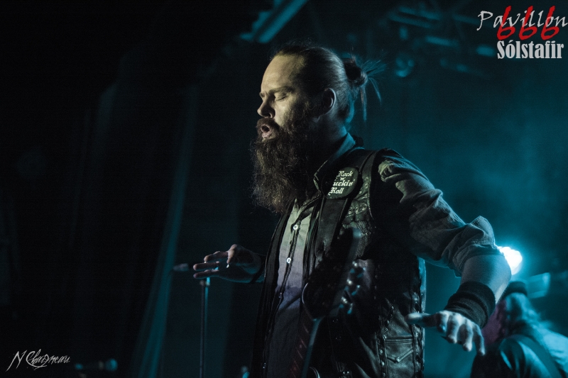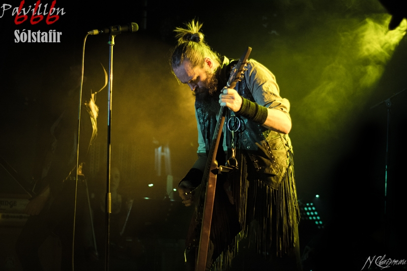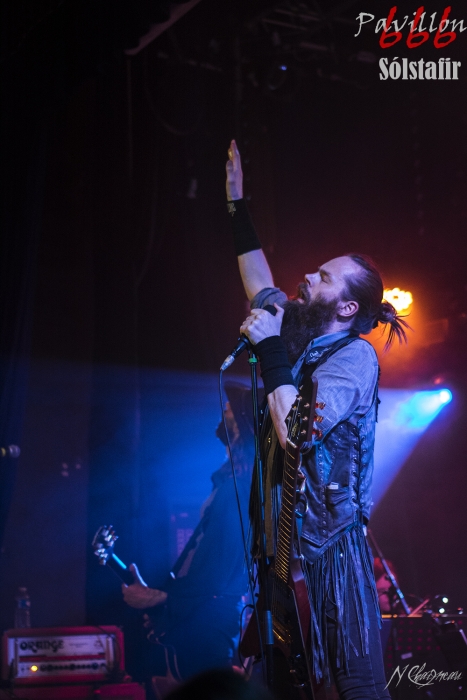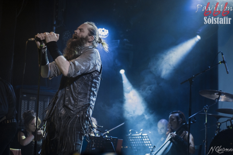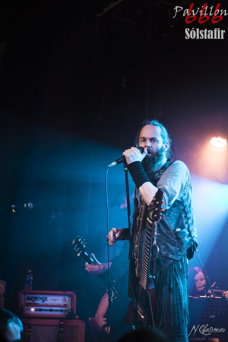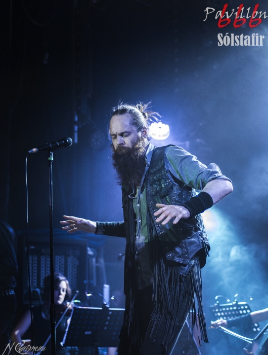 Avant que le concert ne commence, on sent l’assemblée fébrile, pressée d’assister à ce concert annoncé comme exceptionnel. Dans l’ambiance feutrée du divan du Monde s’installent trois violonistes, un violoncelliste, un pianiste et le batteur, bientôt suivis par Sæþór Maríus "Pjúddi" Sæþórsson le guitariste au chapeau, Svavar "Svabbi" Austmann le bassiste aux longues tresses… et enfin Aðalbjörn "Addi" Tryggvason, le chanteur au charisme indéniable. Lentement, très lentement, les premiers sons de Dagmál s’élèvent… et c’est parti ! Aðalbjörn laisse passer une intro plus longue que dans la version album et semble profiter de la musique autant que s’il était dans le public. Sa voix emplit ensuite le Divan de sa tonalité déchirée si particulière. Et puis tombé de rideau. Quasiment plus de lumière, plus un son. Le public retient son souffle et on ne distingue plus que les silhouettes des membres du groupe alors qu’un son de violon qui semble lointain s’impose et monopolise l’espace physique et sonore. Le «Ótta» Show nous amène directement son titre éponyme pour le plus grand bonheur de chacun ici. Le morceau à la fois planant et déchirant est exécuté à la perfection et nous prend aux tripes au point qu’on en oublie parfois de respirer. La performance d’Aðalbjörn est impressionnante de puissance et d’expressivité. Sur un écran en fond de scène défilent des images des côtes déchirées d’Islande. Sólstafir nous fait véritablement voyager. Au bout des dix minutes du morceau on se demande un peu où on est. Le piano nous le rappelle, accompagné par un quasi murmure d’Addi bientôt rejoint par les violons. C’est Lágnætti qui continue le voyage. Mais avec ce morceau le concert devient également beaucoup plus péchu : la batterie s’emballe, la guitare gagne en puissance, Aðalbjörn danse tel un serpent sur scène et les longues tresses rousses de Svavar ne semblent plus pouvoir se poser. Côté public, on assiste à une sorte d’étrange frénésie immobile : si on est transportés et dynamisés par ce concert l’ambiance n’est pas non plus au pogo et la place manque pour danser comme le chanteur. La puissance transmise par le groupe est donc contenue en chacun. Avec Rismál on a une retombée brutale dans un morceau plus lourd et mélancolique mais Miðdegi et Nόn renouent avec un peu plus de dynamisme sans pour autant être exempts des émotions que Sólstafir nous transmet. Aðalbjörn est impressionnant d’expressions faciales, il met tout de lui-même dans ce concert et chaque émotion transmise par son chant est visiblement extrêmement profonde. Le groupe semble avoir décidé d’alterner entre les types de morceaux puisque le rythme redescend de nouveau sur Midaftann. Nattmál nous offre ensuite une remontée en dents de scie de plus de dix minutes entre accélérations instrumentales et moments de calmes sur la voix d’Addi. Nombreux sont les membres de l’assemblée qu’on voit les yeux fermés, à simplement profiter du son et des vibrations transmises par les Islandais. Le groupe quitte alors la scène et un écran descend alors du plafond en avant-scène. Un extrait du film « When the Raven flies » de 1984, film culte pour les nordiques, est projeté pendant une vingtaine de minutes. Au retour des membres de Sólstafir sans leurs musiciens sur scène on quitte l’album Ótta pour Djákninn issue de Svartir Sandar. Le groupe exprime ensuite une fibre plus punk sur She Destroys et Necrologue venus de Köld. La salle accueille extrêmement bien cette déferlante pleine de punch qui offre un contraste avec la première partie du concert. On apprécie de voir Aðalbjörn et Svavar se défouler. Avec Svartir Sandar issue de l’album éponyme le concert garde cette veine plus hard mais Aðalbjörn offre une performance vocale à la frontière entre les morceaux précédents et sa façon plus profonde de chanter sur Ótta. Silence dans la salle. Chuchotements de batterie. Quelques accords s’y ajoutent. On a reconnu Fjara et on sent l’excitation dans le public sans pour autant que l’assemblée ne perturbe par le moindre son le démarrage de la chanson. Lorsqu’Addi chante on ne sait pas vraiment si on a envie que le morceau stagne à ce passage ou si on est pressé qu’il ne s’envole… puis la montée en pression s’effectue et on sent des vagues de frissons parcourir l’assemblée. On assiste alors à une scène impressionnante : la totalité de l’assemblée reprend en chœur l’air de la chanson. Ce n’est plus un concert, c’est une communion. Aðalbjörn se remet à danser sur scène, à mi-chemin entre le serpent et le félin. Malgré que le morceau soit considérablement rallongé il est beaucoup trop court à mon goût et doit malheureusement finir. Sólstafir quitte finalement la scène sous des applaudissements nourris qui nous donnent l’impression que la salle est bien plus remplie que sa capacité. Mais ce concert ne peut pas se finir sans rappel : Le groupe revient le temps de jouer Goddess qui finalement fait très bien la synthèse de tout le set. On y retrouve les passages mélancoliques, les montées en pression et les éclats de voix d’Aðalbjörn. Ce dernier s’offre un bain de foule. Cette fois c’est bel et bien fini, après plus de deux heures plus qu’intenses les membres de Sólstafir et leurs musiciens posent leurs instruments et viennent saluer le public. Je sors personnellement retourné de ce concert et c’est le cas de beaucoup ici. Sólstafir nous a offert un moment extraordinaire avec une très grande proximité. Le son était impeccable et la performance elle-même à la hauteur de ce qu’on attendait. Je tiens à noter une petite anecdote qui démontre l’attention qu’ont eue les membres du groupe pour le public : lorsqu’une jeune fille a fait un malaise dans la fosse, Svavar l’a immédiatement remarquée et Aðalbjörn a arrê