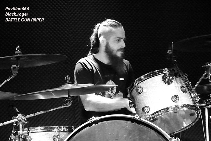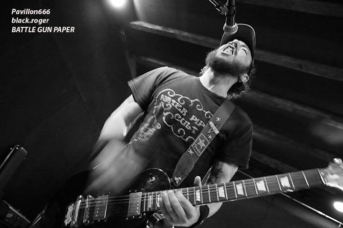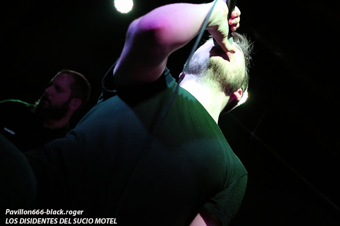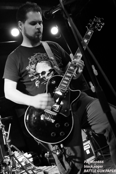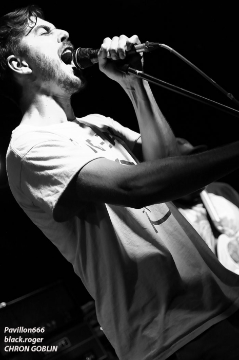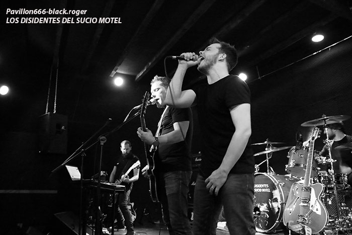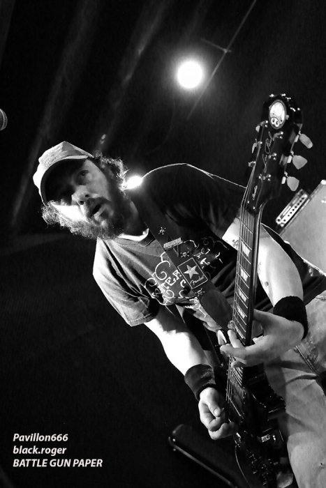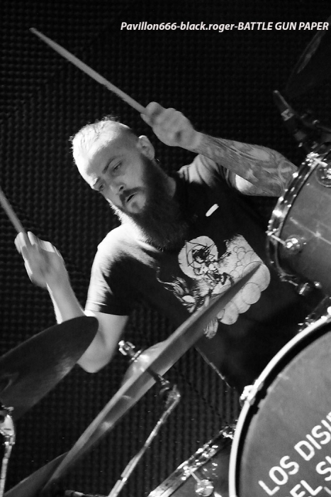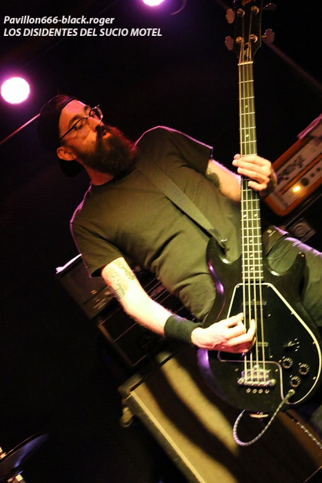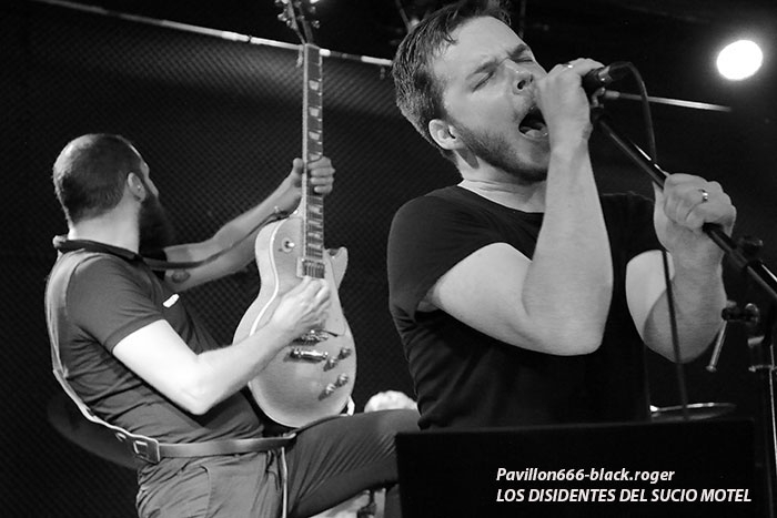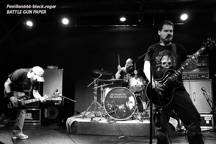 Dès 20heures, le trio Montpelliérain BATTLE GUN PAPER donne le « la » de la soirée avec son fuzz-rock, stoner si vous voulez, s’apparentant à du Karma To Burn, le chant en plus, mais pas que… Ces rockers aux influences des 90’s n’inventent rien mais envoient du lourd, du pachydermique entrecoupé d’envolées bien rock n’roll. D’ailleurs, guitare, basse, batterie sont-ils pas le fondement du rock tel que nous l’aimons ? La guitare « miaule », la basse racle par terre, le chant est partagés et la batterie soutient l’édifice avec une certaine inventivité, que demander de plus ? Si, de l’énergie et cette énergie nous la retrouvons dans la prestation de ces sudistes. Ce soir, alors le set fut court mais intense comme l’on dit dans ces cas là. Bonne chance pour la suite, Battle Gun Paper, vous le méritez ! Ce sont les Canadiens de CHRON GOBLIN qui prennent la suite ce soir sur la scène du « warm ». Ce sera une seconde découverte en ce qui me concerne avec ceux de Calgary, j’en avais entendu parler, mais sans plus. Alors ce soir je vais déguster leur rock n’roll mâtiné d’un zeste de boogie et d’une pincée d’heavy-rock. Ce quatuor sort un peu du cadre stoner qui lui est habituellement attribué pour nous offrir depuis 7 ans et 3 albums, dont « Backwater » le petit dernier, un rock groovy influencé par la scène de Seattle des 70’s dans son stoner de base estampillé désert-rock, voire heavy-rock, inventif de par des « riffings » aventureux et osés. Résultat, un stoner pas comme les autres sortant des sentiers battus, alors on apprécie, ou pas, pour moi ce sera OK, belle découverte d’un groupe qui devrait faire parler de lui un peu plus à chaque tournée, excellent ! Retour sur un stoner « frenchie » avec les fameux LOS DISSIDENTES DEL SUCIO MOTEL. Nom de groupe imagé qui nous conduit dans un rock cinématographique filmé par exemple à la frontière Americano/mexicaine par des gars venus de Strasbourg. Sur scène cinq musiciens, chant double et doublé, claviers/samples, deux guitares, basse et batterie pour nous emmener dans leur délire « ciné » heavy-rock, stoner et grungy sur les bords. Le « plus » pour ces Strasbourgeois c’est un certain chant travaillé, des idées de « toile » et une base rock bien « couillue » par endroits ne négligeant pas des mélodies innatendues. Curieux mélange de Queens Of the Stone Age et de rock « dirty » à la Motôrhead, ceux de LDDSM ne lâchent rien en introduisant même dans leurs ébats un peu de punk/garage. Bref ce soir, ils n’ont pas déçu et leur réputation ne fut pas entachée de quelques dérapages, on croirait qu’ils on fait ça toute leur vie (pourquoi pas !). Pour nous, des titres de leur dernier opus « Human Collapse » à paraitre en septembre prochain, et d’autres… Seul petit regret pour moi, lorsqu’ils ont interprété leur dernier titre en fin de set, le fameux « Z », il manquait sur scène la présence du sheriff. A part ça leur prestation fut hautement appréciée à n’en pas douter, bravo ! Fin du concert avec sur scène l’équipe de l’œil de Néron et son gâteau d’anniversaire muni d’une bougie à souffler. Merci à eux pour ce moment sympathique et bien rock n’roll, on recommence quand ? |