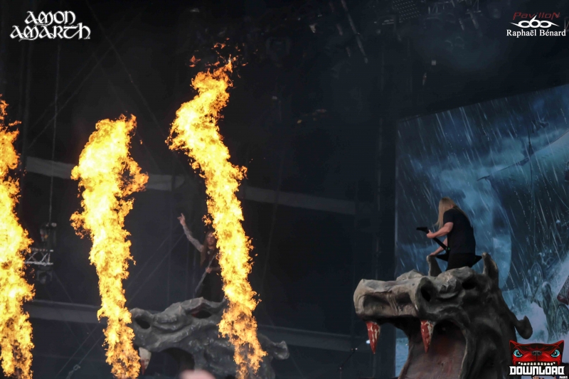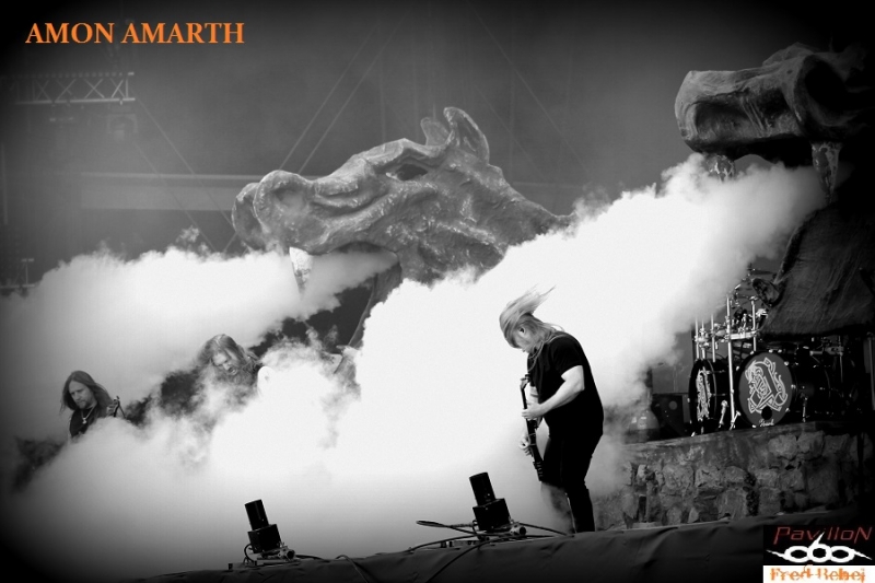 Nous zapperons les Japoniaiseries de ONE OK ROCK et surtout l'imposture BABY METAL produit marketing et de contrefaçon metal dont la prestation fut catastrophique et vraiment pas très professionnelle. Son pas terrible et voix stridentes et insupportables. Dommage pour les fans de cette formation... Nous partons donc pour écouter de la vraie musique sur la stage 2 avec AMON AMARTH. Nous ne serons pas déçus. Une prestation à la hauteur de la qualité du dernier album. Scénographie Viking avec tête de Drakkar, pyrotechnie et flammes sur fond toilé bleuté à l'image de la pochette du dernier opus. Très bon concert, efficace, direct et jouissif... (Raphaël et Frédéric)