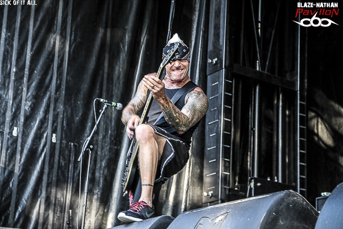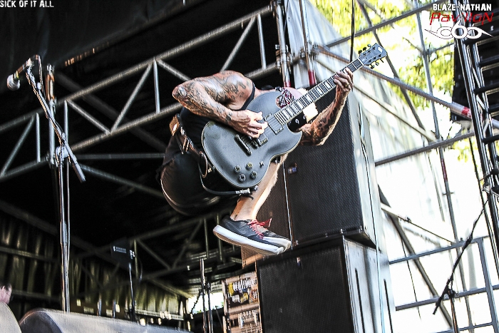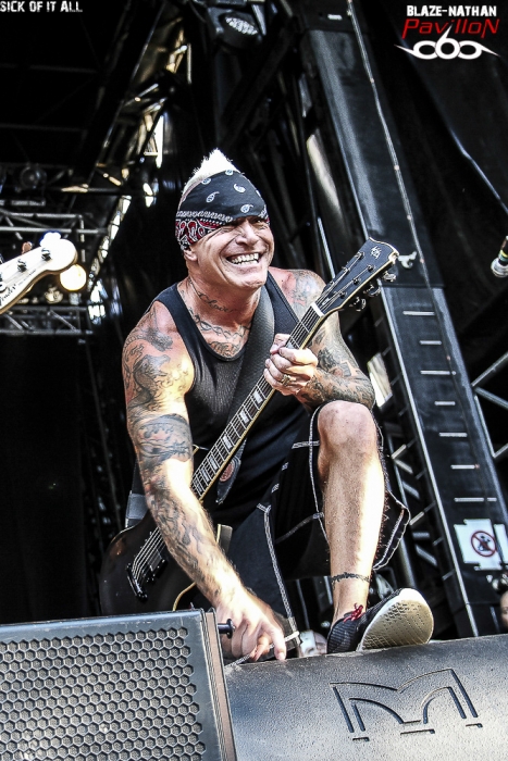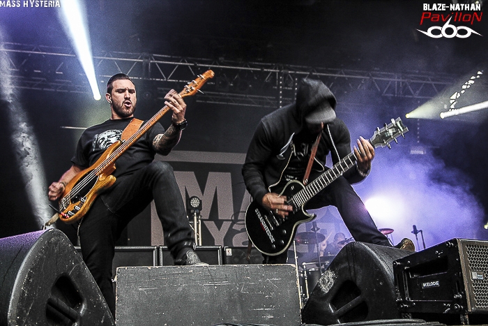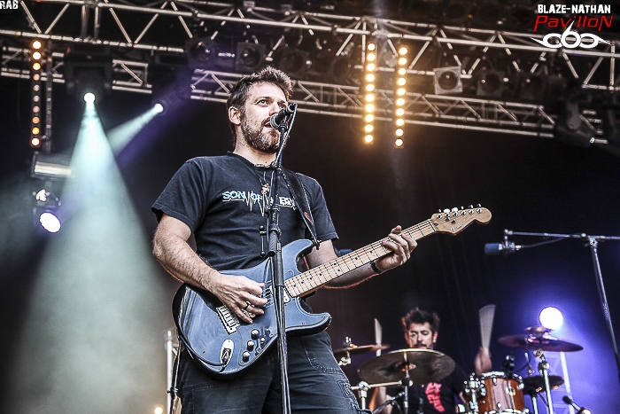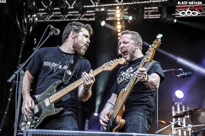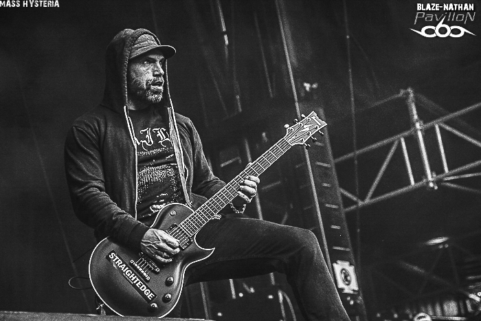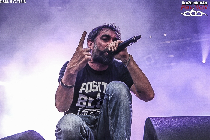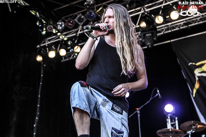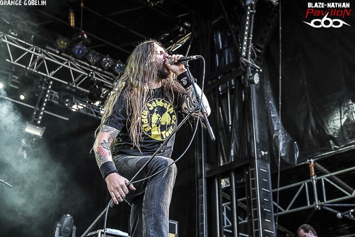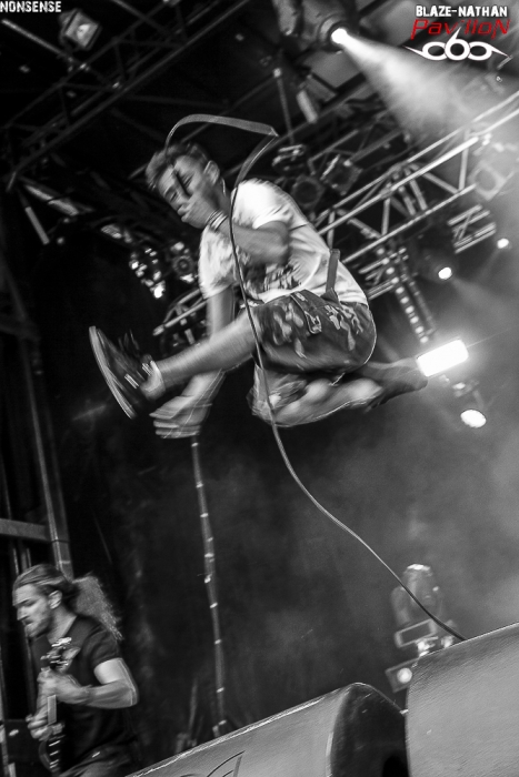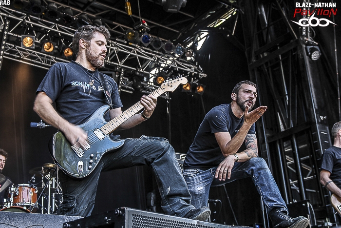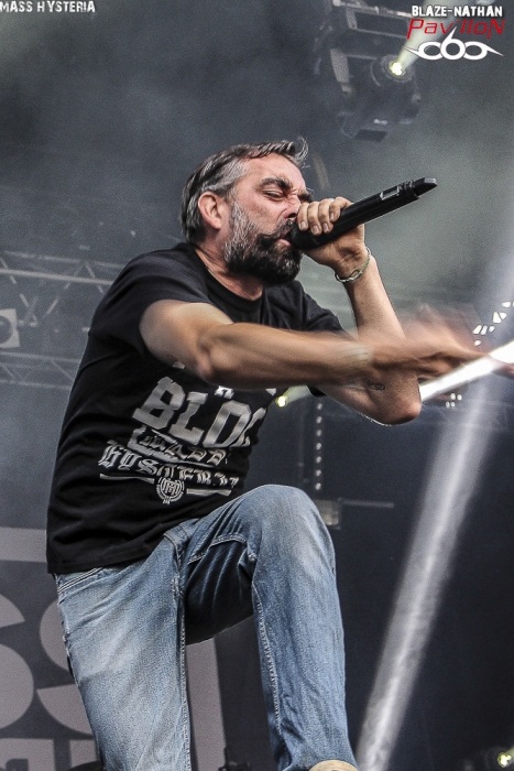 C’est NONSENSE qui a la lourde tâche d’ouvrir les hostilités à 11heures 25 du matin, mais contrairement à ce que l’on pourrait penser vu l’heure relativement matinanale pour un festival, le public sera déjà présent devant la scène. Ce qui va sûrement encourager le quintette Lyonnais de metal/prog, djent si vous voulez. Si habituellement dans la sphère metal le mot « prog » fait un peu peur au public, ici ce Samedi, le gang des lyonnais va donner un set original et non ennuyeux sachant, à l’aide de compositions variées et très mouvementées parfois attiser la curiosité des festivaliers en sachant doser technicité et groove dans un registre alambiqué où contretemps et polyrythmies font bon ménage. Mention bien pour ces locaux qui ne ménagent pas leur travail créatif depuis quelques années déjà. De plus, l’annonce de l’annulation du set d’INTERNAL SUFFERING leur permettra d’allonger leur prestation ce qui n’est pas fait pour nous déplaire. Comme ses prédécesseurs, RAB va pouvoir étoffer sa prestation où leur rock/stoner pourra s’exprimer un peu plus longtemps devant un public déjà conséquent donc. Et leur stoner va se révéler plutôt rock n’roll, dynamique, hard par moments Tout leur souris en cette fin de matinée avec un fan-club conséquent bien présent même si ils n’en ont « rien à branler ». Vulgaire peut-être, quoique, mais efficace en live le groupe sait envoyer les gros envois binaires à souhait pour notre plus grand plaisir, mention bien évidemment. Il est 14heures passés lorsque les vieux briscards d’ARTILLERY ouvrent le feu sur le public du Sylak. En effet, les danois armés d’un jeune chanteur depuis 2012 repartent au front avec du thrash d’anthologie. Ils repartent donc en guerre avec sous leur bras un nouveau « méfait » intitulé « penalty by perception » bien accueilli par la critique. Cette vieille formation (1982) n’a jamais rencontré le succès espéré, mais là c’est en quelque sorte la revanche avec toujours les frères Stûtzer originaux, Michael à la guitare et Morten à la basse. Et finalement, en live, le groupe s’en sort très bien en l’an 2016 comme aujourd’hui au Sylak avec son thrash mélodique et peaufiné. En milieu d’après-midi, ce sont les metalcoreux de Boston aux USA, UNEARTH qui vont en quelque sorte donner un coup de pied dans la fourmillière à l’aide d’un hardcore véloce truffé de lourdeurs metal à certains moments. L’an dernier lors du Metaldays en Slovénie le groupe avait pu se vanter d’avoir déclenché le plus grand circle-pit du festival. Qu’en sera-t-il aujourd’hui à St-Maurice-de-Gourdans ? Pas de problème ça sera « destroy » dès le départ et les « Sylakiens » vont suivre avec cependant un peu moins de dynamisme et de folie, mais bon ! Unearth, ce colosse du Massachussets sort donc son épingle du jeu depuis plus de 15 ans dans le milieu metalcore en introduisant des mélodies qui ne dénaturent pas les envois puissants, accrocheurs et par la même irrésistibles pour tout un chacun, on aime. Le soufflé va un peu retomber avec l’arrivée sur scène de SWALLOW THE SUN. Non pas que la qualité de la musique des Finlandais soit mise en cause, mais de là à passer d’un metalcore échevelé à un doom/death pesant ça fait un drôle d’effet n’est-ce pas ! Et pourtant ces gens du Nord se sont fait un nom dans le style depuis 16 ans avec, outre des prestation live attendues, la sortie six albums appréciés. Au menu des envois mélancoliques et froids avec alternance de chant clair, « growls » et narrations, et cela durant 45minutes. Le public est resté bien attentif devant la scène, appréciant (ou pas) ce doom caverneux et théatral d’excellente facture dans le genre il faut le reconnaitre. Les Britishes d’ORANGE GOBLIN, véritables légendes du Stoner, vont prendre le relais vers 18heures devant un public qui attendais de pied ferme leur prestation soit dit en passant. Vingt ans au compteur pour ce groupe culte emmené par le charismatique Ben Ward et sa voix particulière. Avec son stoner enfumé (pléonasme ?), ses envois lourds où la basse se fait énorme, les Londoniens nous tiennent dans le creux de leurs mains durant 45 minutes avec des envois « dirty » aux dérapages hard-rock plombé, et figurez-vous que l’on aime ça. Orange Goblin au Sylak avec des fans inconditionnels devant la barrière, ce fut géant tout simplement. La soirée va maintenant prendre un virage assez radical avec la venue de 4 groupes maitres dans l’art de transcender la foule à l’aide de shows très chauds et bien agités, alors « are you ready ? » On commence avec les légendaires SICK OF IT ALL qui arborent un backdrop avec inscrit « Sick of it All – 30 ans ». Et oui, ces vétérans du hardcore New-Yorkais nous balancent en pleine face un hardcore brutal et inspiré qui fait un clin d’œil au métal et à l’urgence du punk aussi. Malgré le poids des ans, l’énergie sur scène est toujours au rendez-vous rien qu’à voir les jumps légendaires du guitariste Pete Koller notamment. Sick of It All reste immuable donc dans ses prestations scéniques, un groupe qui n’a rien lâché au fil des ans, sans concession si vous voulez avec à son actif une discographie longue comme le bras et des concerts marathon dans le monde entier. Alors « good looking out » les gars Le stade ReGis Perrin est noir de monde pour ce concert d’anthologie, normal me dire-vous. Sick Of It All nous a encore époustouflé ce soir, et qu’est-ce que c’est bon, long live punk-hardcore ! Il est maintenant 20heures 45 et Mouss de MASS HYSTERIA va nous dire « ne laissez pas la haine s’installer, soyez positifs à bloc ! ». OK mec nous allons suivre ce conseil avec ce concert qui va prendre au fil des minutes des allures d’émeute avec un public littéralement déchaîné. « On va vous montrer ce qu’est le metal français qu’i